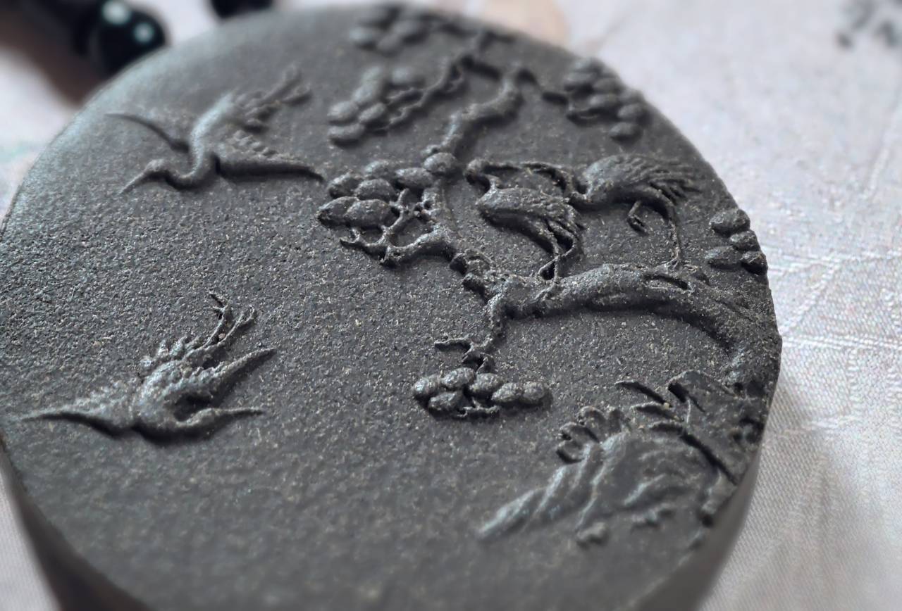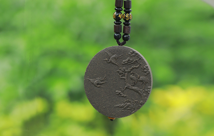 圆形香牌,以浅浮雕的形式巧妙勾勒出一幅“松鹤延年”的图案。