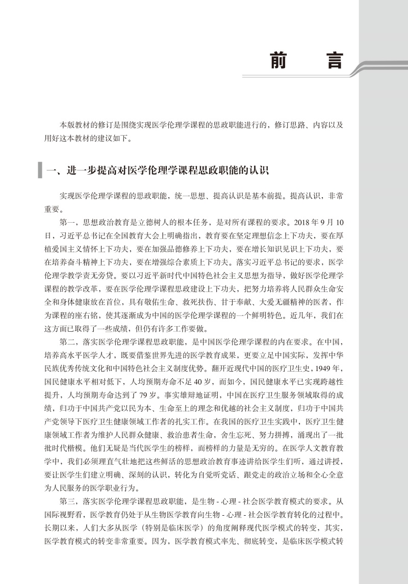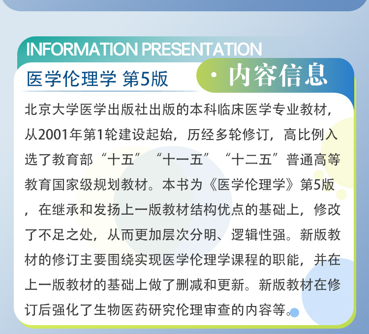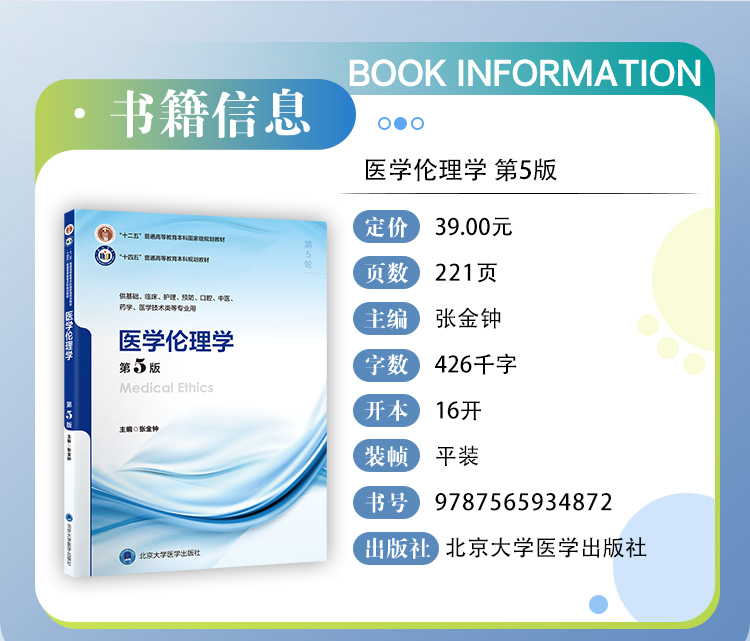 北京大学医学出版社出版的本科临床医学专业教材,从2001年第1轮建设起始,历经多轮修订,高比例入选了教育部“十五”“十一五”“十二五”普通高等教育国家级规划教材。本书为《医学伦理学》第5版,在继承和发扬上一版教材结构优点的基础上,修改了不足之处,从而更加层次分明、逻辑性强。新版教材的修订主要围绕实现医学伦理学课程的职能,并在上一版教材的基础上做了删减和更新。新版教材在修订后强化了生物医药研究伦理审查的内容等。