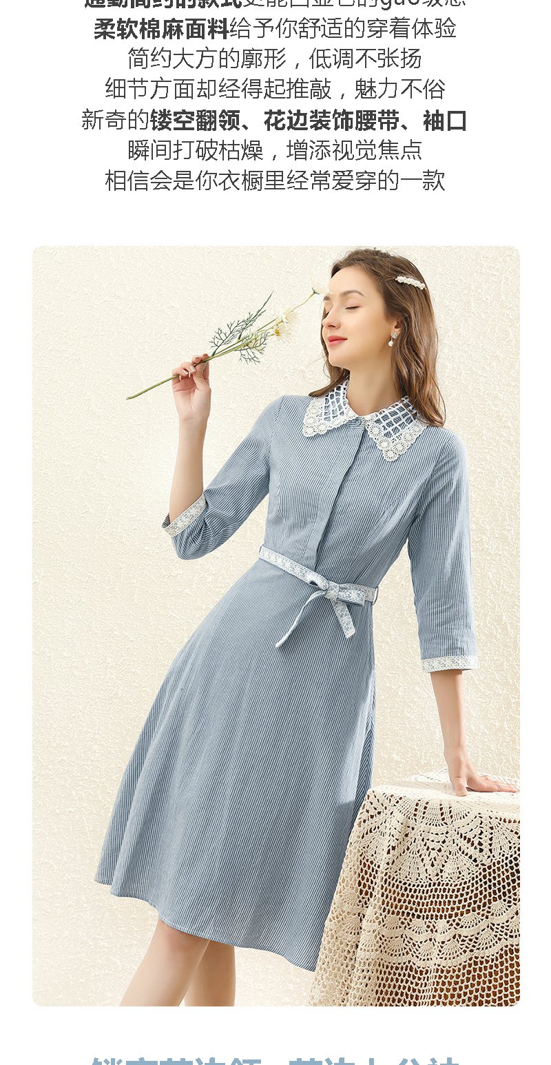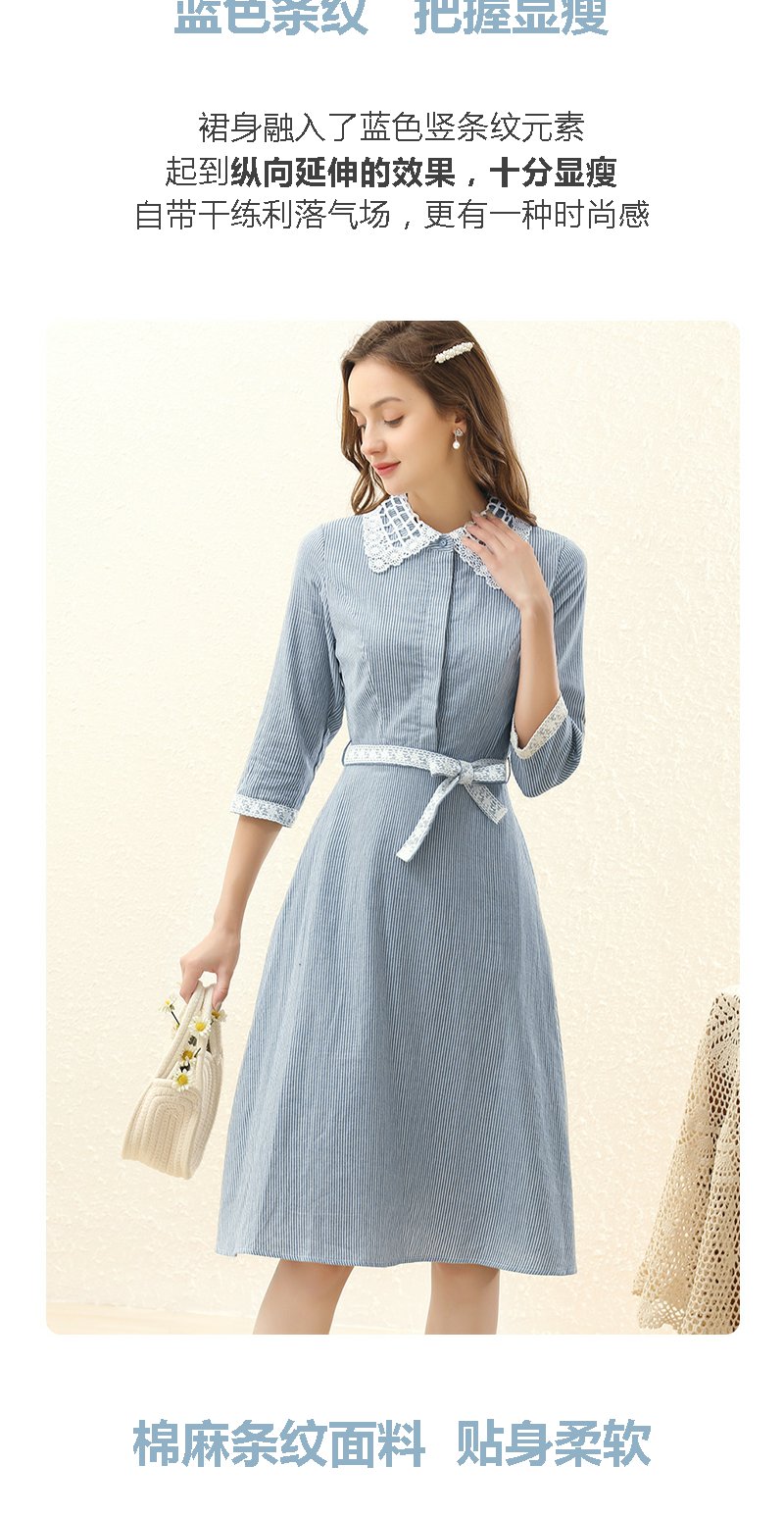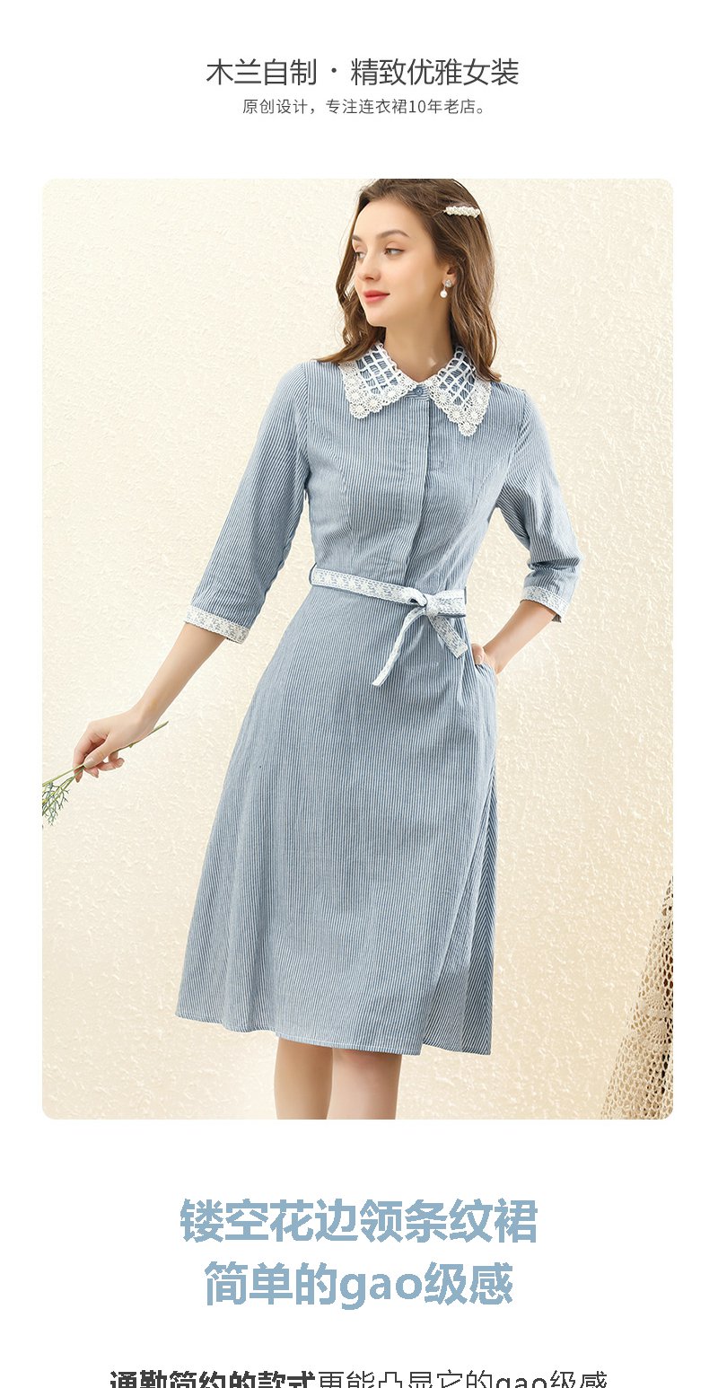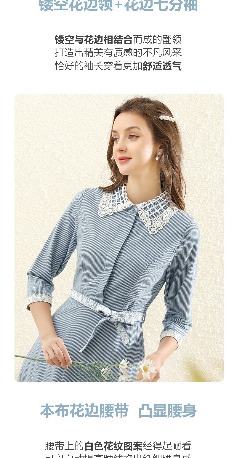 勿忘花蓝色镂空翻领条纹气质连衣裙2025女装秋季新款修身显瘦裙子