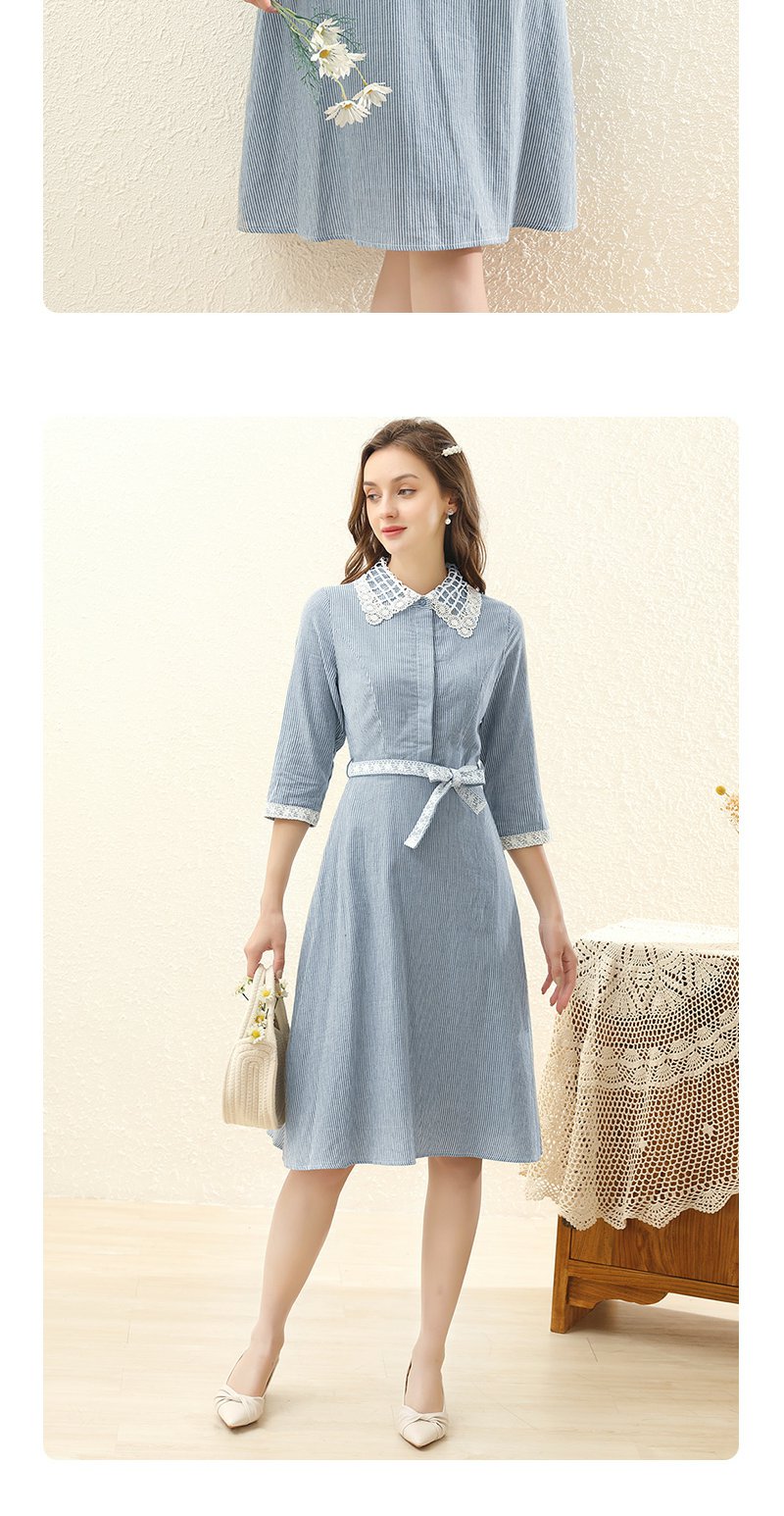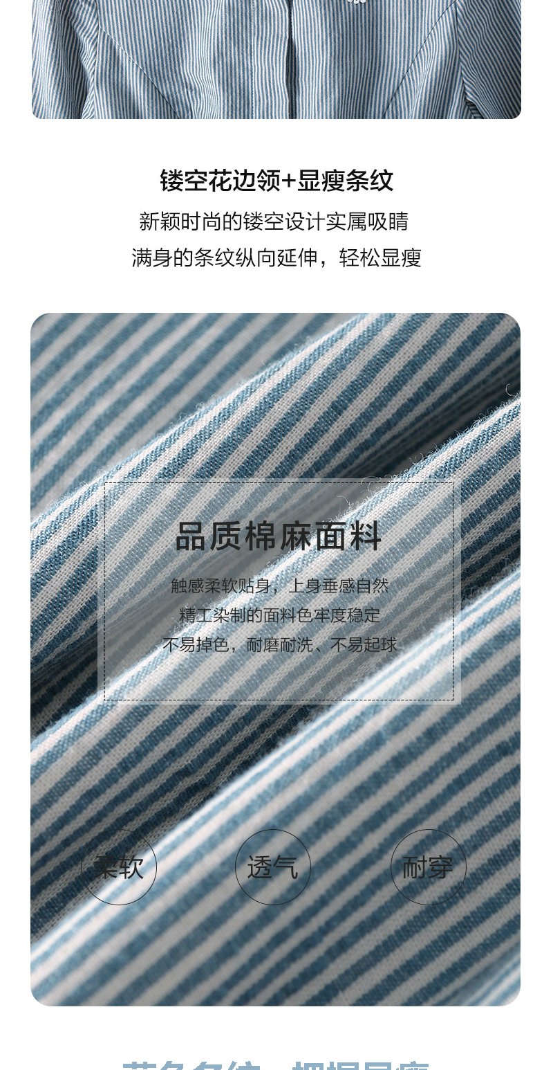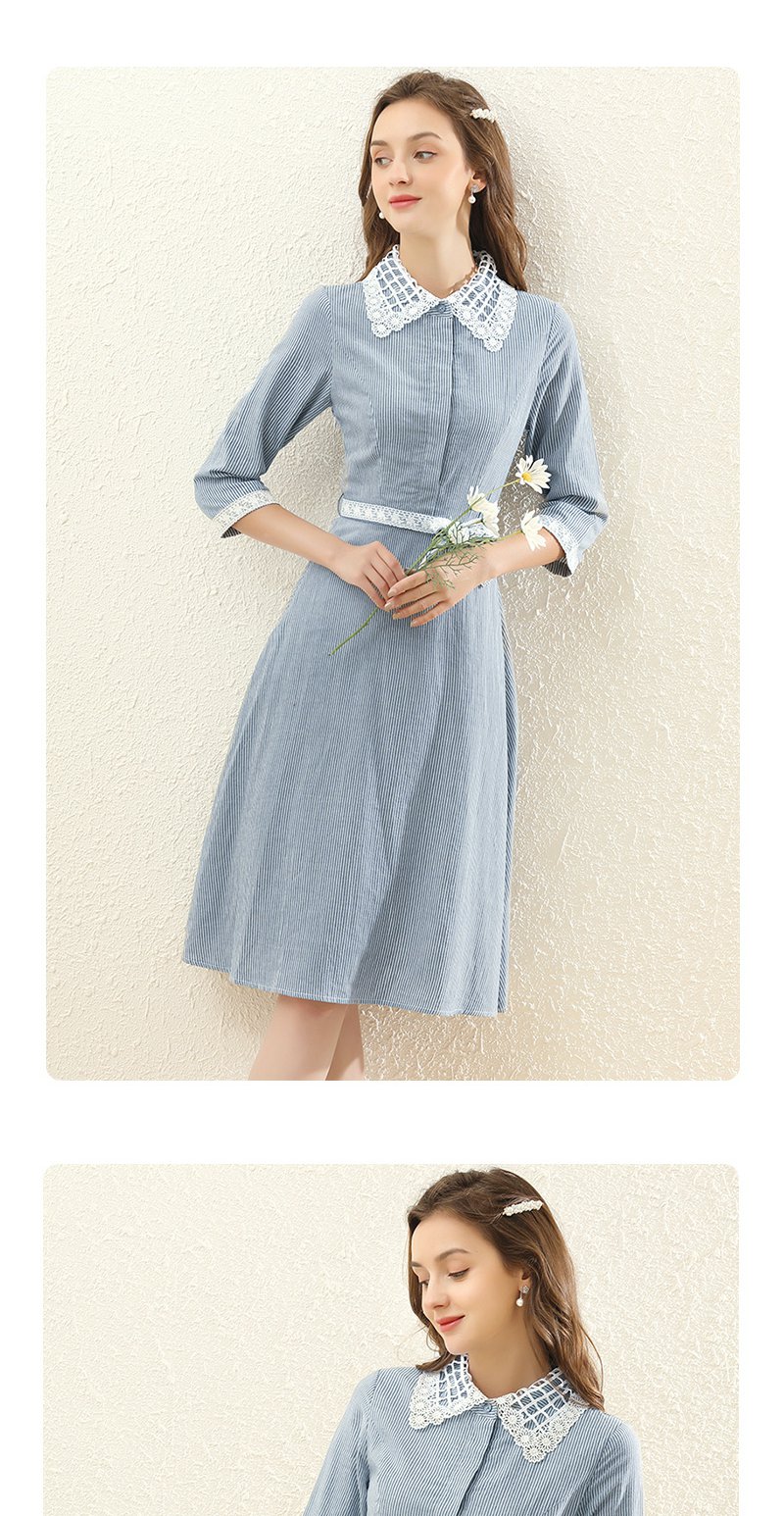 勿忘花蓝色镂空翻领条纹气质连衣裙2025女装秋季新款修身显瘦裙子