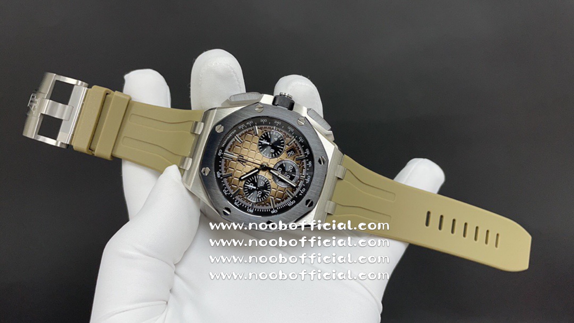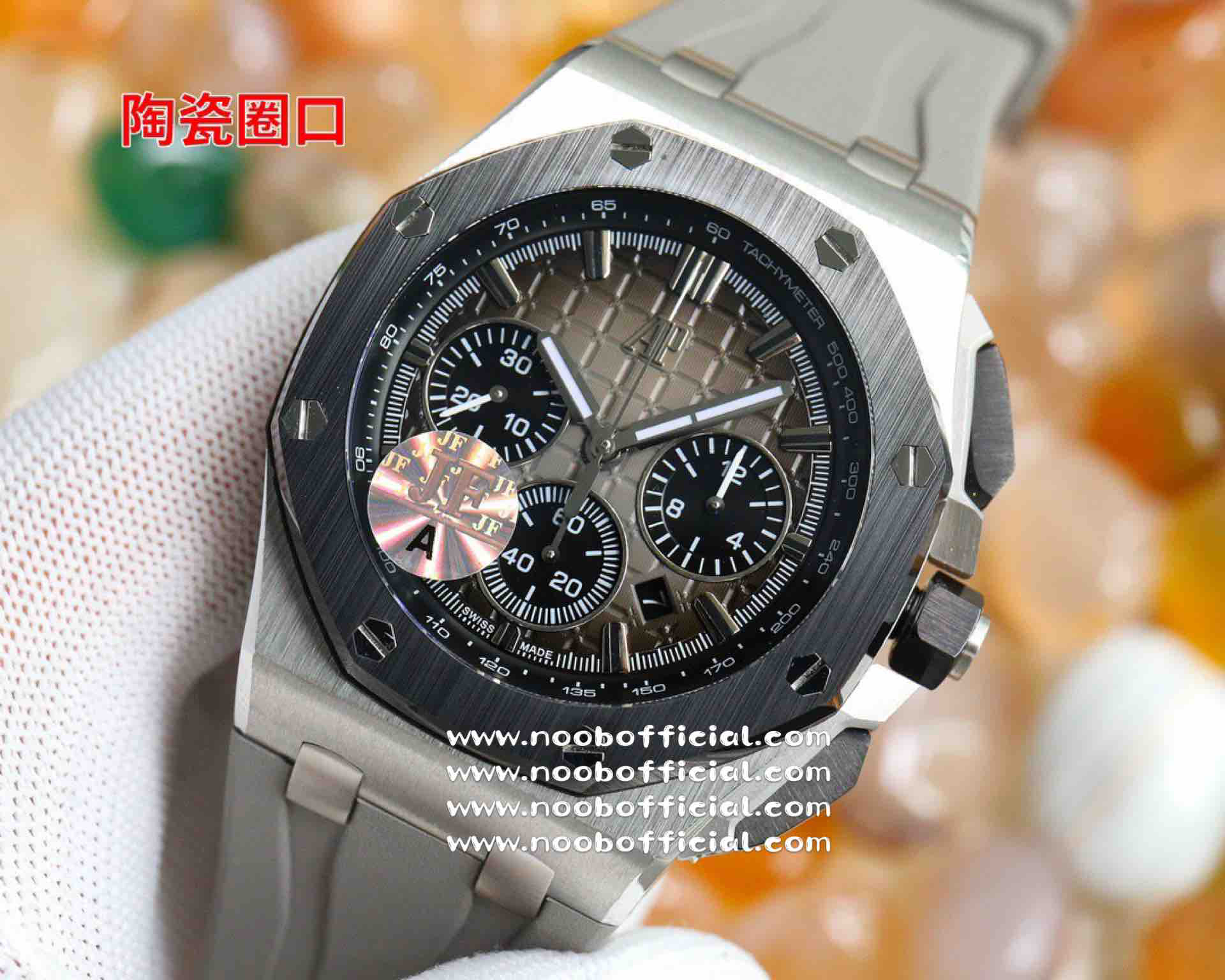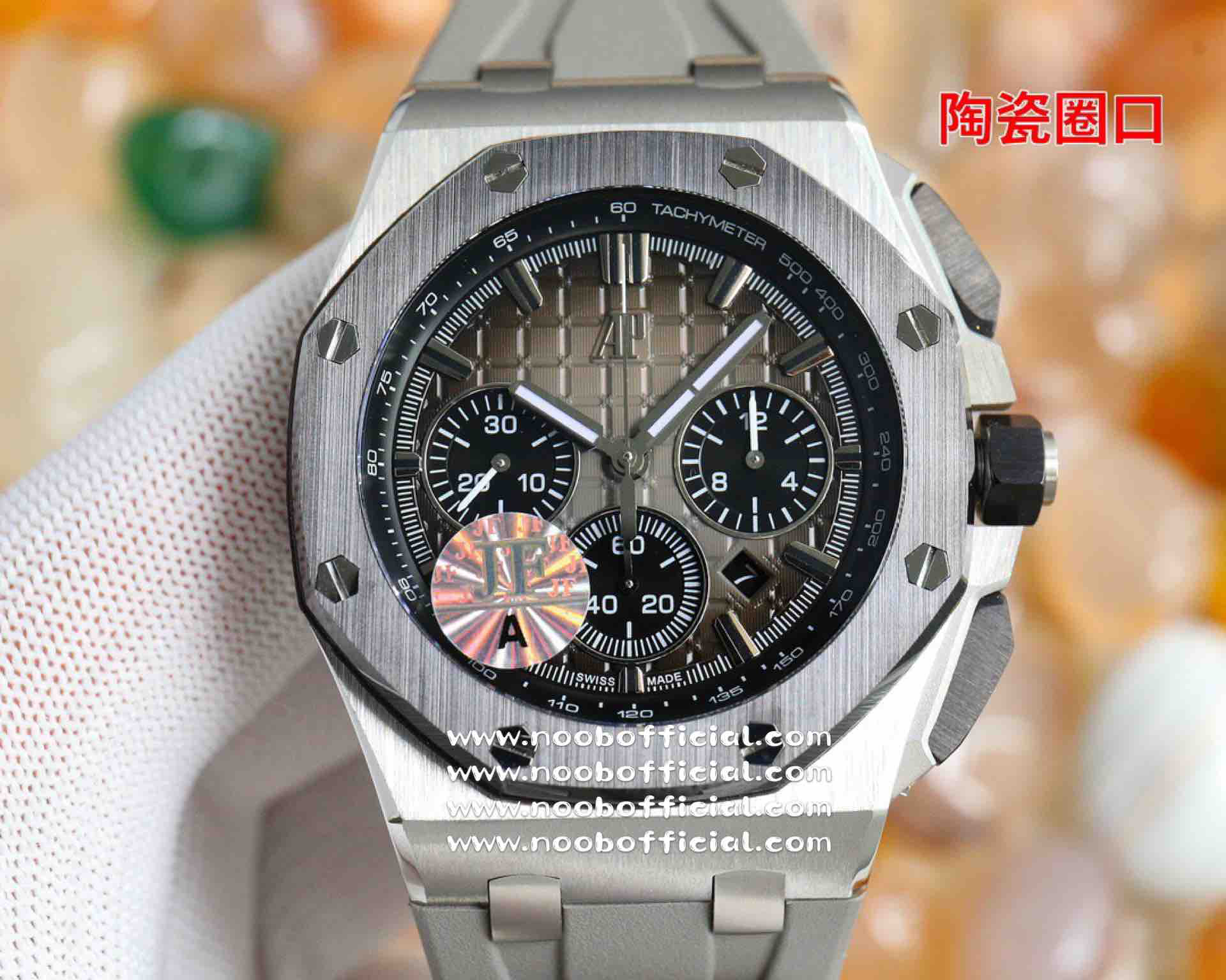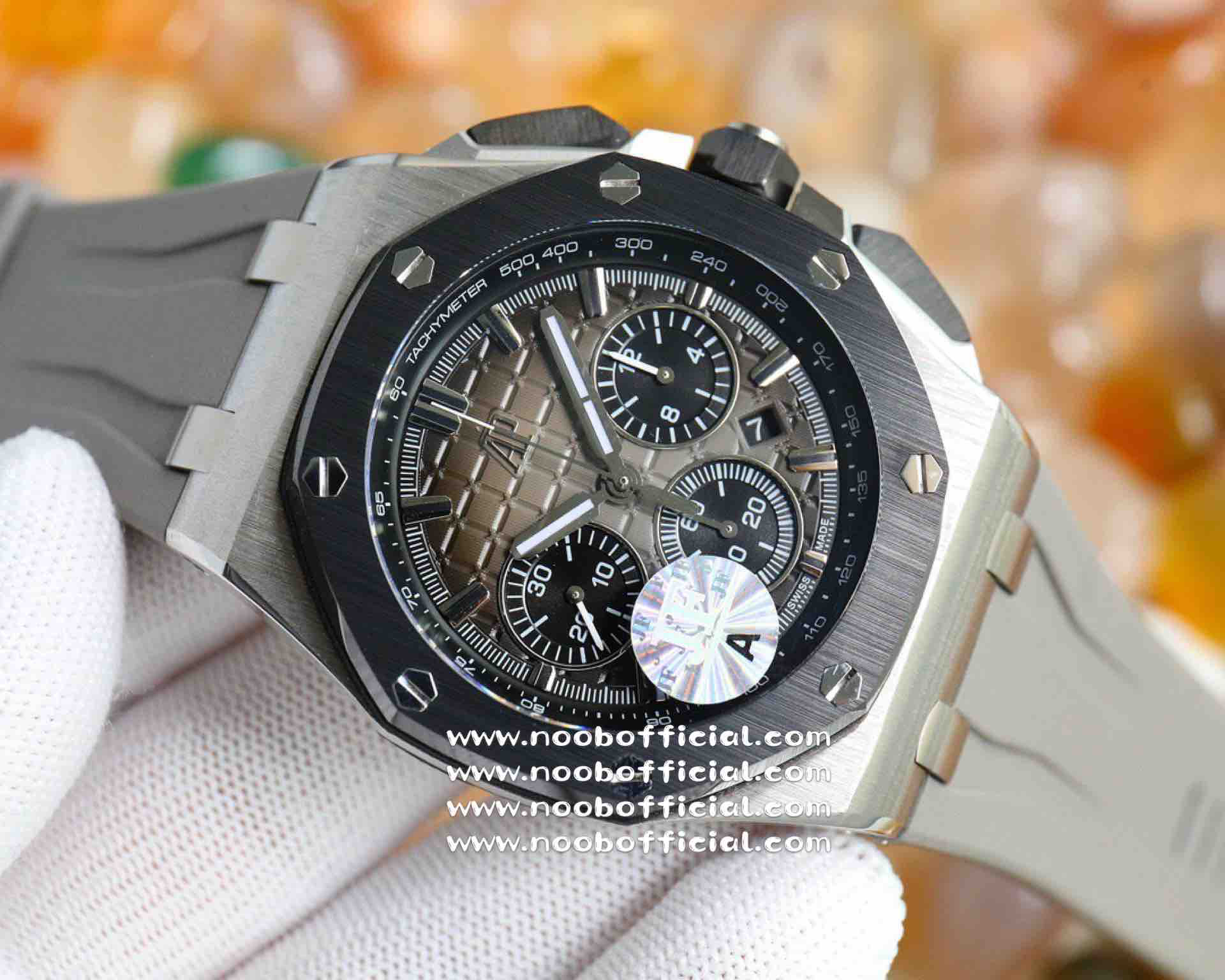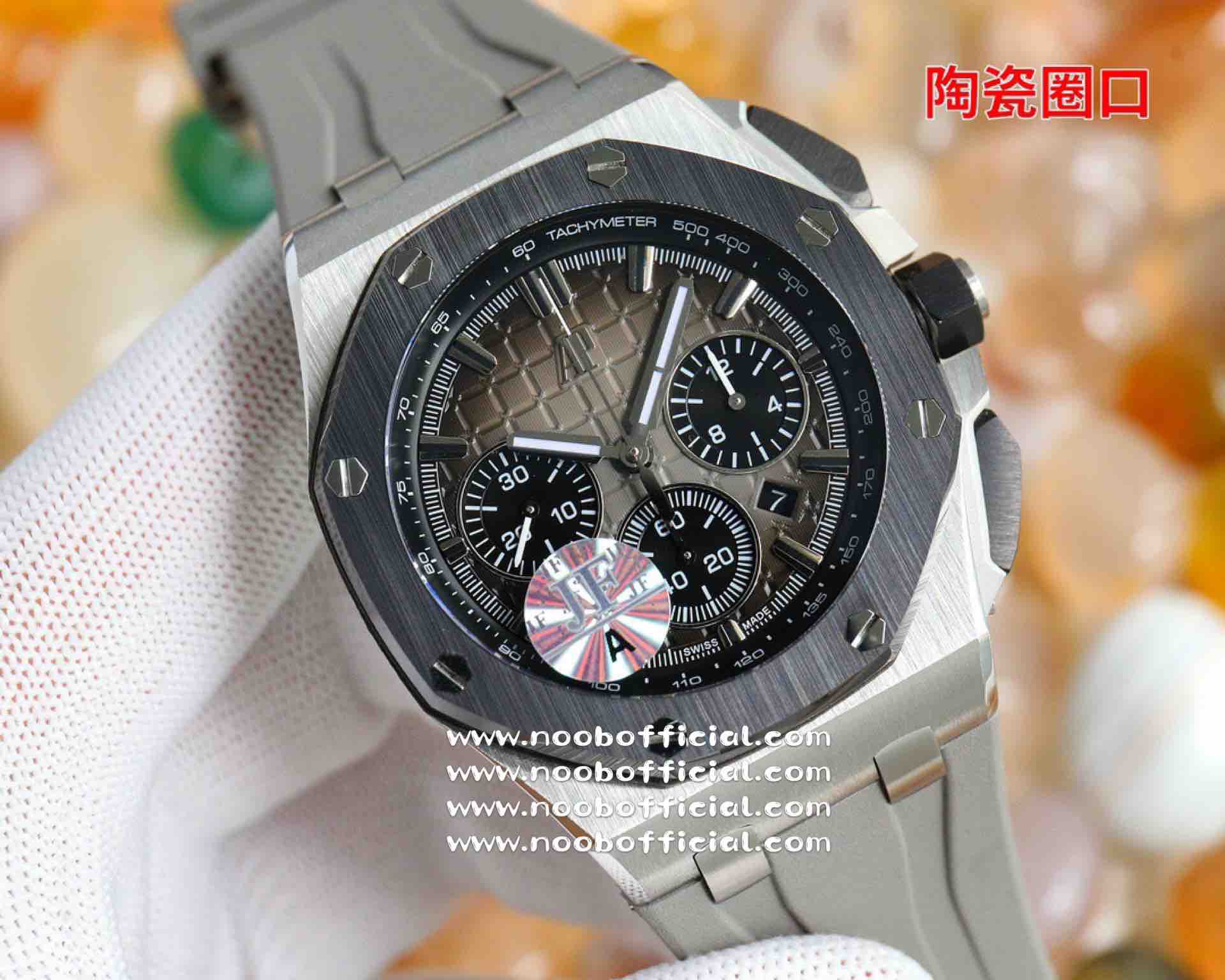 NOOB厂独家开发爱彼皇家橡树离岸系列26420,购入原装1.1打造,全表采用德国最新cnc技术,每个细节都同步原装,表带表扣通用原装技术实现快拆技术可同原装互换,字面采用最新款纵横格纹面,上手霸气豪华,机芯使用最强亚洲版定制的机芯外观复刻原装4401机芯实现正面反面与原装难分雌雄。首批数量有限先到先得。首批颜色分别为,1,玫瑰金熊猫眼,2,最火沙漠黄烟熏盘,3,经典蓝盘白眼,4灰盘蓝眼睛,5,经典百搭白熊猫。