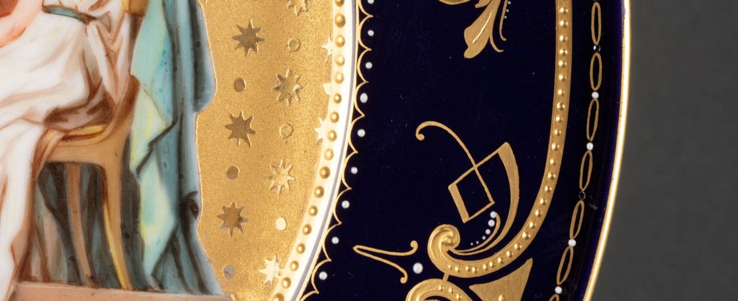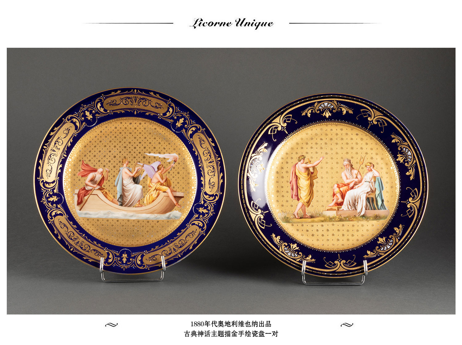 独角鹿西洋古董瓷器奥地利维也纳古典神话主题描⾦⼿绘瓷盘⼀对