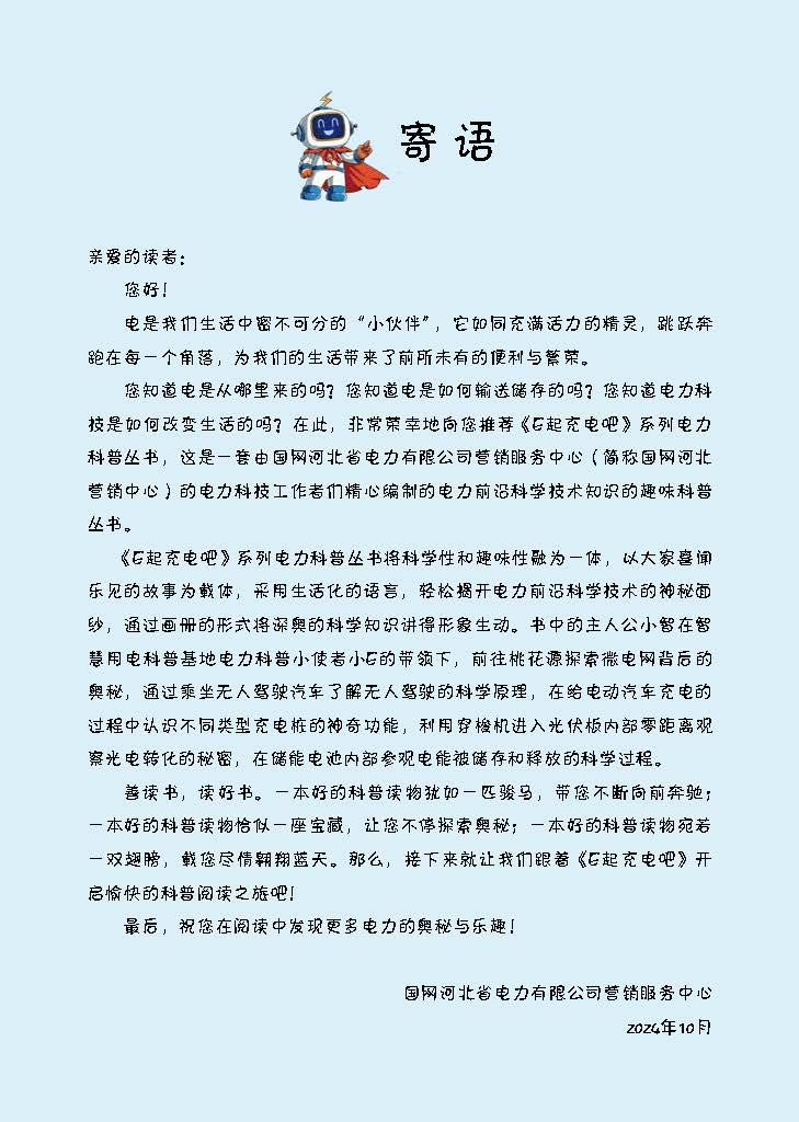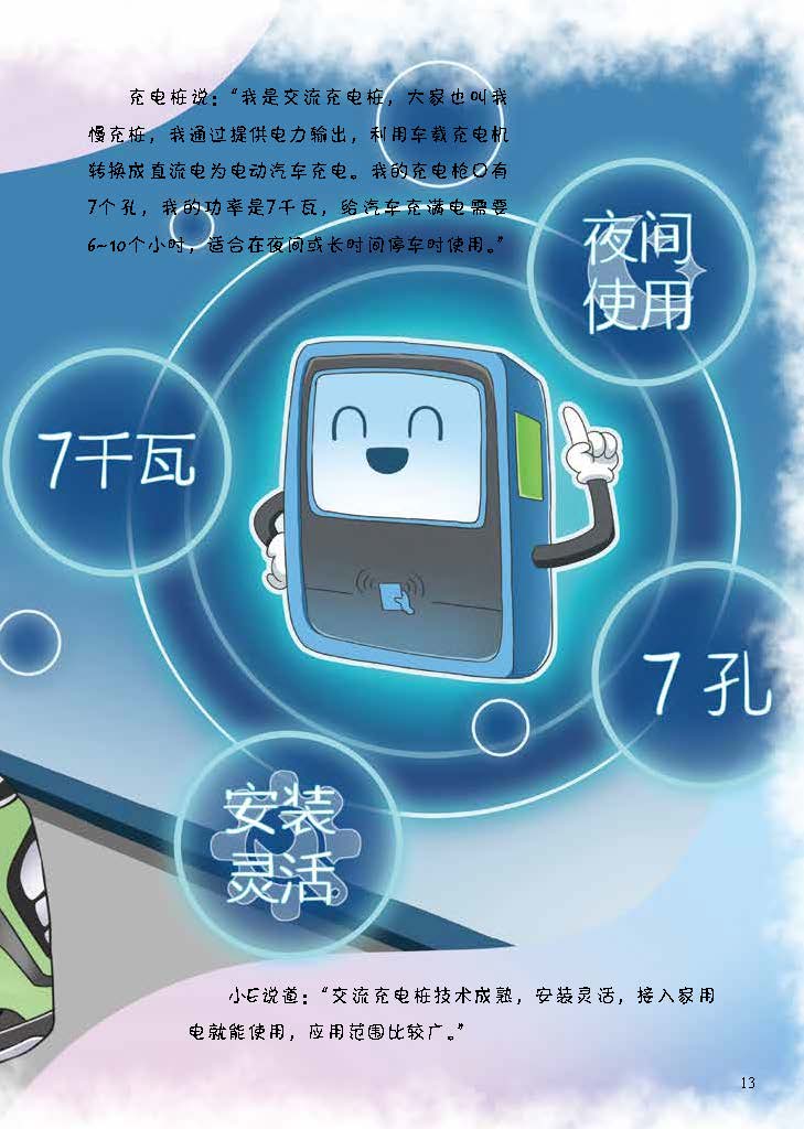 围绕电动汽车充电桩,通过给电动汽车找桩充电的故事,利用人物间的对话问答,对交流充电桩、直流充电桩、V2G充电桩、无线充电桩等不同类型充电桩的工作原理、使用场景、充电时长等基础知识进行科普讲解,提高社会公众对充电桩的认知,便于公众更好的享受充电桩提供的安全、便捷、智慧、高效的充电服务,传播绿色出行低碳环保的生活理念。书中穿插相关知识介绍,比如充电桩的类型、充电桩的工作原理、充电桩的充电方式、如何区分快慢充等。