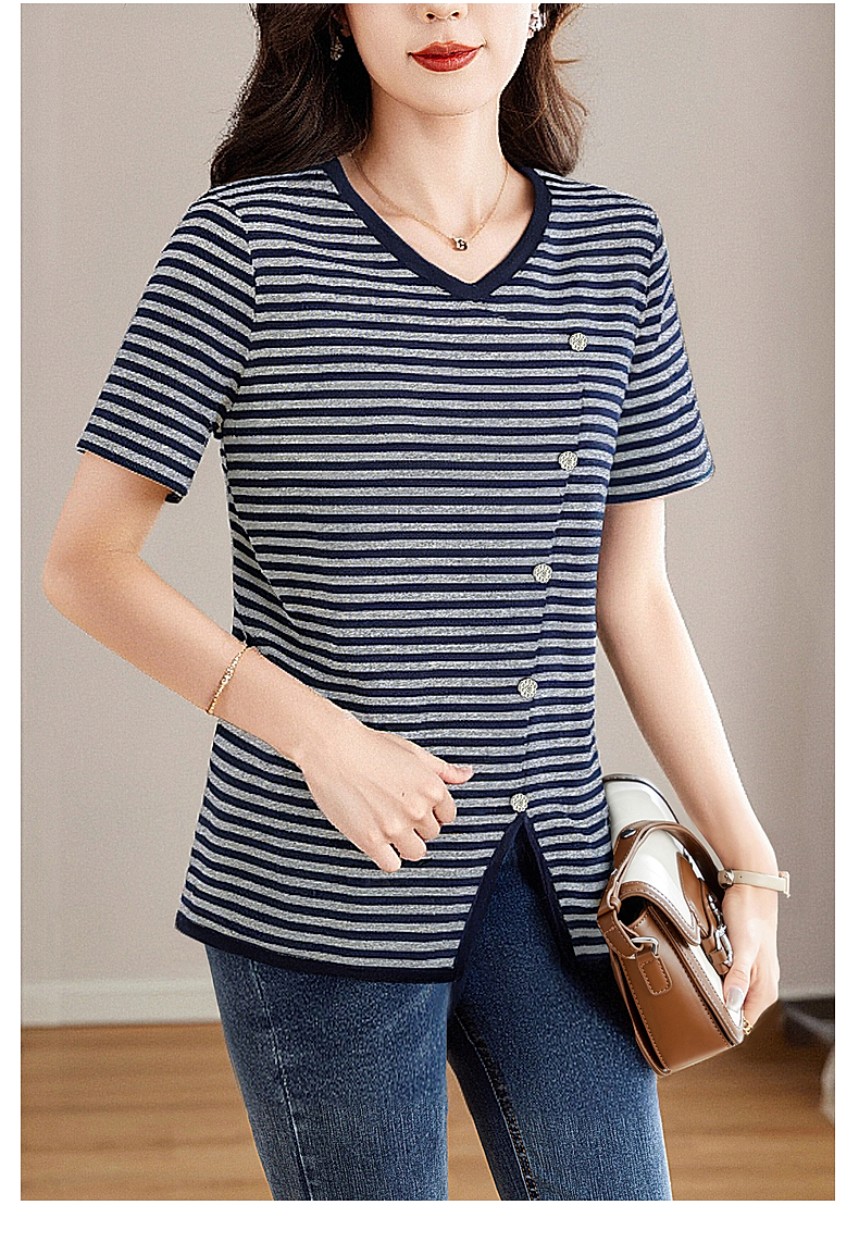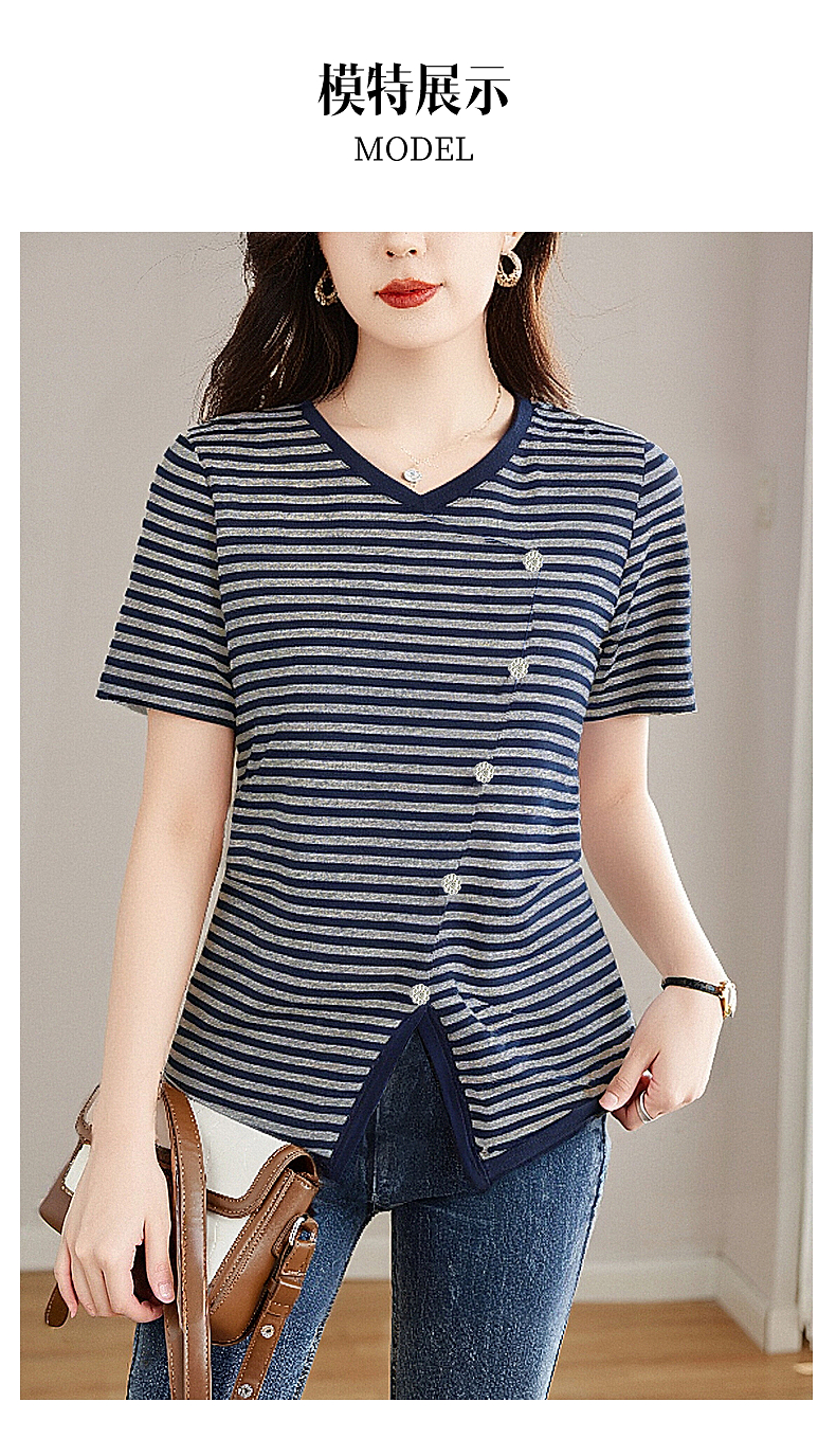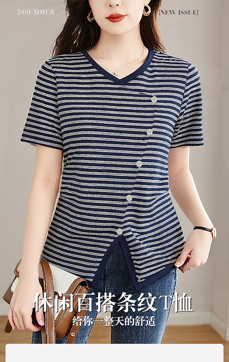 休闲短袖t恤女士宽松大码显瘦V领上衣春夏季2025年新款条纹打底衫