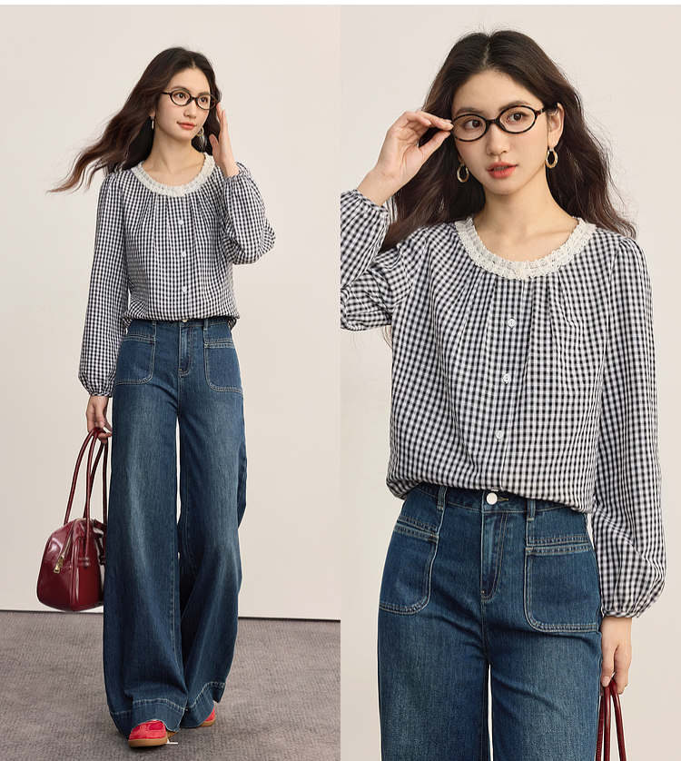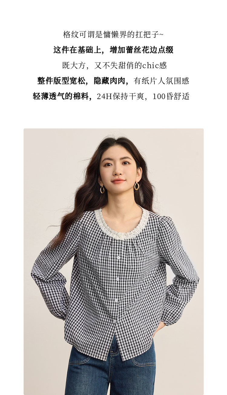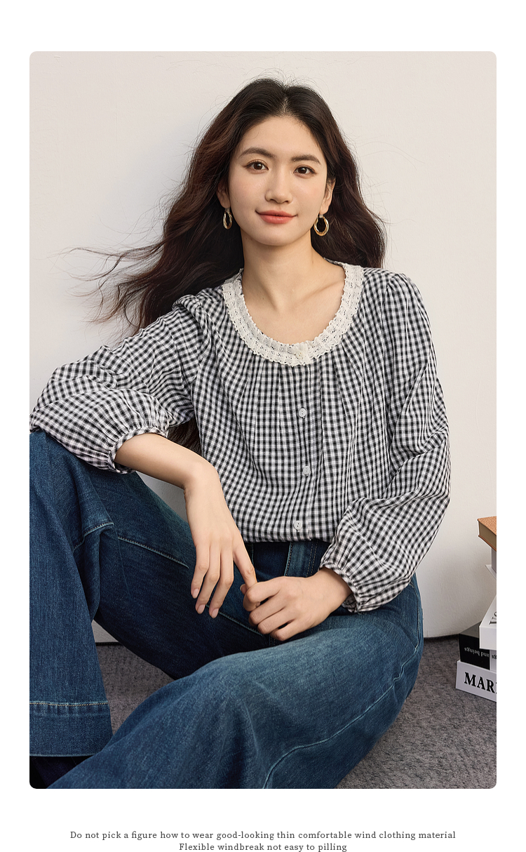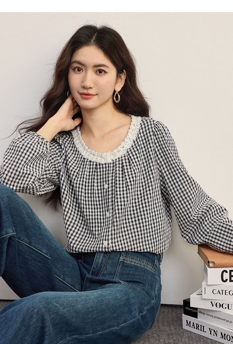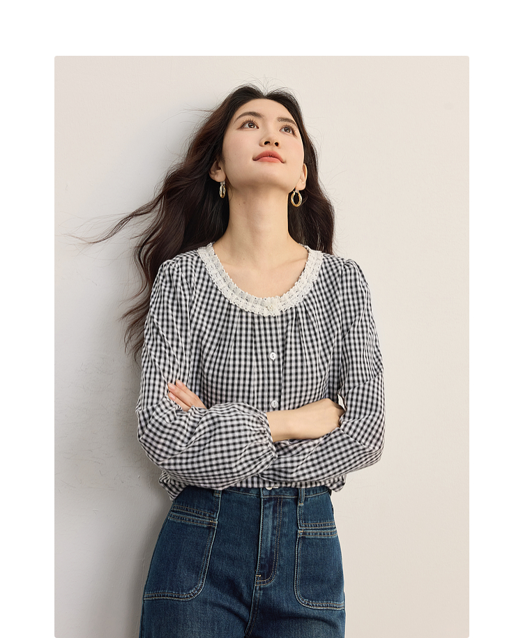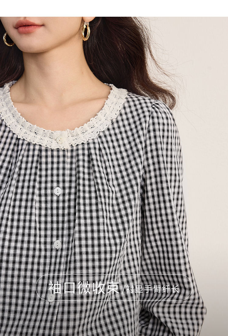 【08/19新品】熙世界法式格子衬衫女长袖2025秋季新款文艺复古蕾丝花边圆领上衣
