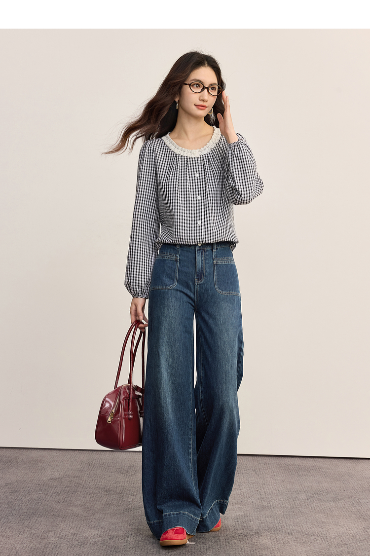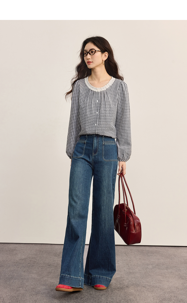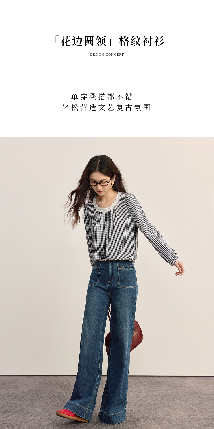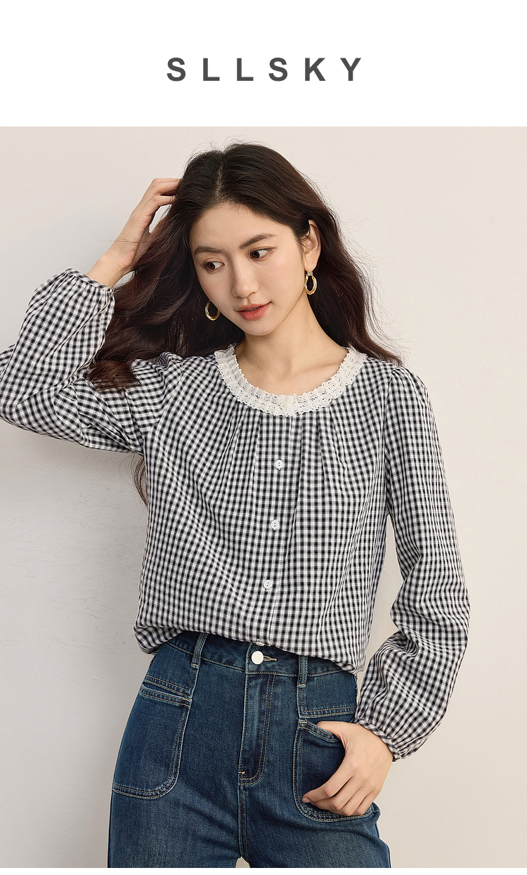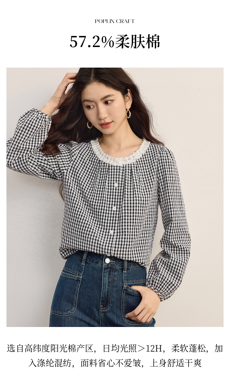 【08/19新品】熙世界法式格子衬衫女长袖2025秋季新款文艺复古蕾丝花边圆领上衣