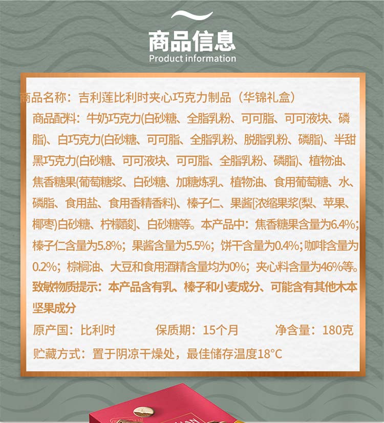 吉利莲比利时集锦夹心巧克力制品华锦礼盒180g/045534 搭配8种甄选口味