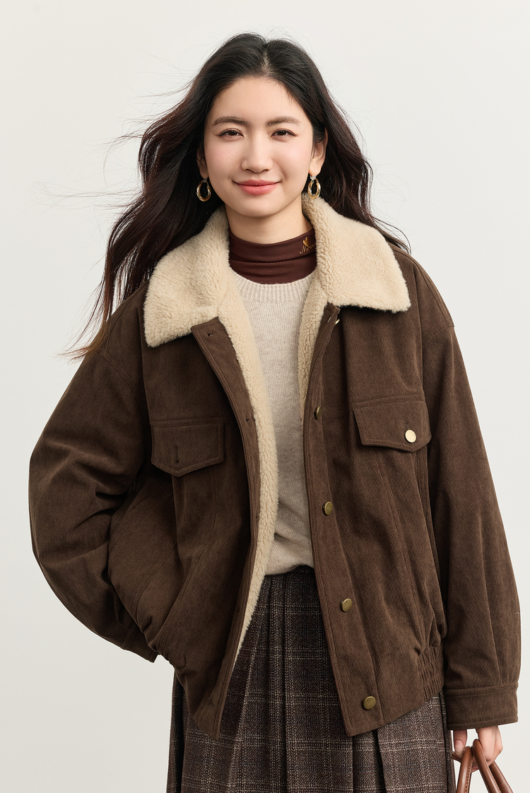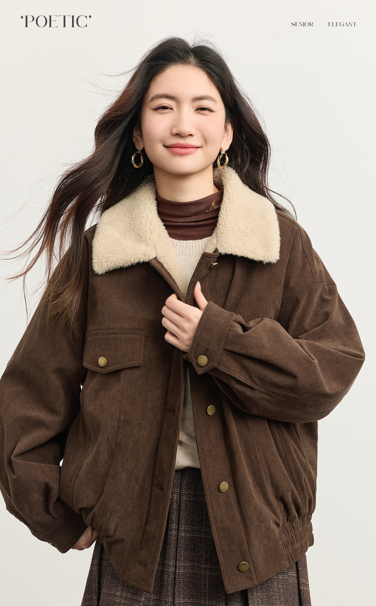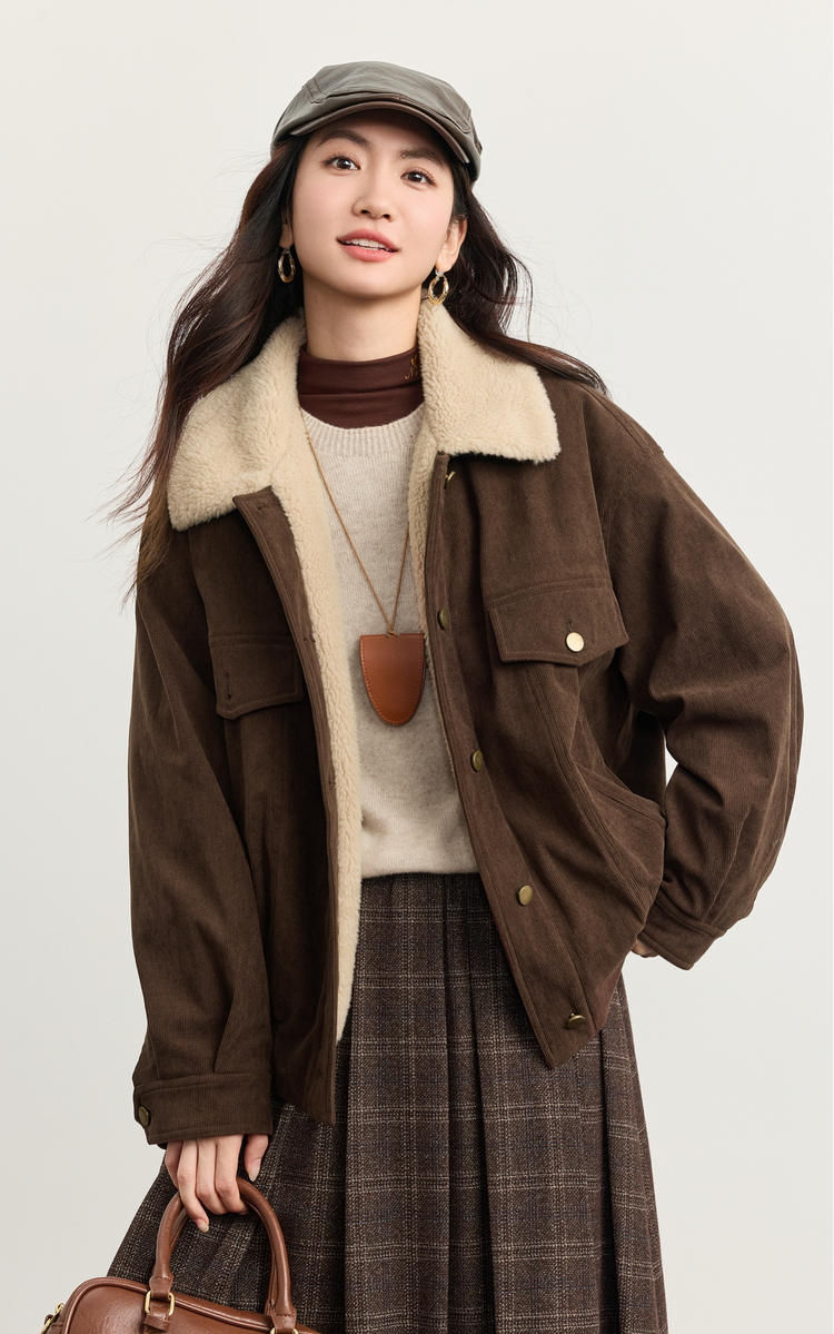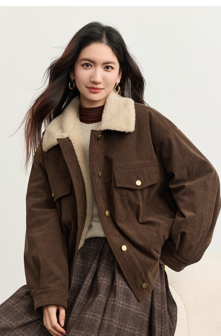 【11/5新品】熙世界灯芯绒毛领短外套女加绒加厚复古美拉德风夹克上衣2025冬季
