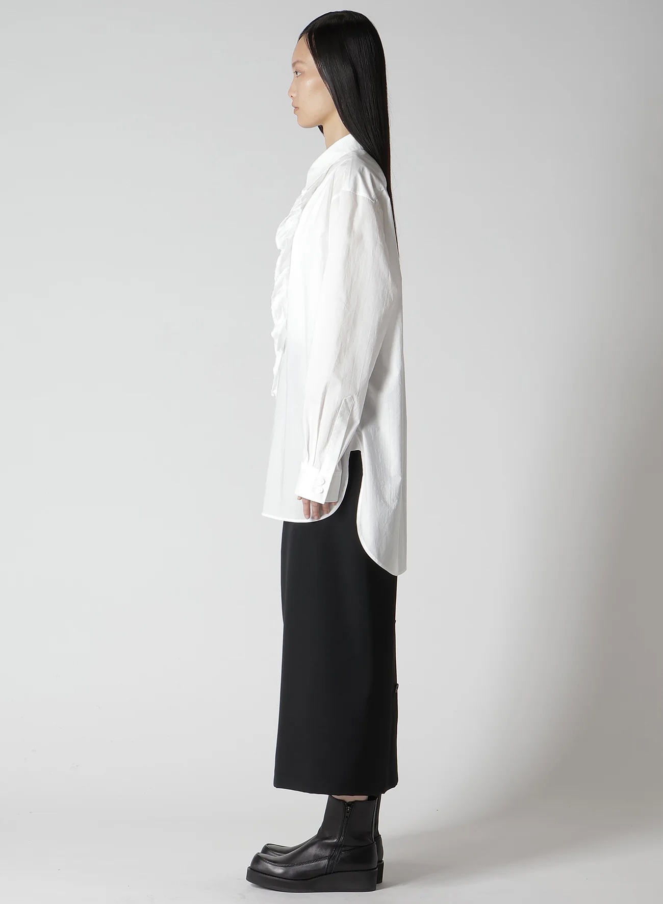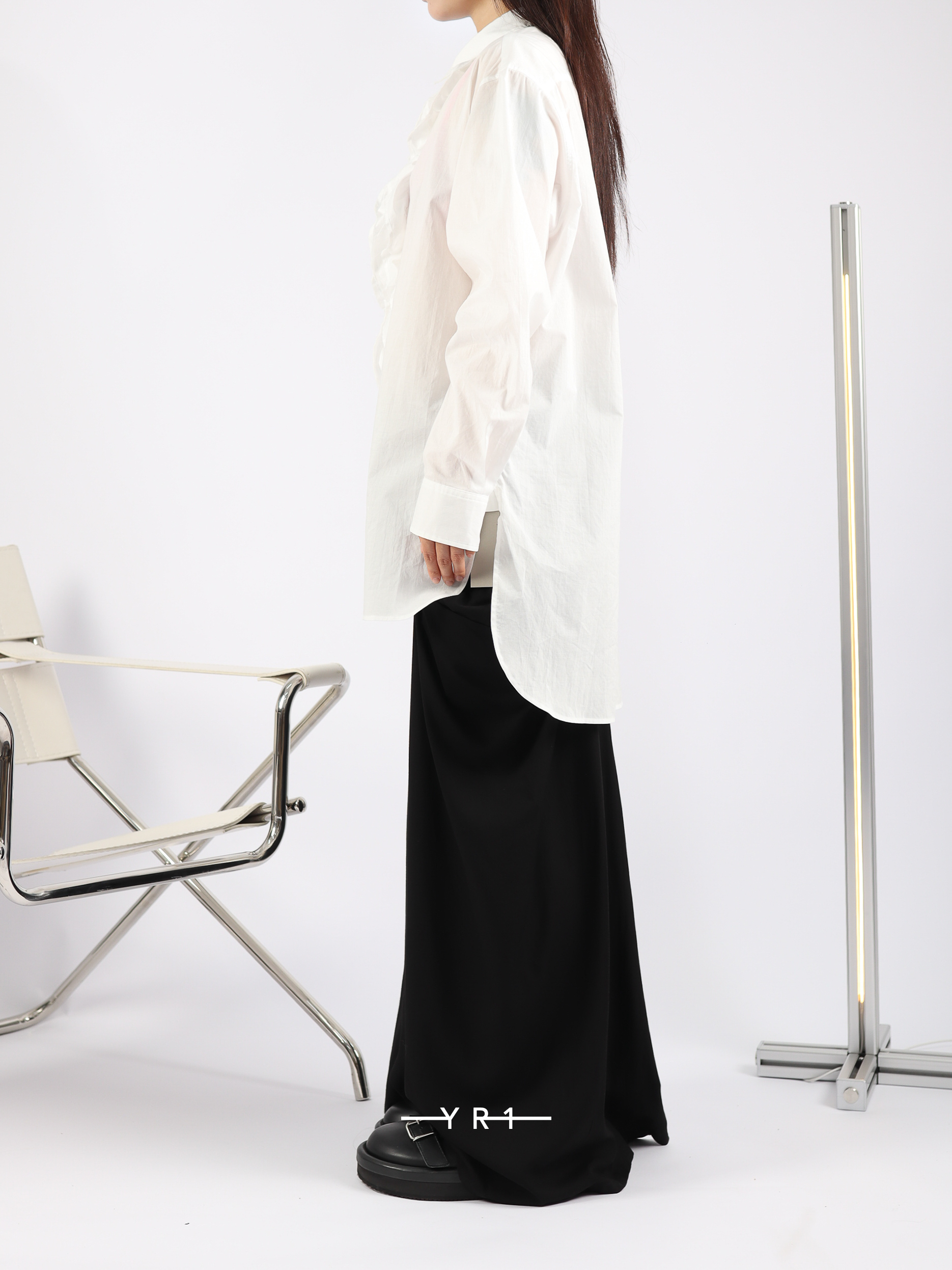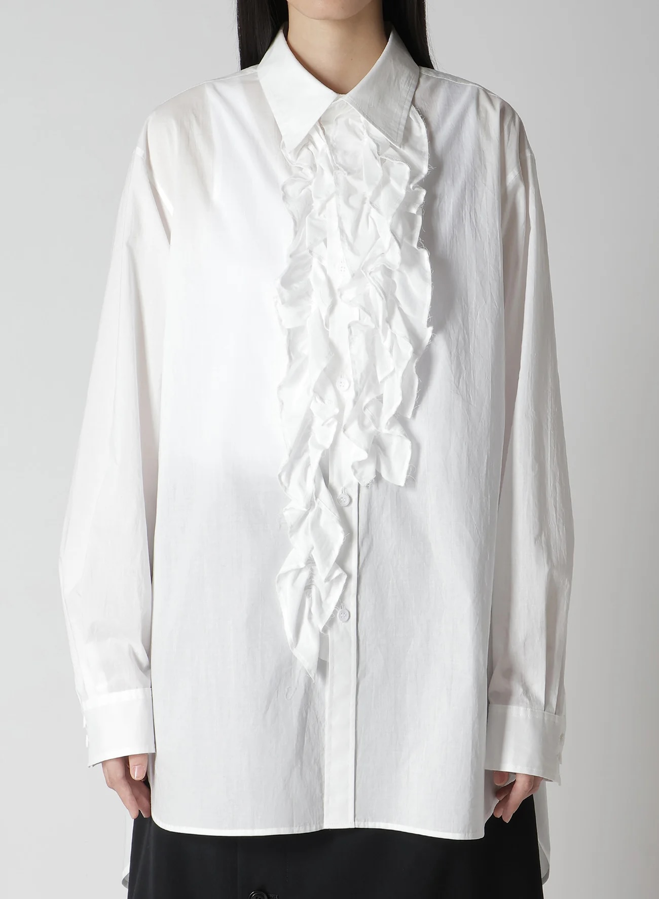 这款衬衫胸前饰有醒目的荷叶边,采用珍稀的超长埃及棉精制而成,质地柔软细腻。它与夹克完美搭配,使荷叶边优雅地凸显出来。面料的微妙光泽确保了其高档的外观,却又不会显得过于休闲,适合各种风格。