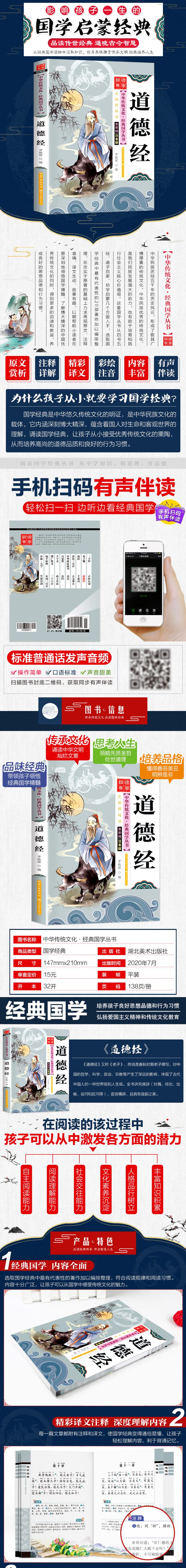 《道德经》又称《老子》,传说是春秋时期老子撰写,对中国的哲学、科学、政治、宗教等产生了深远的影响,体现了古代中国人的一种世界观和人生观。全书讲究修辞(对偶、排比、比喻、设问和反问等),语言精辟,且具有音韵之美。