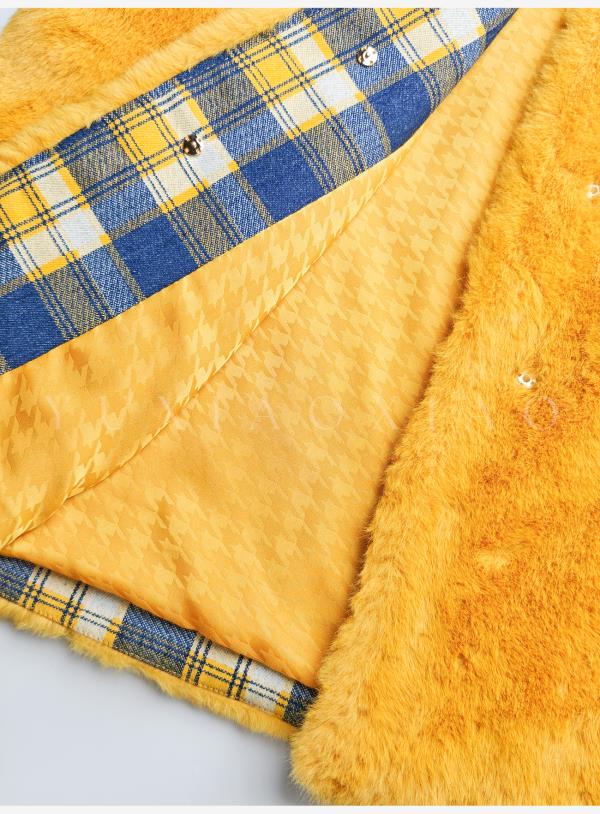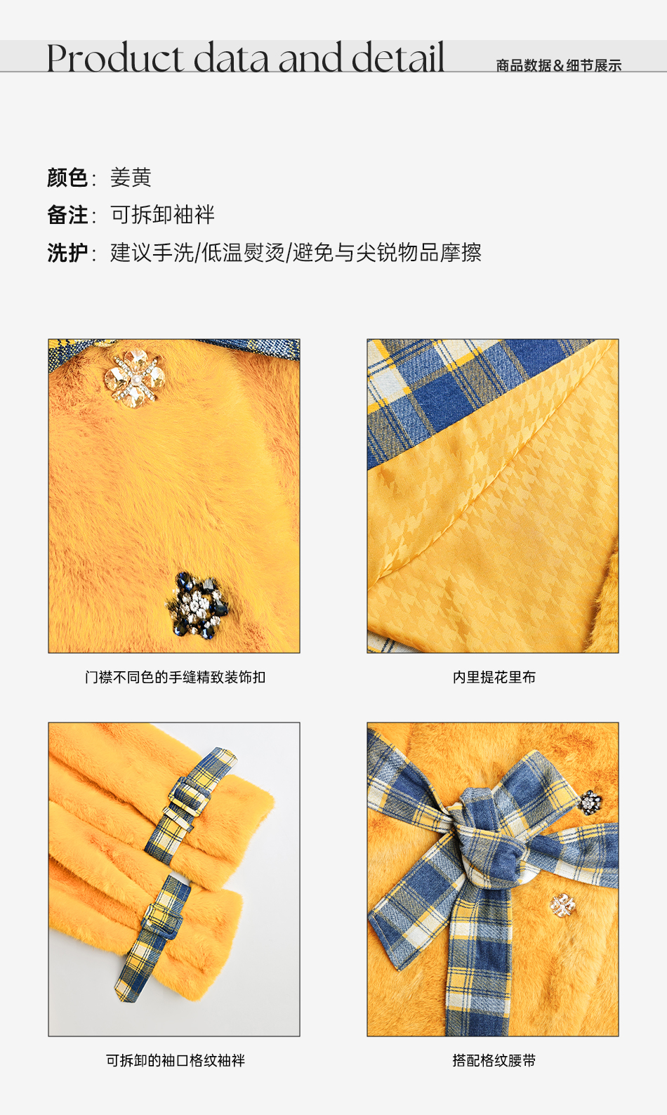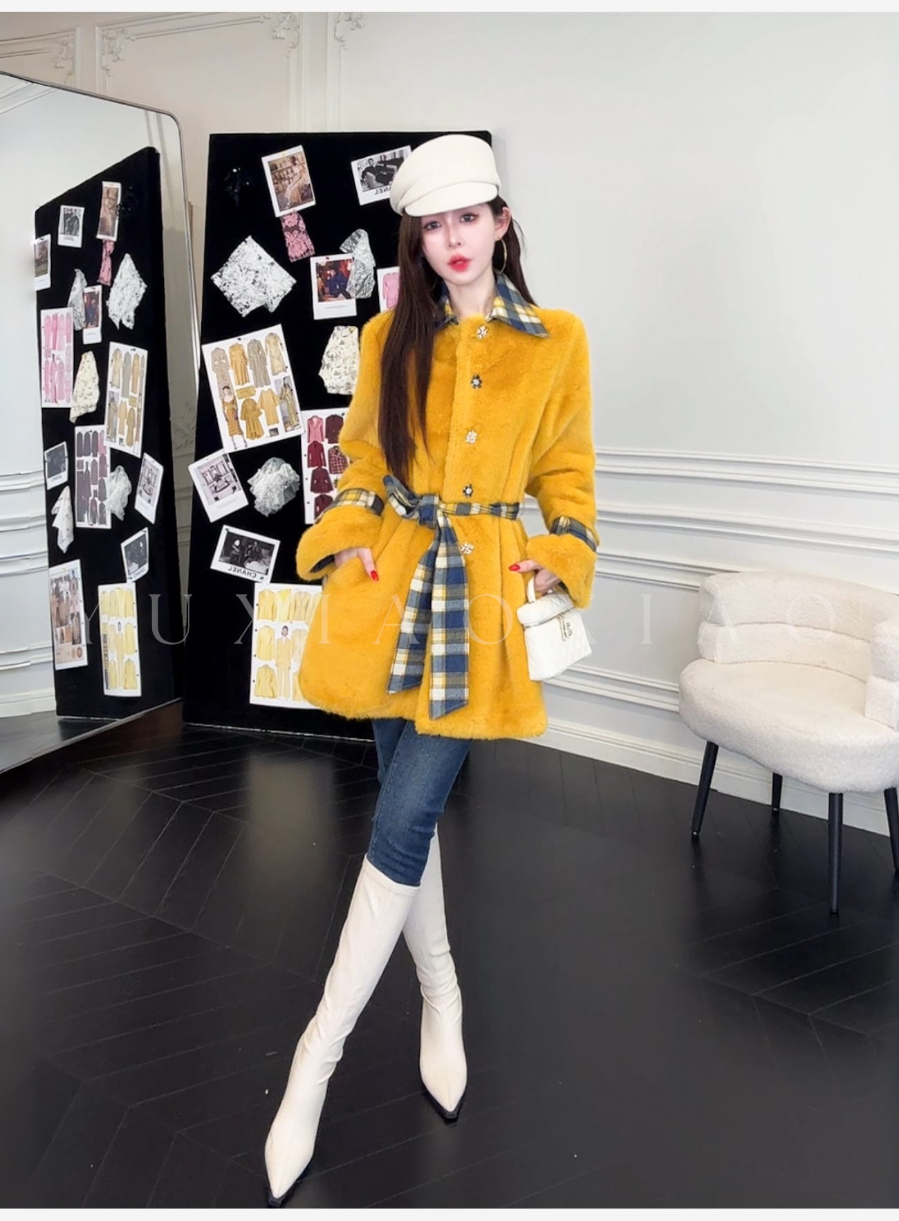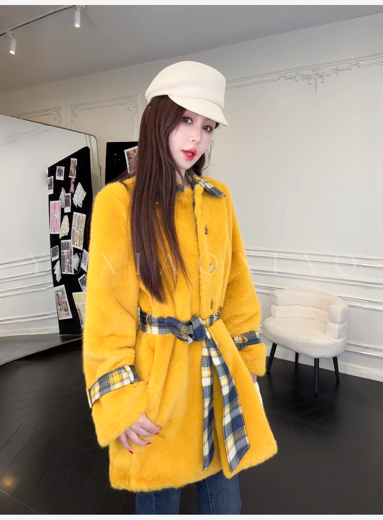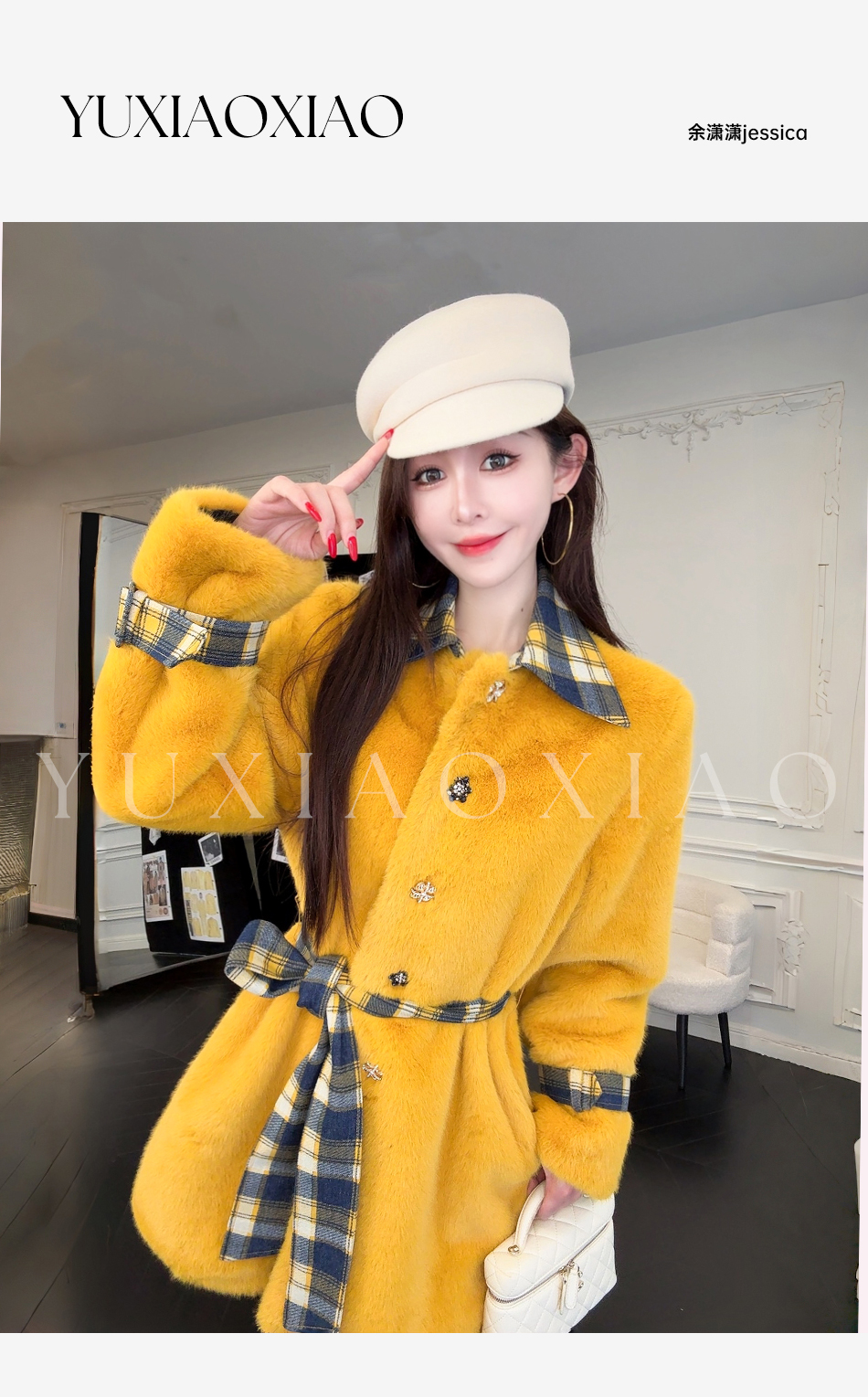 余潇潇【帕丁顿庄园】复古拼接格纹翻领提花里布中长款毛毛外套
