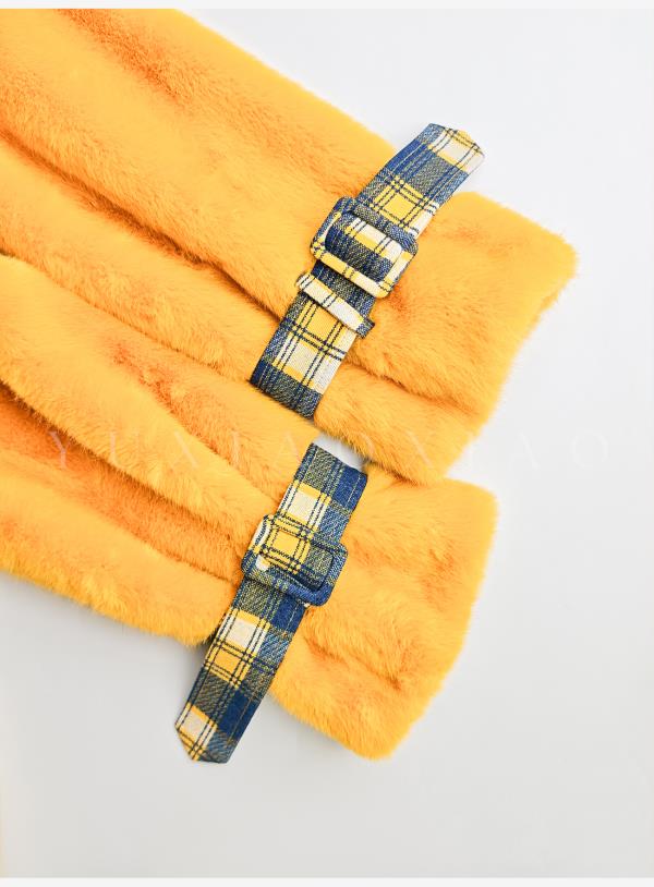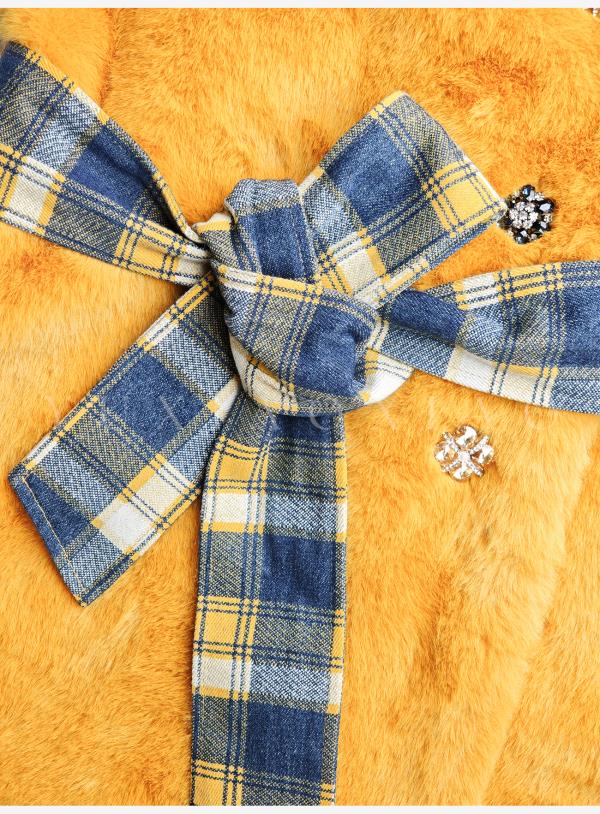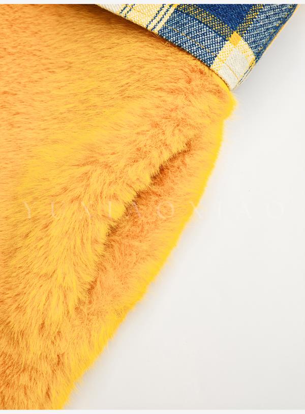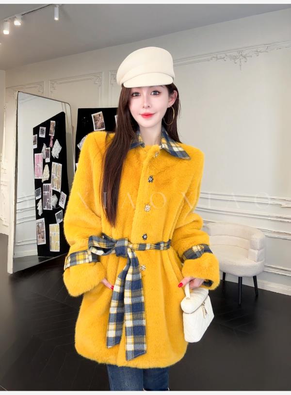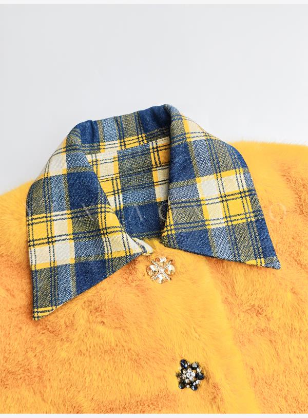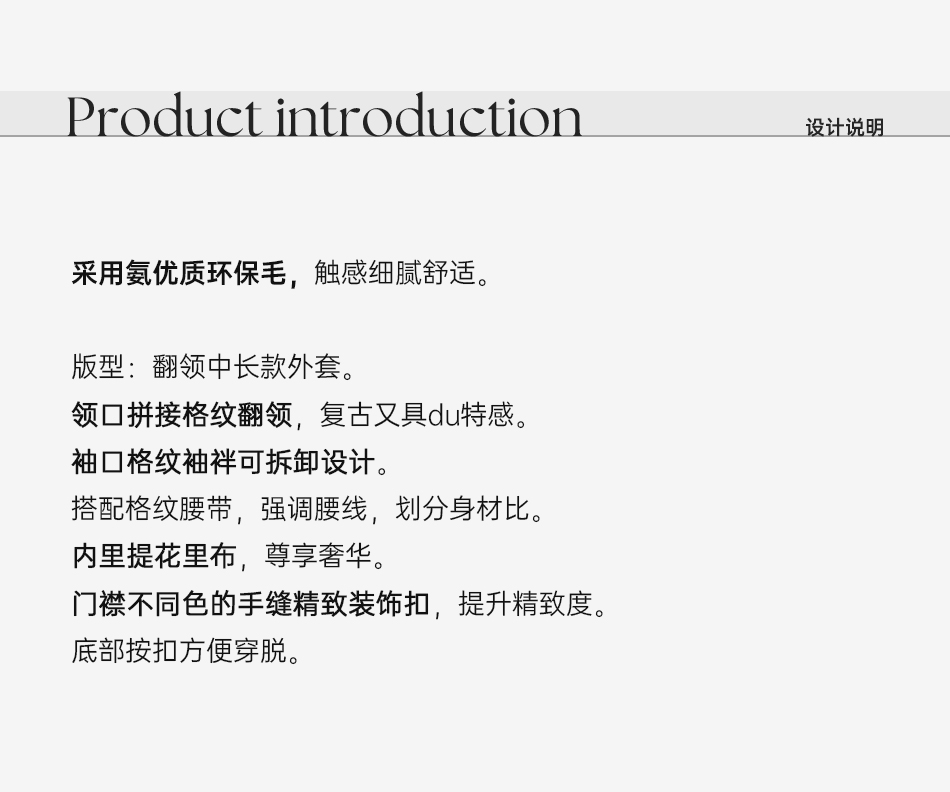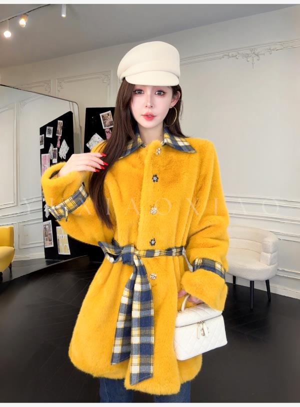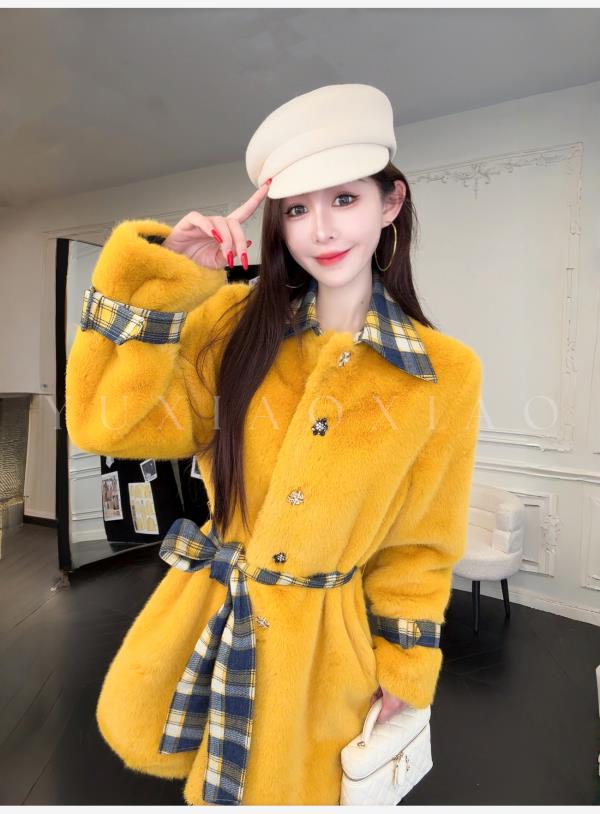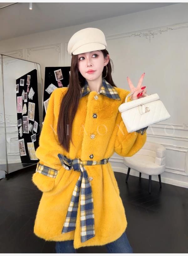 余潇潇【帕丁顿庄园】复古拼接格纹翻领提花里布中长款毛毛外套