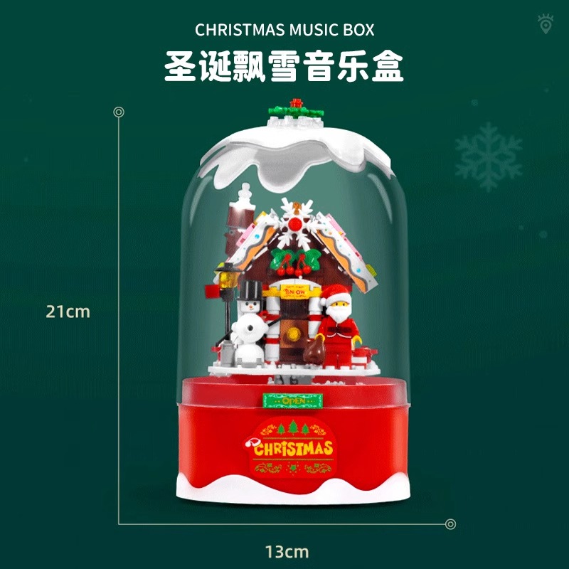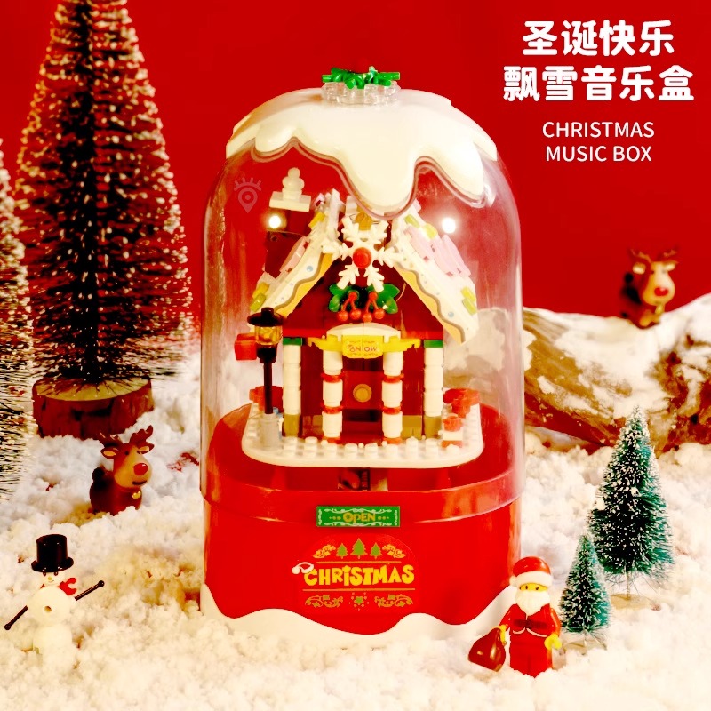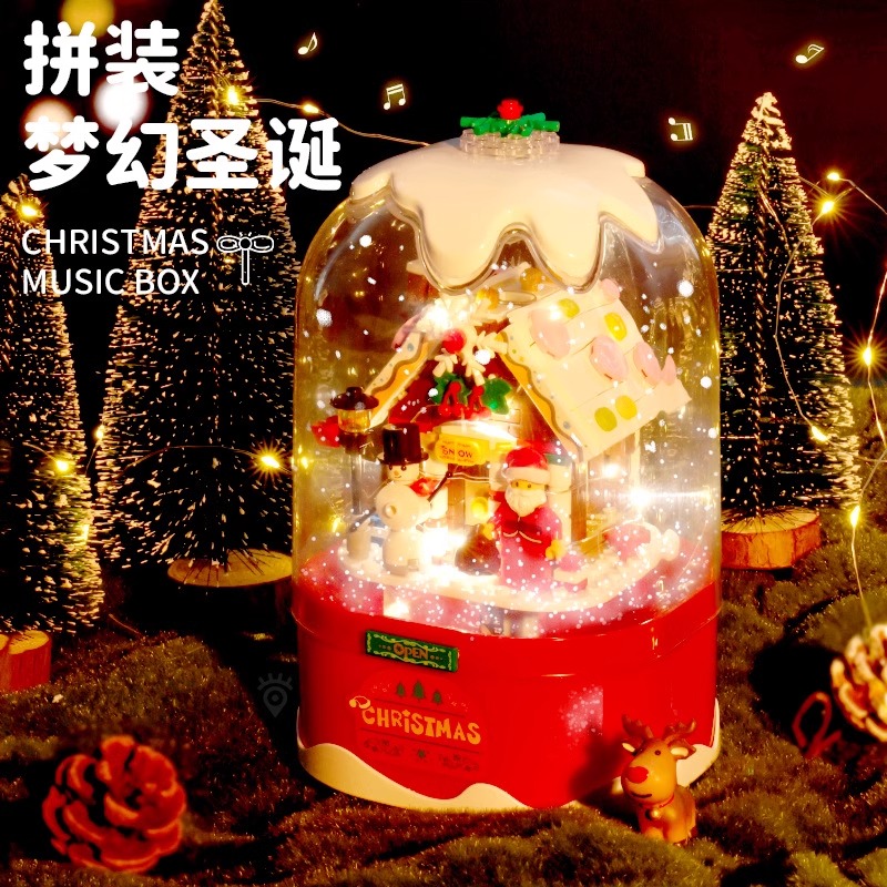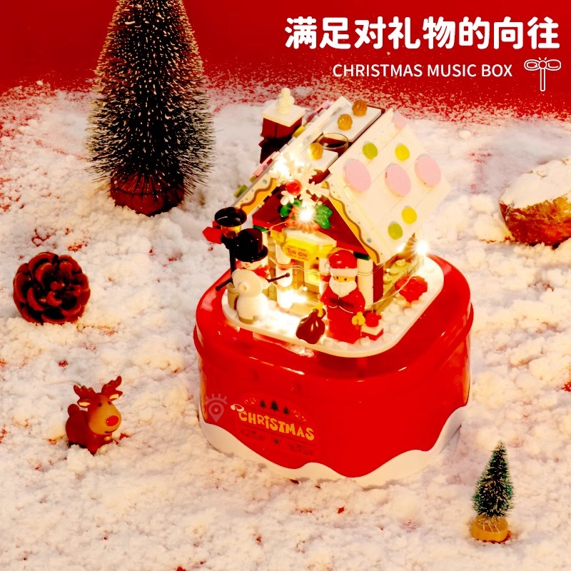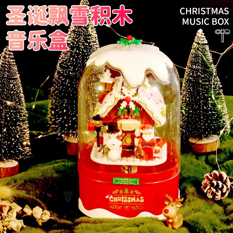 圣诞福利!【圣诞新年礼物,八音盒积木】圣诞节礼物男孩子女孩飘雪灯光旋转音乐盒拼装中国积木儿童玩具模