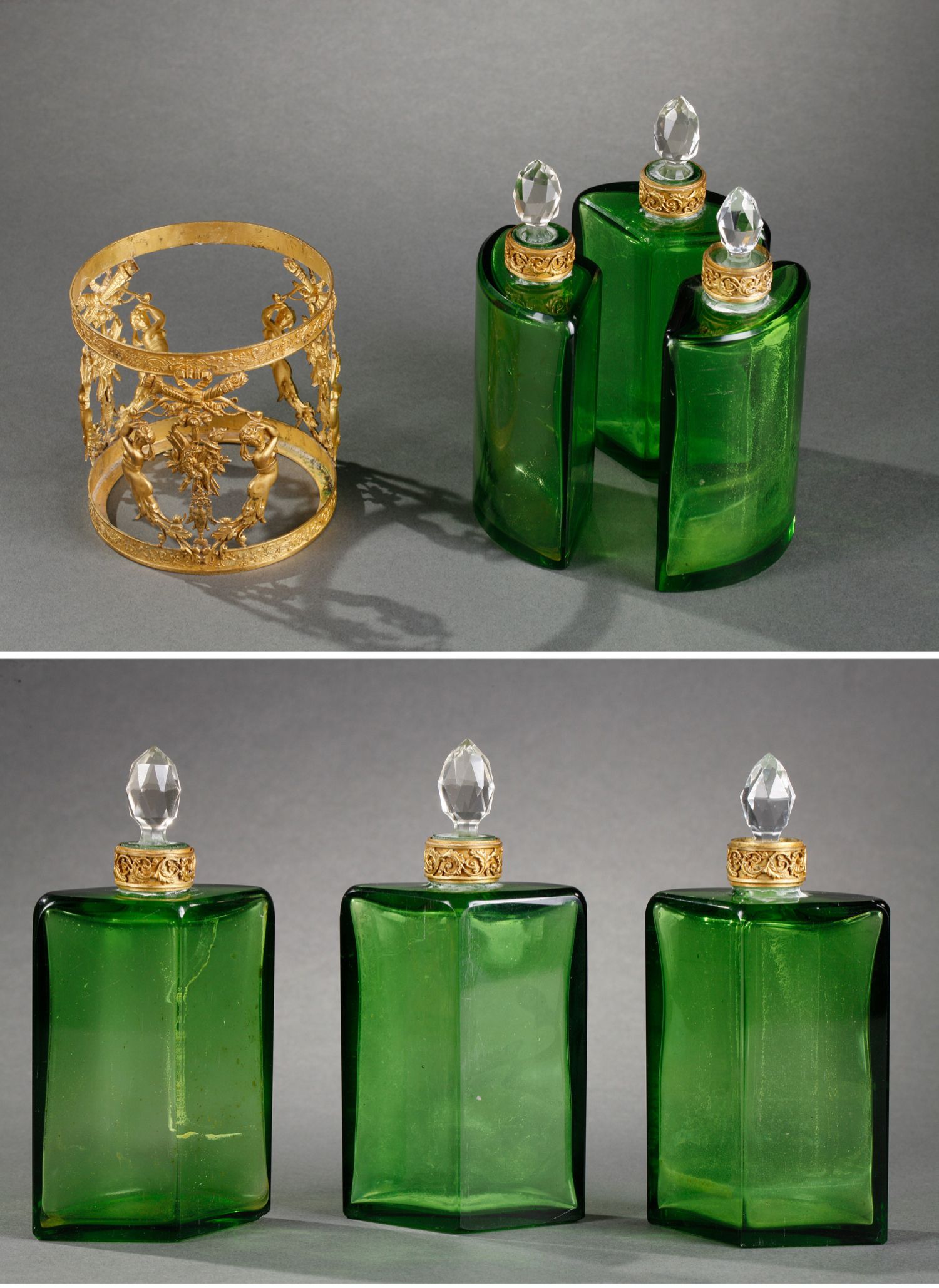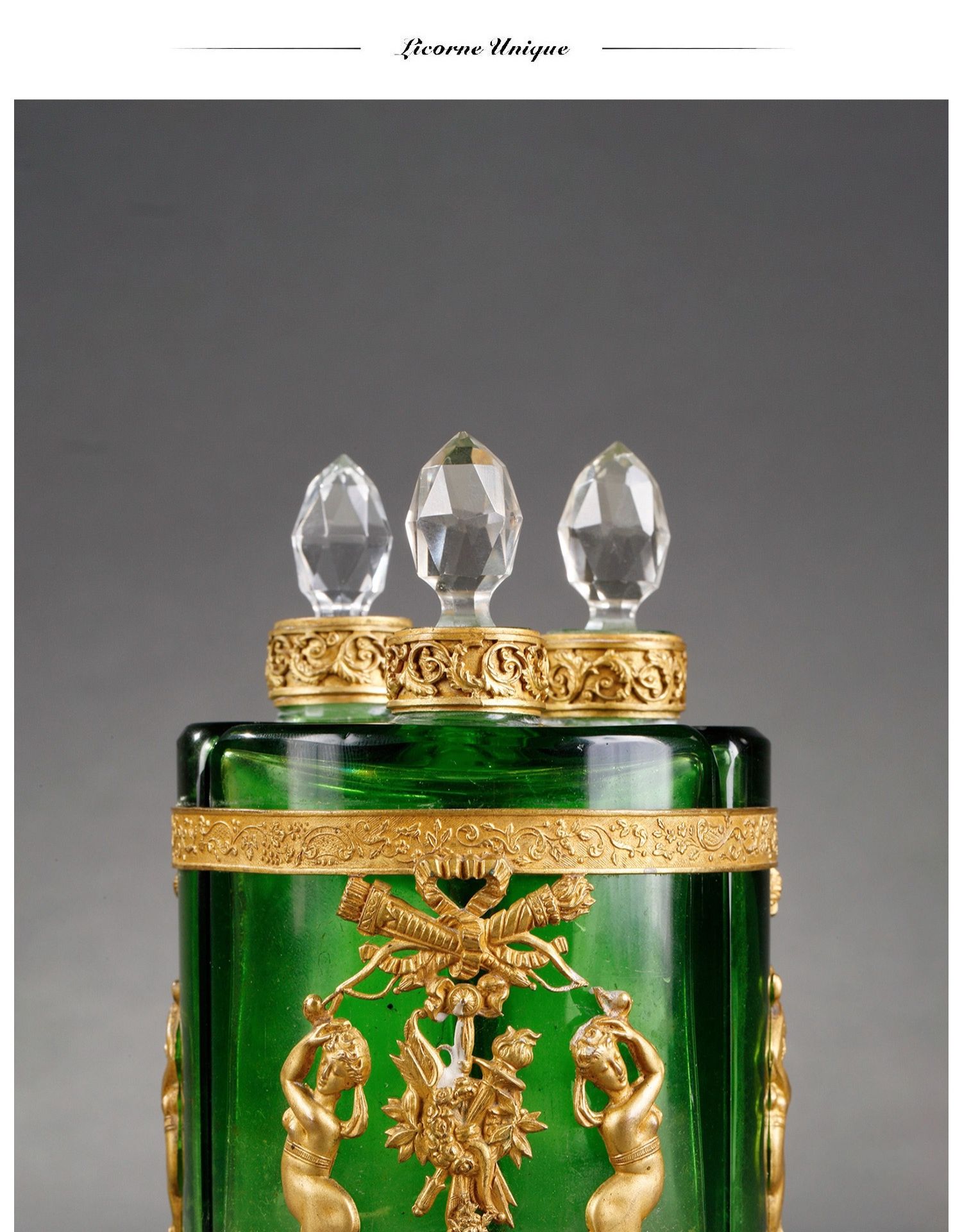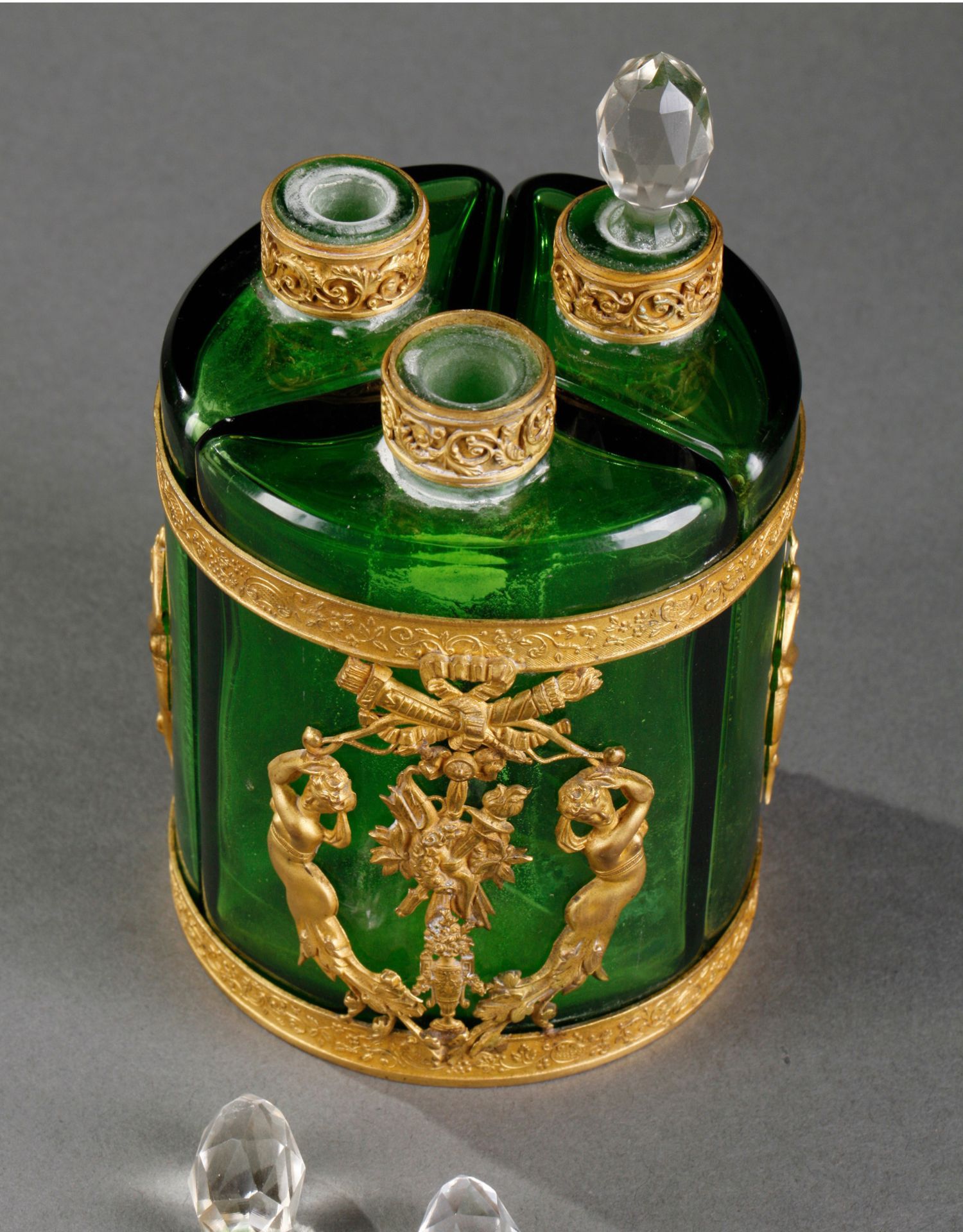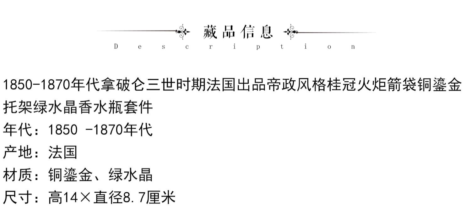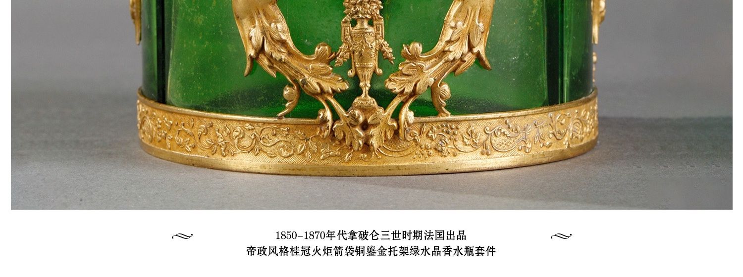独角鹿西洋古董法国帝政风格桂冠火炬箭袋铜鎏金绿水晶香水瓶套装