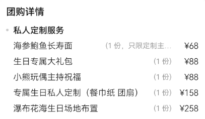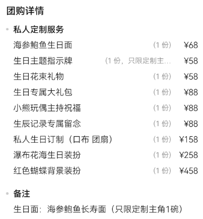 套餐以下图片供参考,以实际为准,长寿面1份,装饰展示布景不可带走。