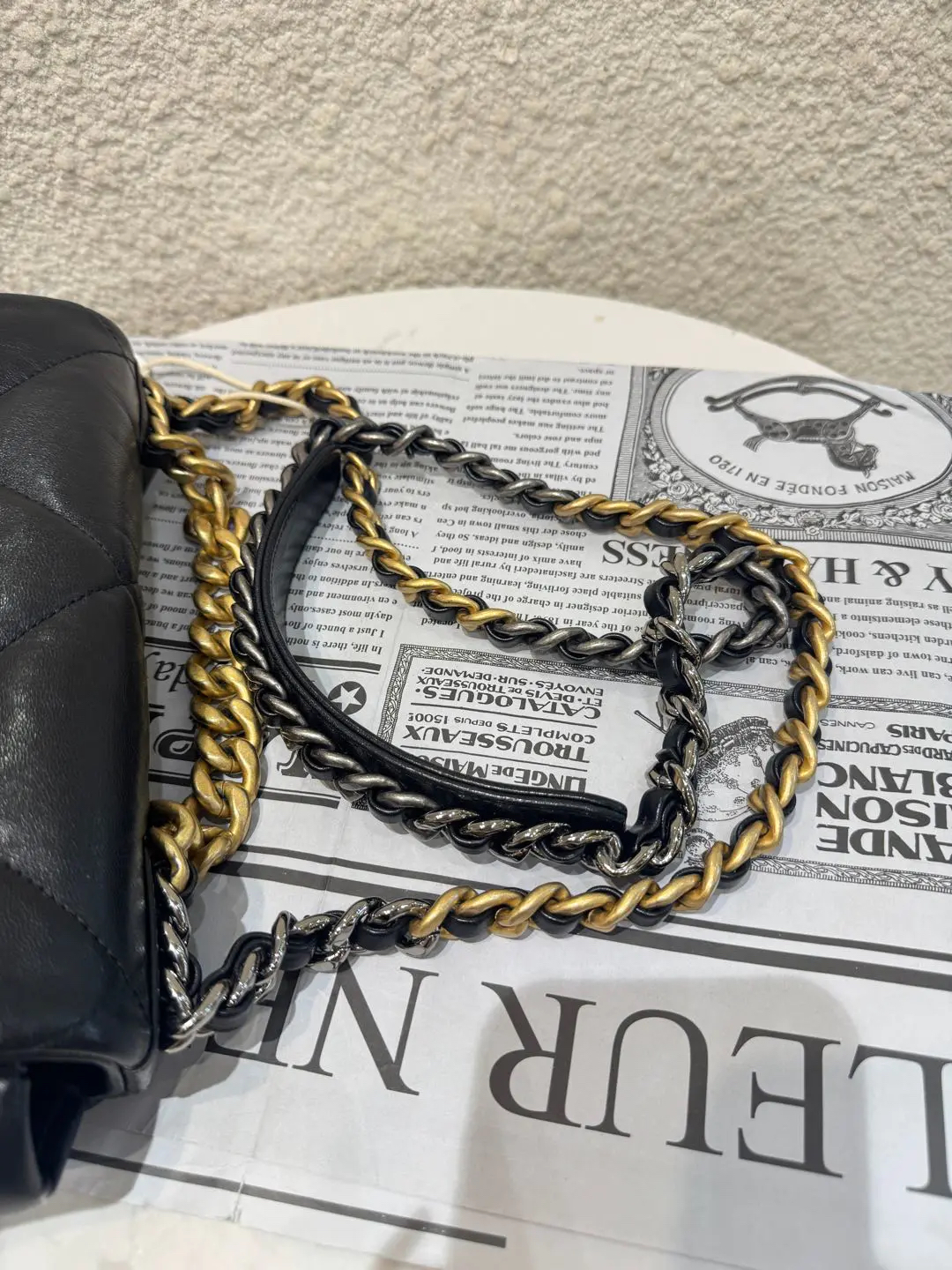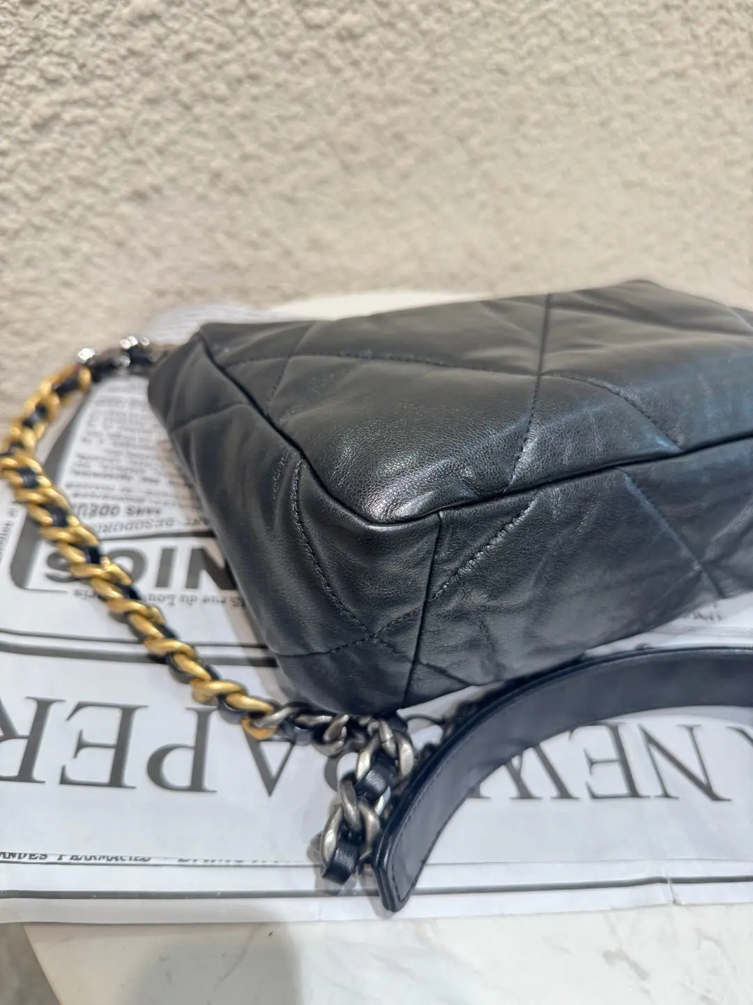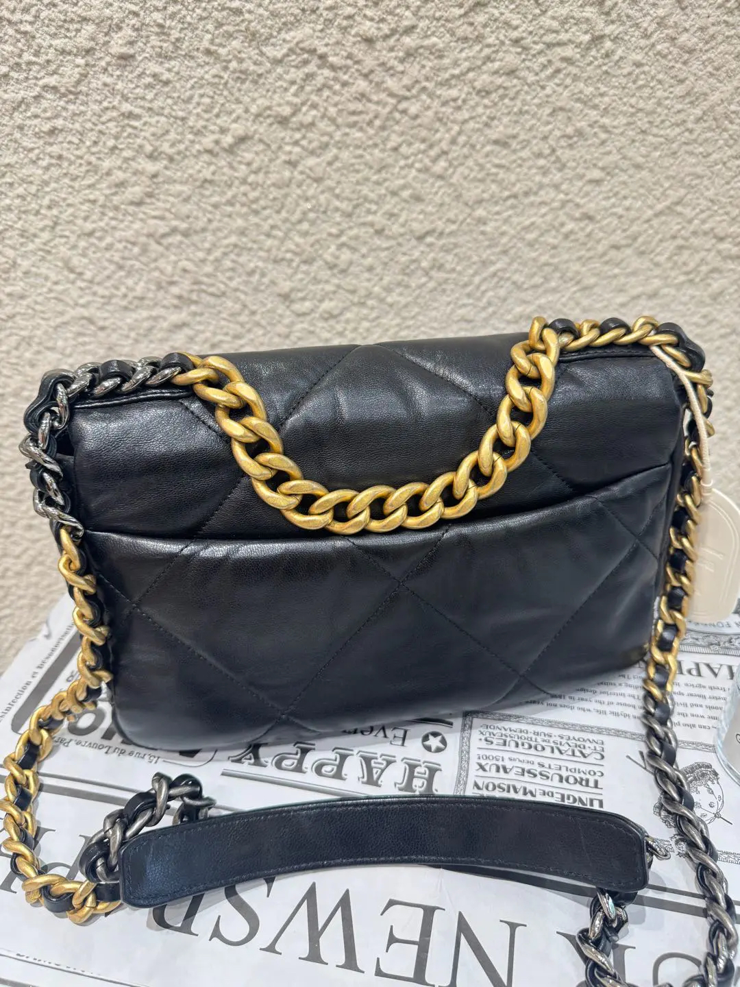 【商品详情】CHANEL 小号 黑金 山羊皮 19bag 斜挎包🍩98新 26×17 镭射29开 配件:防尘袋。包身轻微使用痕迹 经典金刚款。