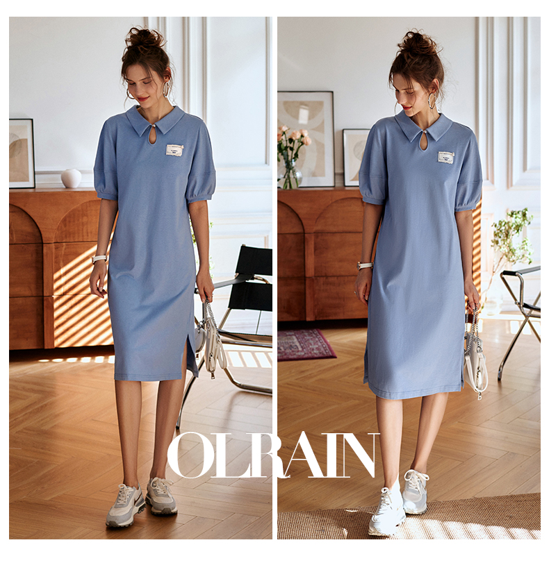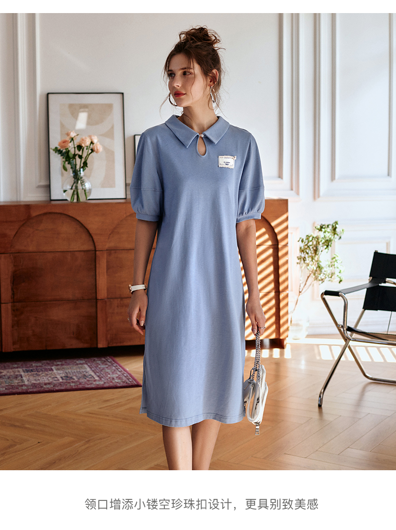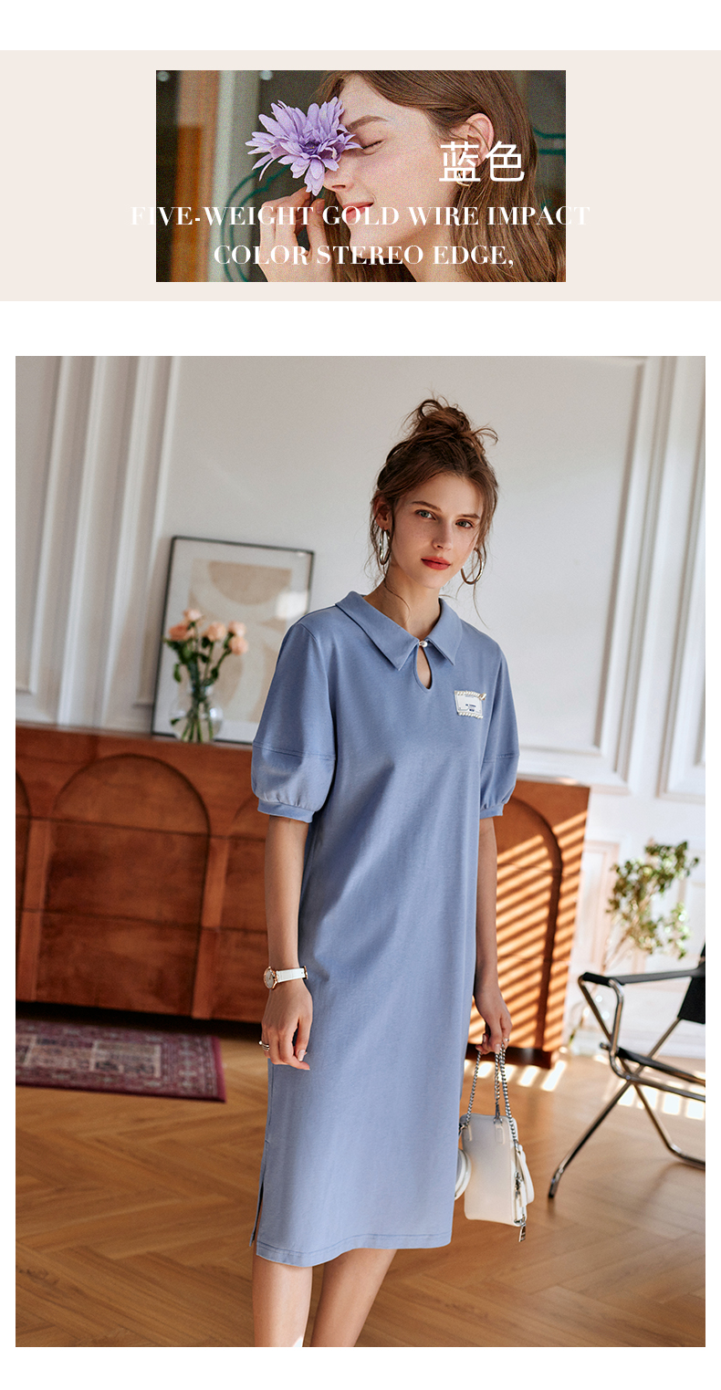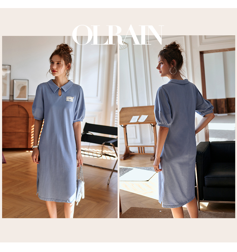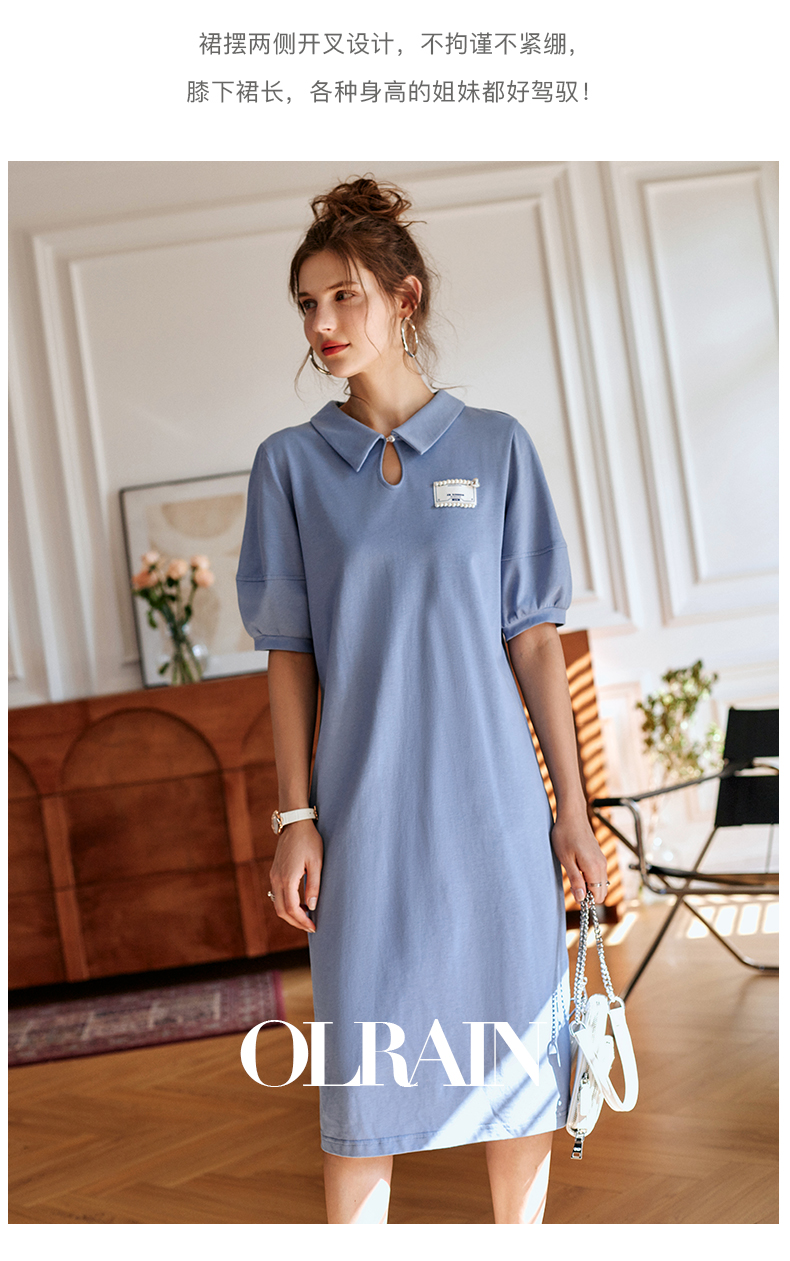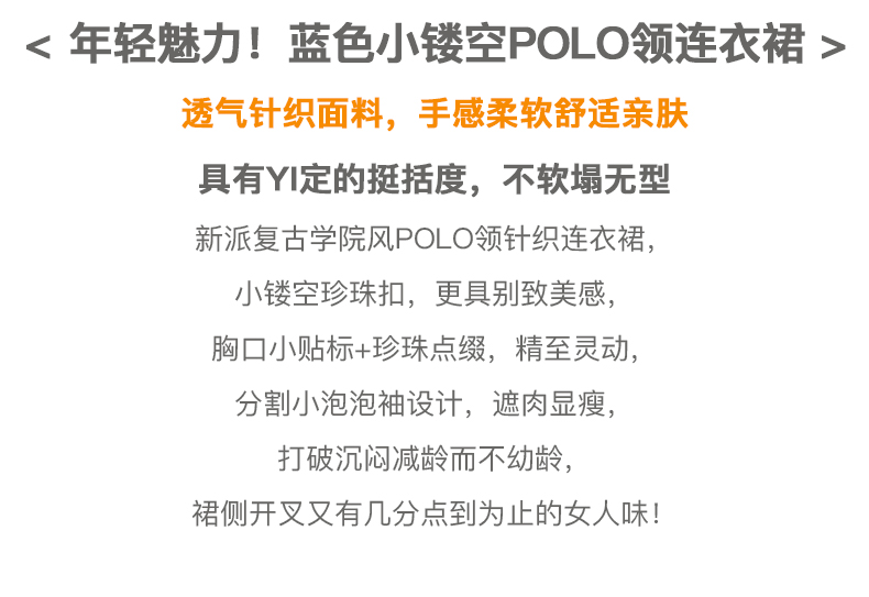 【欧芮儿POLO连衣裙2021夏收腰显瘦气质复古泡泡袖学院风针织蓝色裙