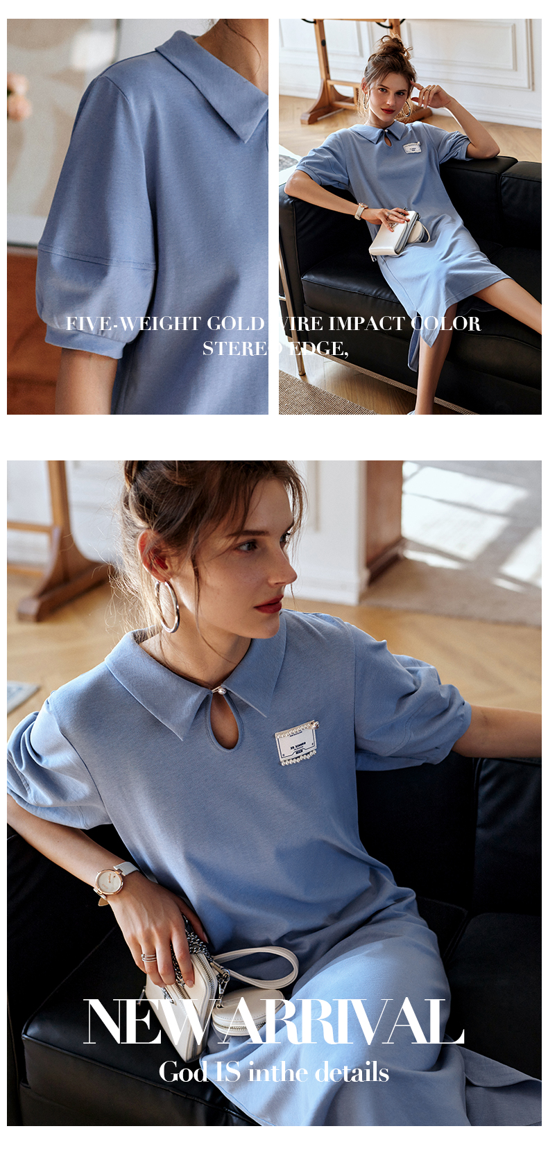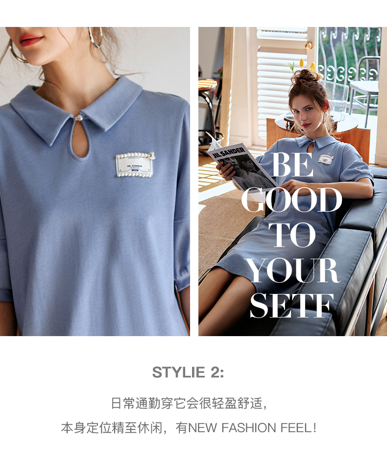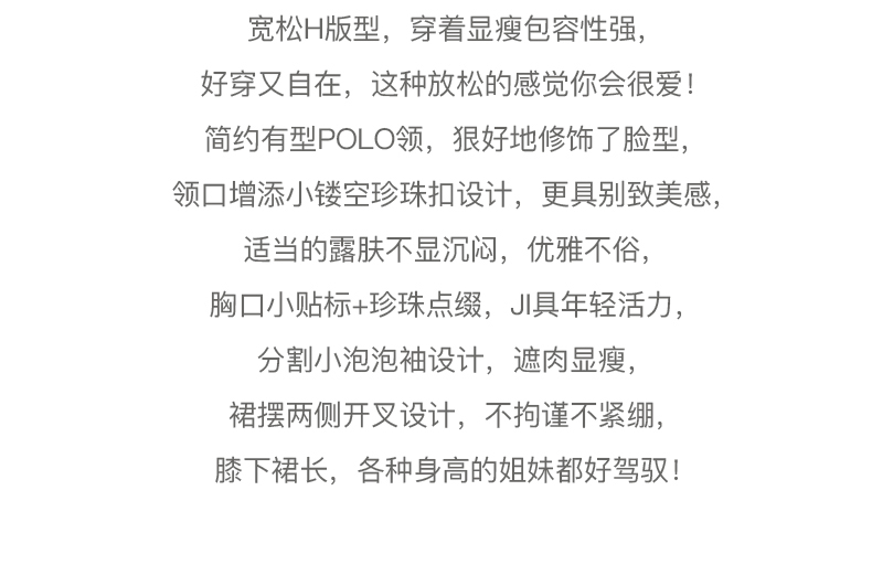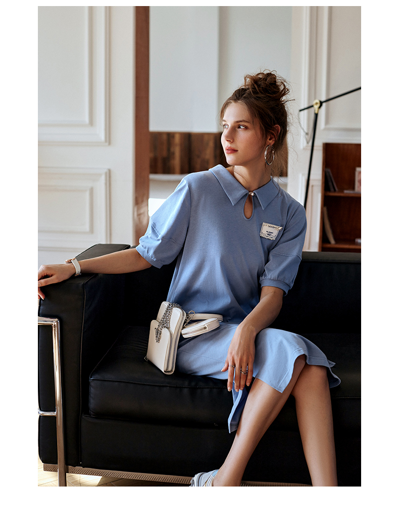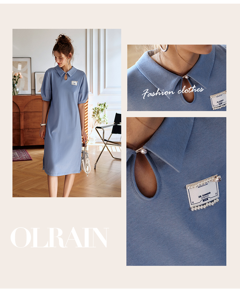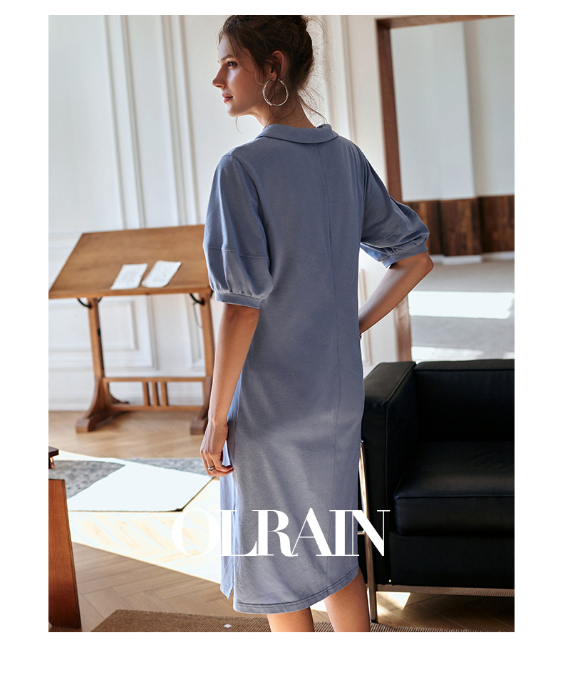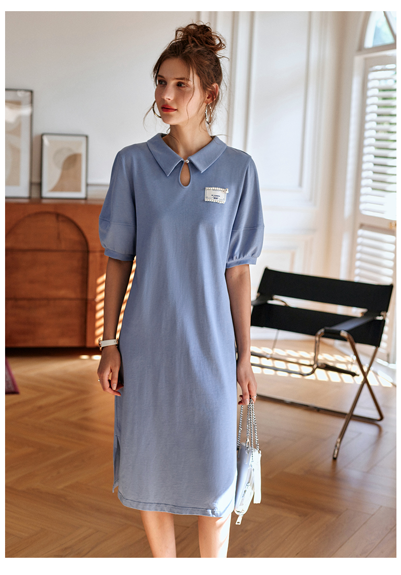 【欧芮儿POLO连衣裙2021夏收腰显瘦气质复古泡泡袖学院风针织蓝色裙