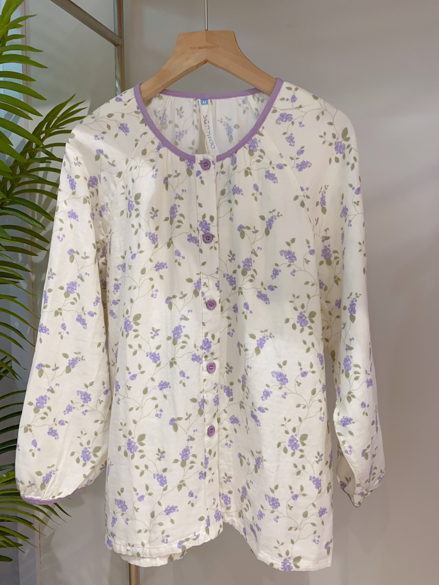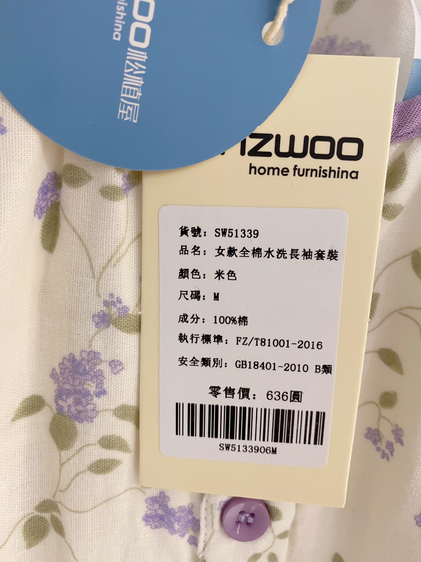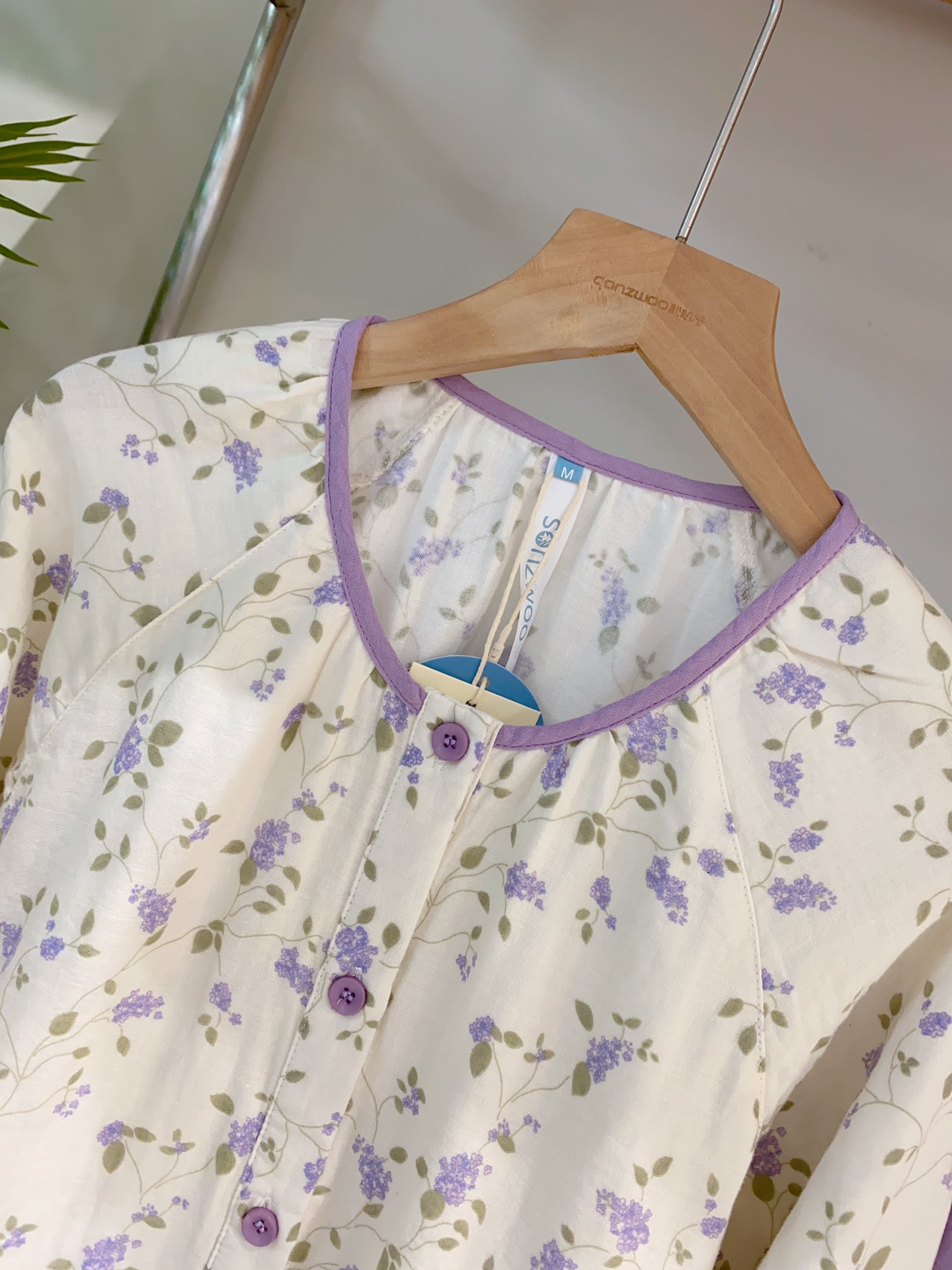 100%全棉双层纱面料,水洗预缩工艺,透气亲肤,圆领包边+紫色裤子撞色