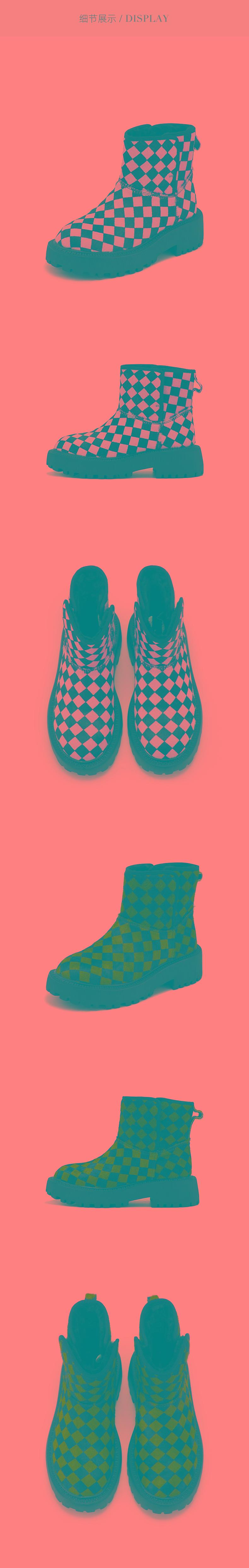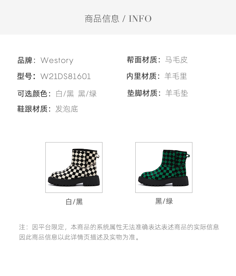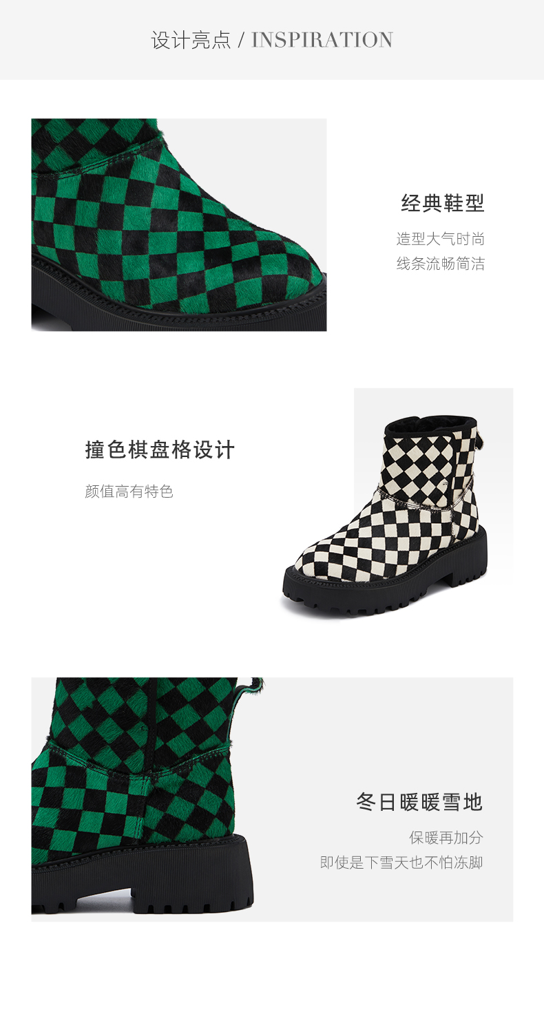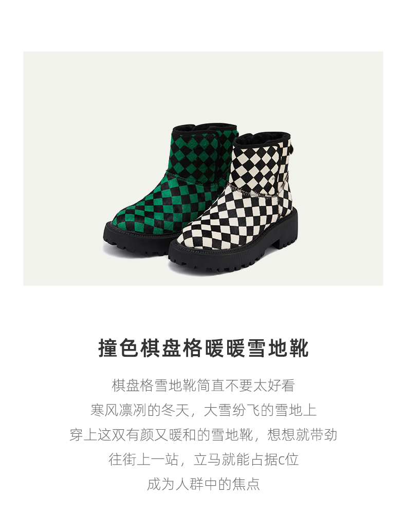 westory冬季厚底棋盘格雪地靴短筒洋气保暖靴子撞色真皮短靴女W21DS81601