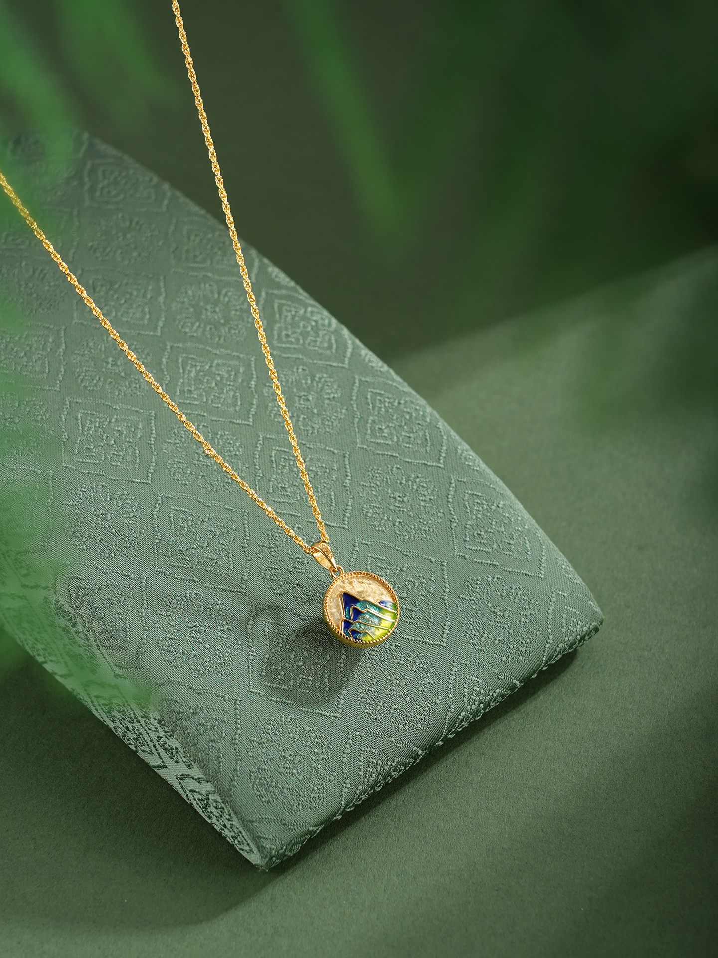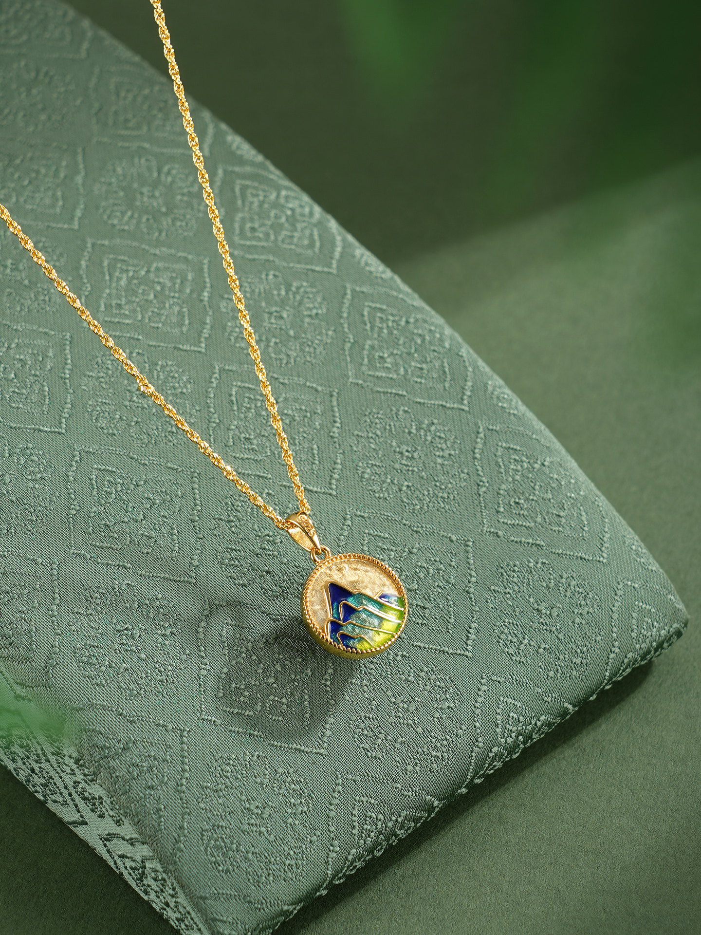 【寓意】:作品设计灵感源于北宋王希孟《千里江山图》,以珐琅工艺呈现北宋时期的锦绣山河,寄托对国家繁荣昌盛、风调雨顺的祝福,更蕴含对佩戴者顺遂吉祥、幸福美好的无限祝福。