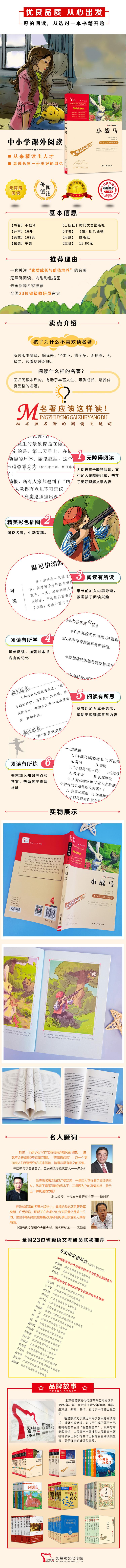 《小战马》共收录了七篇精彩的动物故事,向我们展示了一个和人类世界一样生动复杂的动物世界。牧羊犬乌利的故事,引导我们学会分辨善恶;可爱的小狗宾果,让我们感受到了人与动物之间的纯洁友谊;宁死不屈的黑野马,让我们明白了自由的伟大;长耳野兔小战马,它那战无不胜的非凡经历令我们感动并敬佩……书中的这些动物不会说话,但它们充满个性,爱憎分明,凭着强烈的本能与自然、与人类抗争,虽然总是以悲剧告终,但仍然充满了生命的尊严。除正文外,根据本书特点,还设置了“如何进行价值阅读”“全书导读”“名师导学3-2-1”“章节导读”“随文批注”“成长启示”“要点思考”“写作积累”“延伸阅读”“知识考点”等板块,以期帮助学生读懂名著,爱上名著,通过名著培养其一生受用的优秀品质。