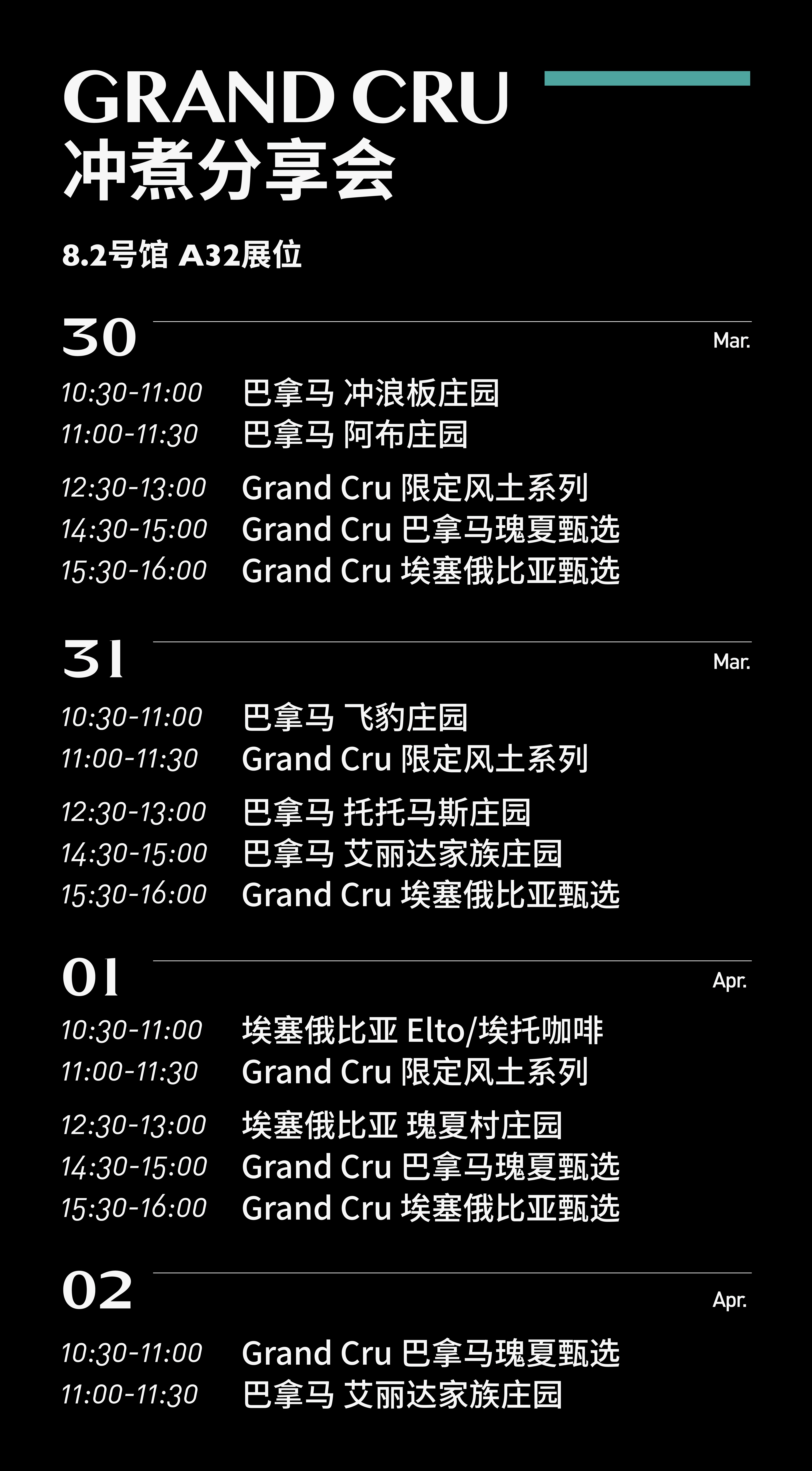 5、下方冲煮日程安排,分为【庄园主亲临吧台冲煮】和【GRAND CRU新产季甄选批次冲煮体验】,请根据兴趣酌情预约。
