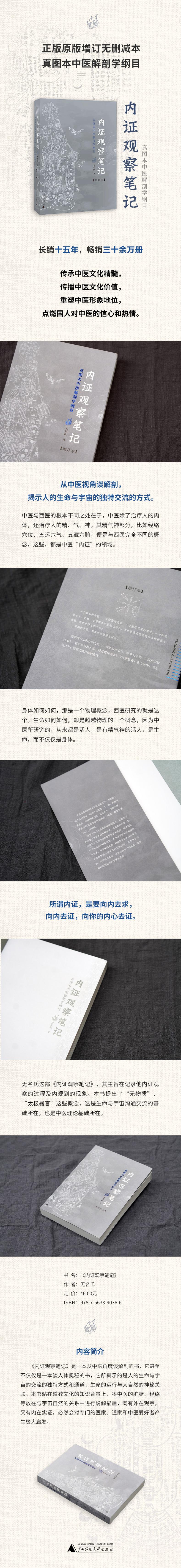中医与西医的根本不同之处在于,中医除了治疗人的肉体,还治疗人的精、气、神。其精气神部分,比如经络穴位、五运六气、五藏六腑,便是与西医完全不同的概念,这些,一是中医“内证”的领域。《内证观察笔记:真图本中医解剖学纲目(增订本)》是一本从中医视角谈解剖的书,它甚至不仅仅是一本谈人体奥秘的书,它所揭示的是人的生命与宇宙的交流的独特方式和通道,生命的运行与大自然的神秘关联。《内证观察笔记:真图本中医解剖学纲目(增订本)》以道教文化和知识为背景,将中医的脏腑、经络等放在人体生命与宇宙自然的关系中进行说解描画,既有外在观察,又有内在实证,必然会对专门的医家,道家和中医爱好者产生极大启发。