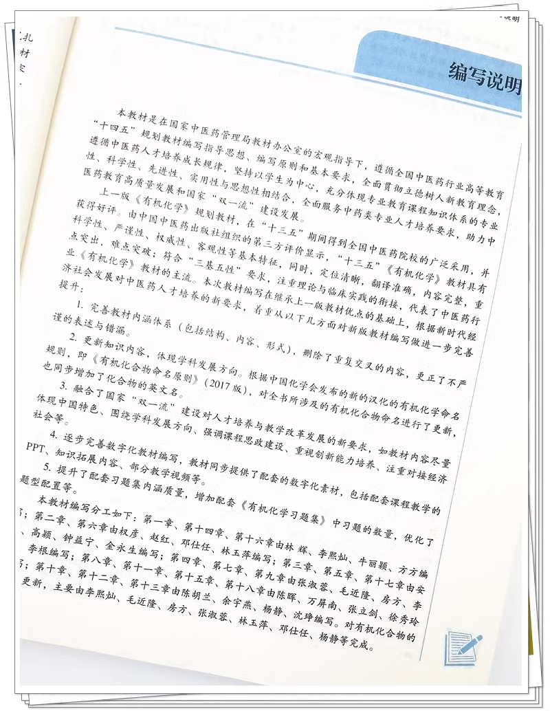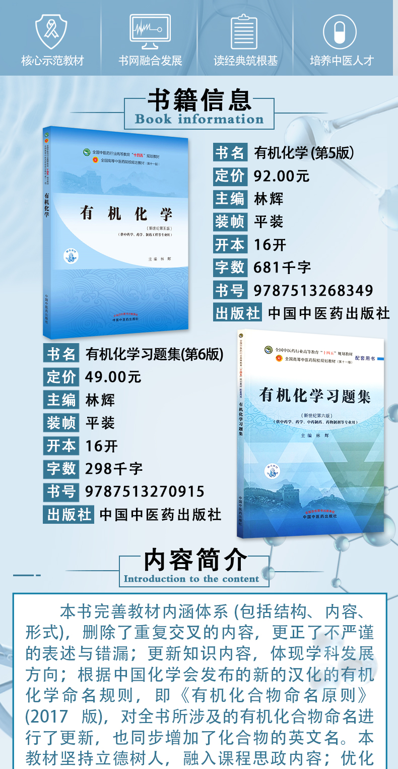 本书完善教材内涵体系 (包括结构、内容、形式),删除了重复交叉的内容,更正了不严谨的表述与错漏;更新知识内容,体现学科发展方向;根据中国化学会发布的新的汉化的有机化学命名规则,即《有机化合物命名原则》 (2017 版),对全书所涉及的有机化合物命名进行了更新,也同步增加了化合物的英文名。本教材坚持立德树人,融入课程思政内容;优化知识结构,强化中医思维培养;突出“三基五性”,注重内容严谨准确;强化精品意识,建设行业示范教材;加强数字化建设,丰富拓展教材内容。