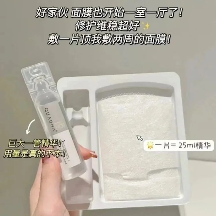 清洁肌肤后,撕开铝薄膜;取出包装内夸迪大次抛精华液,旋转开盖后均匀倒入面膜纸中,静置1分钟待面膜膜布完全挂液;轻敷面部,静享15-20min,取下并按摩促进精华吸收。