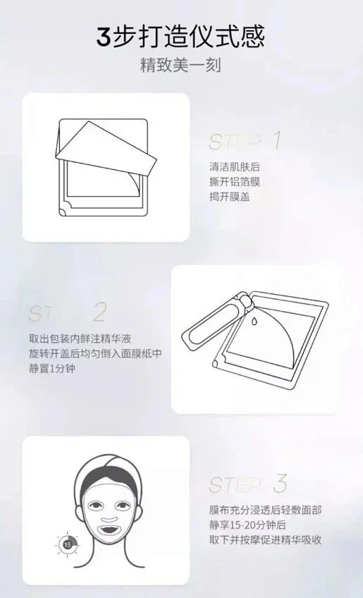 避免面膜不新鲜所导致的种种问题,比如防腐剂、香精过量,易发敏感等,同时最大程度地提升单品品控,使每一次面膜都能以纯粹的好膜布、好精华来打造好的敷贴体验。