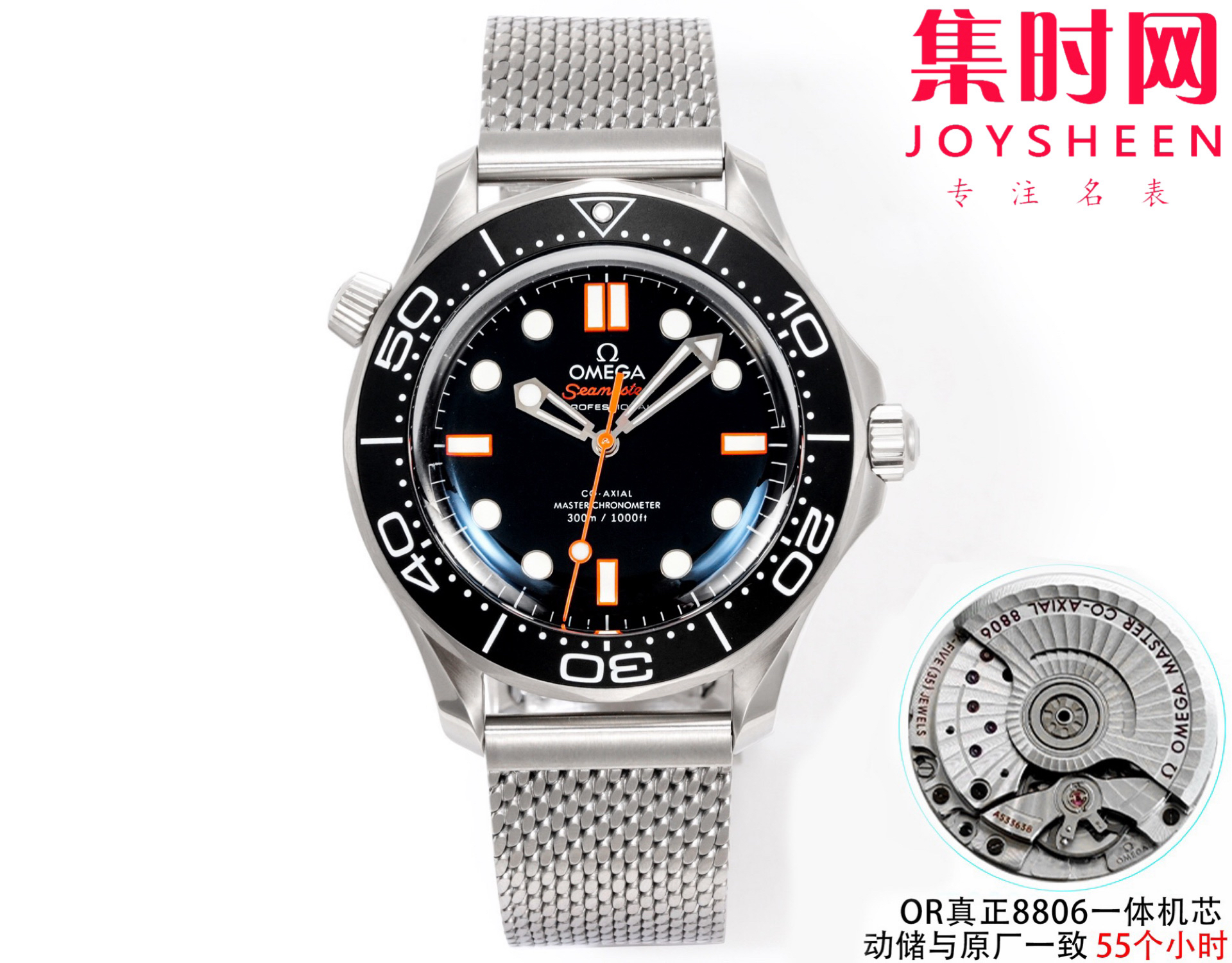 OR欧米茄海马300米系列 心想事“橙” 橙针款 米兰钢带 无历海马 8806一体机 男士腕表 表径42mm 原装开模对版的全新海马系列300米潜水表橙针款,网带、胶带、折叠扣都是全新开模对版最新专柜官网的设计,耗时三年半研究开发出真正OR定制Cal.8806一体自动上链机械机芯。