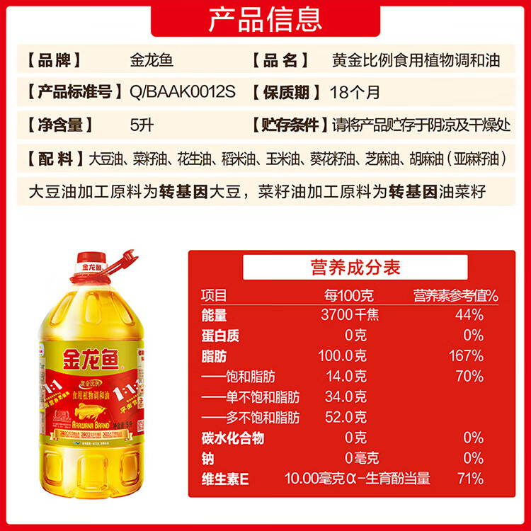 金龙鱼黄金比例调和油5L