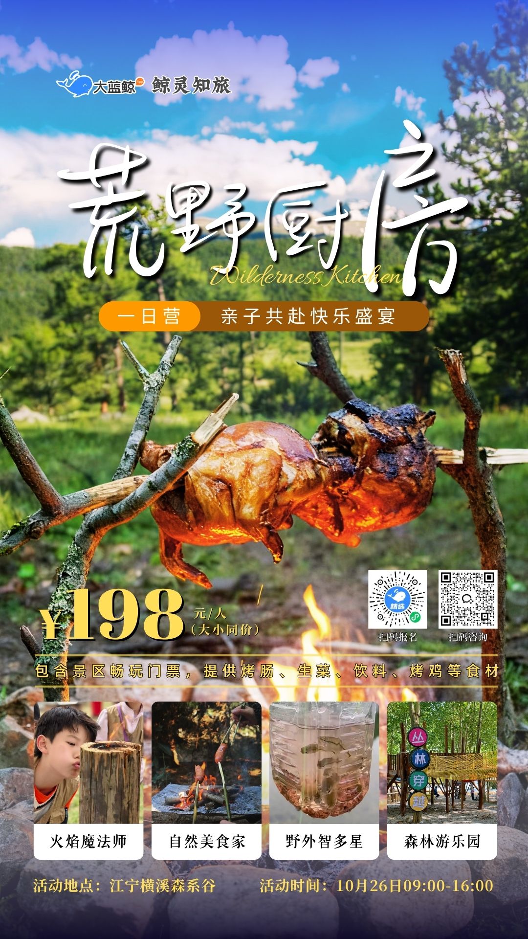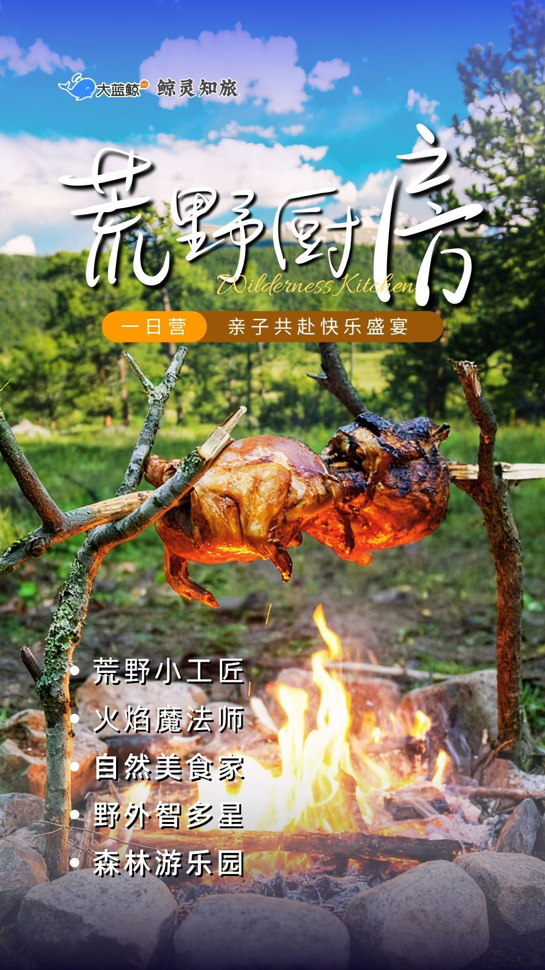 大蓝鲸爱研学|【亲子一日营】荒野厨房,终极野外小勇士,点燃野火,烹制奇趣童年,丛林穿越,陷阱捕鱼,亲子游乐……