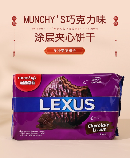 MUNCHY'S巧克力味涂层夹心饼干 饼干口感酥脆,中间的夹心 甜而不腻,与外面的巧克力 涂层完美融合,每一口都能 感受到丰富的层次感 甜中带点微苦,口感十分独特