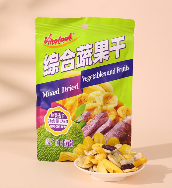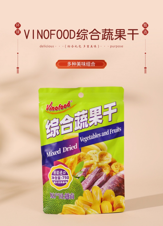 VINOFOOD综合蔬果干 蔬果干口感酥脆多汁,保留了 蔬果的原始风味和营养成分 每一口都能感受到不同蔬果的 香甜和脆爽,是健康零食的完美选择