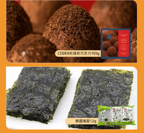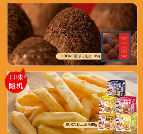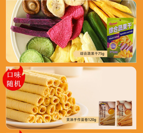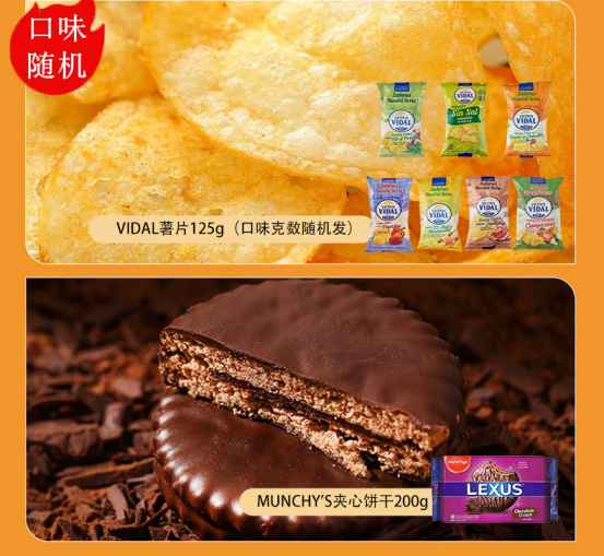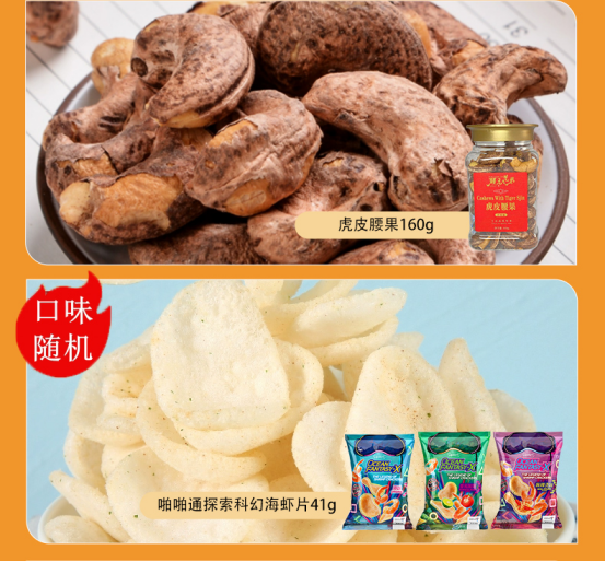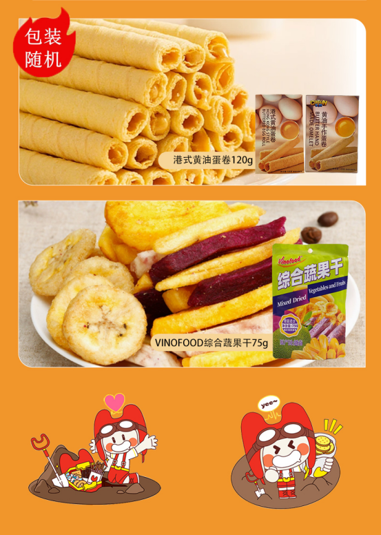规格二 蛋卷(港式黄油手作蛋卷/黄油手作蛋卷包装随机发)*1袋+CODEX松露形巧克力*1盒 +VIDAL薯片(火腿风味/蜂蜜黄油味/柠檬黑胡椒味/原味/奶酪洋葱味/辣味/香芹蒜香味/蔬缤纷味口味随机发) +UUKI苹果木原切烤肉片*1袋+韩国海苔*1袋+新疆若羌灰枣*1袋+带皮腰果*1罐+MUNCHY'S巧克力味涂层夹心饼干*1袋 +VINOFOOD综合蔬果干*1袋+UUKI厚切牛肉粒*1罐+金语港式鱼蛋(两种包装随机发)*1袋 +PAPATONG探索科幻海虾片(原味/番茄酸味/麻辣烫味口味随机发)*1袋