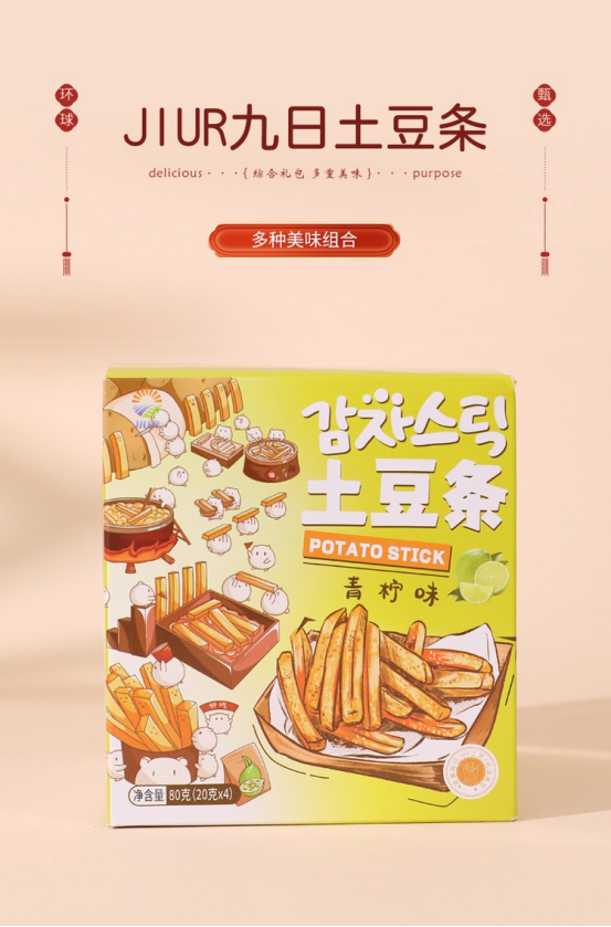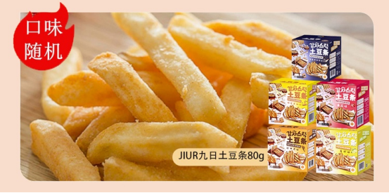 JIUR九日土豆条 原味/青柠味/海盐黑胡椒 蜂蜜黄油味/多椒麻辣味随机发 土豆条口感酥脆可口,每一口 都能感受到浓郁的,土豆香味 和淡淡的咸味,让人欲罢不能