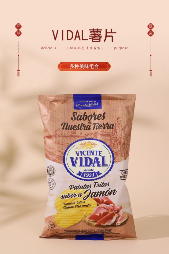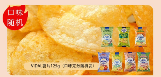 VIDAL薯片 火腿风味/蜂蜜黄油味/柠檬黑胡椒味/ 原味/奶酪洋葱味/辣味/香芹蒜香味/ 蔬缤纷味口味随机发,薯片酥脆可口 每一片都薄厚均匀,炸得恰到好处 带有淡淡的土豆原香和适量的咸味