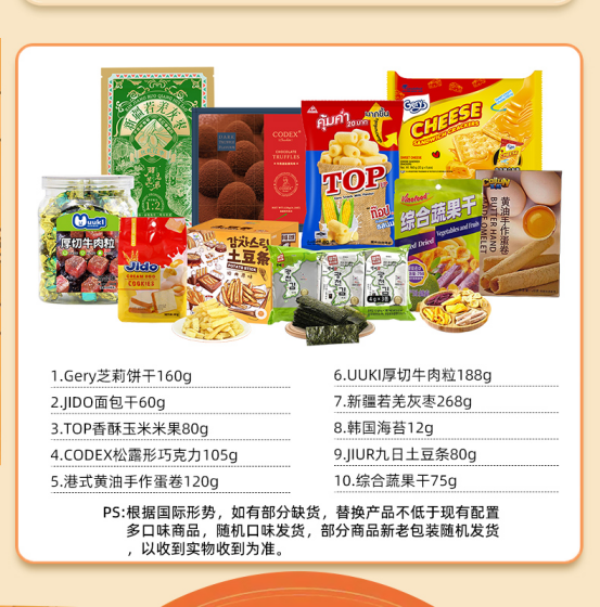规格一 Gery奶酪味饼干*1袋+UUKI厚切牛肉粒*1罐+JIDO面包干*1袋+新疆若羌灰枣*1袋 +TOP香酥玉米米果*1袋+CODEX松露形巧克力*1盒+JIUR九日土豆条(原味/青柠味/海盐黑胡椒/蜂蜜黄油味/多椒麻辣味口味随机发)*1盒 +蛋卷(港式黄油手作蛋卷/黄油手作蛋卷包装随机发)*1盒+韩国海苔*1+VINOFOOD综合蔬果干*1袋