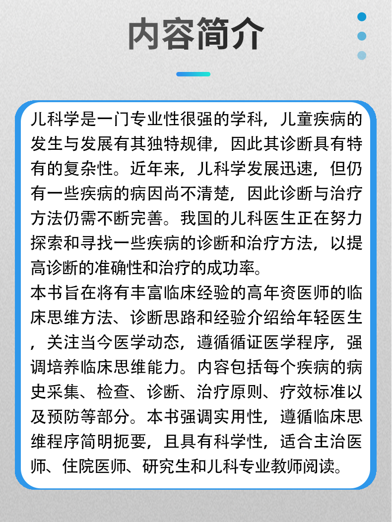 内容简介(简述书稿主要内容及章节)及本书特点:儿科医师规范化培训阶段,成为真正合格的临床医生,本书具有指导作用,可用于指导实践,便于住院医生掌握扎实的基础知识和技能,获得不断提升自己的能力。