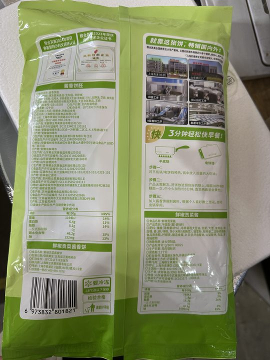 步骤一: 将平底锅/电饼铛预热,锅中放入适量的大豆油; 步骤二: 产品无需解冻,将饼放进预热好的锅上,每隔30秒将饼翻面一次,中小火加热约3分钟,直至两面呈金黄色: 步骤三: 加入酱香饼调制酱料,根据个人喜好撒上葱花,即可出锅享用~~