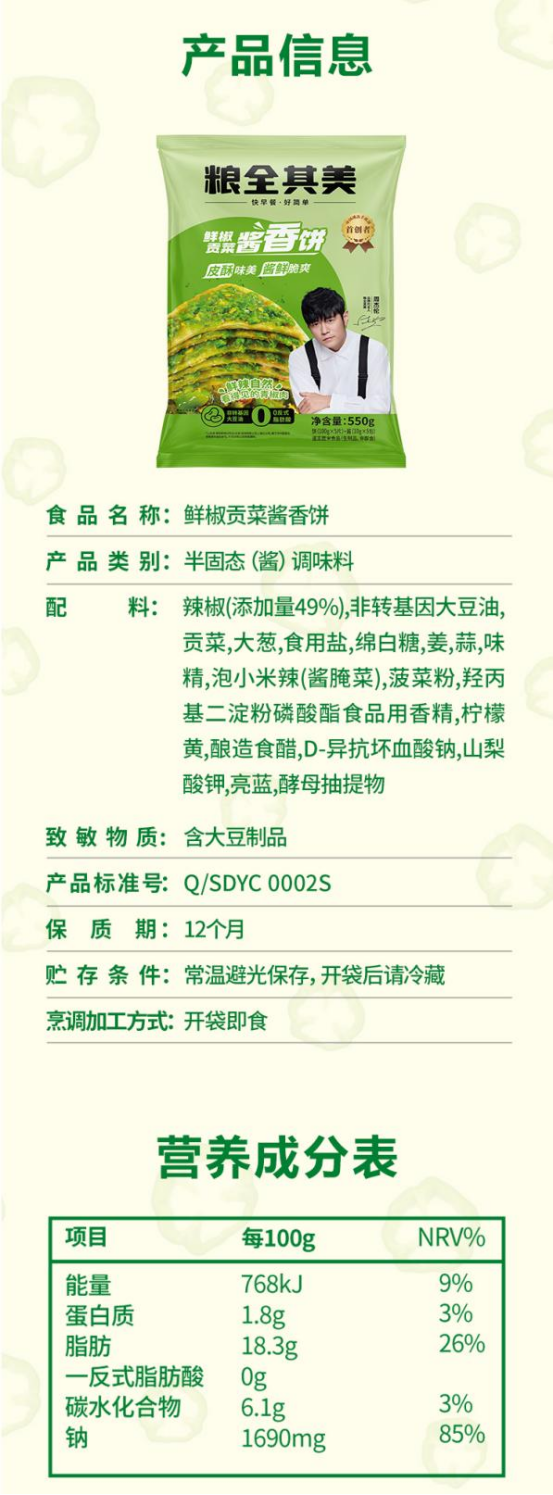 【粮全其美 鲜椒贡菜酱香饼3包】上新啦 🔥青椒+贡菜的灵魂搭配,太对味!👅 ✅鲜椒贡菜✅辣爽鲜香✅鲜而不咸~ 鲜咸适中👌辣不刺喉😍