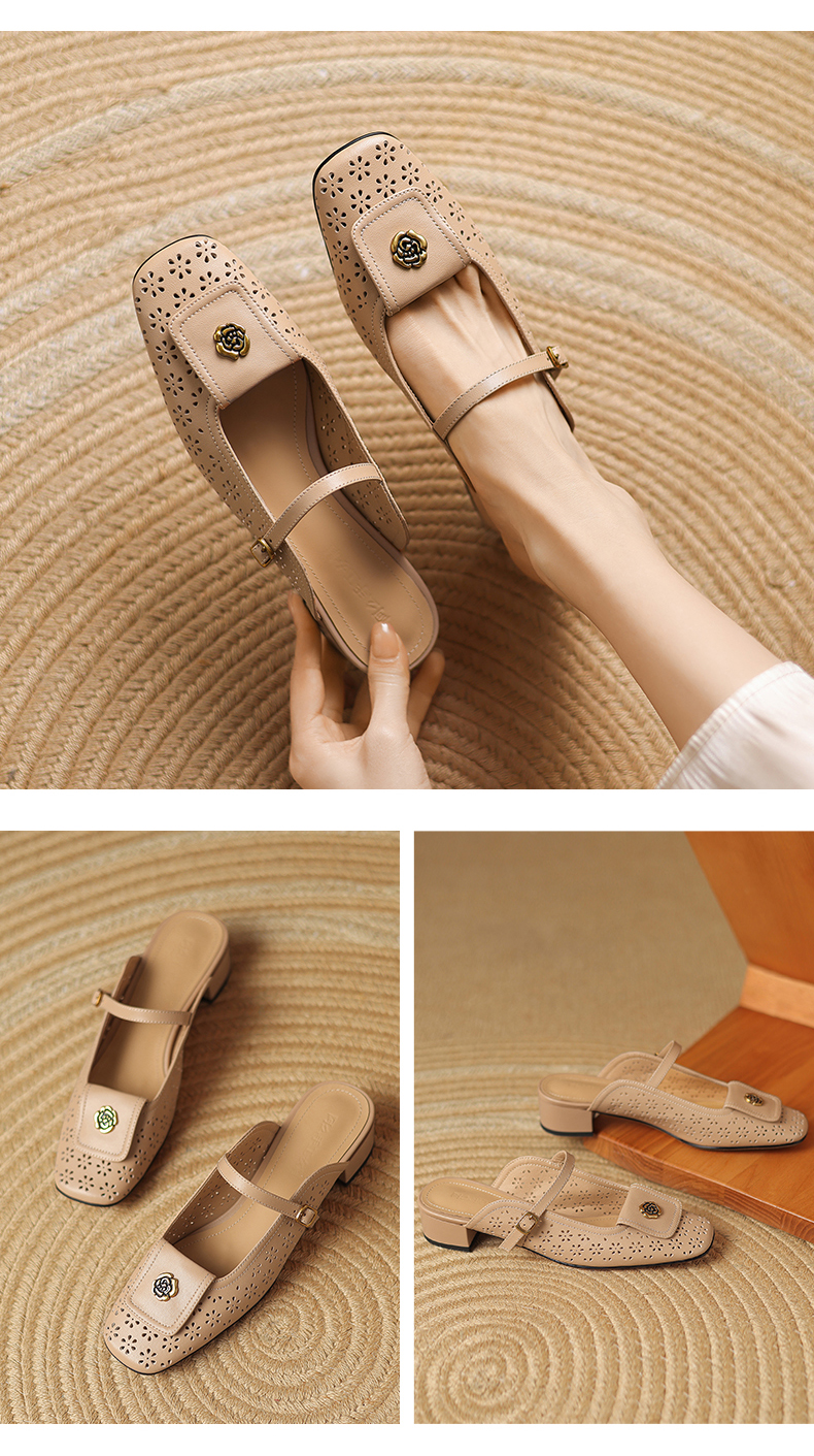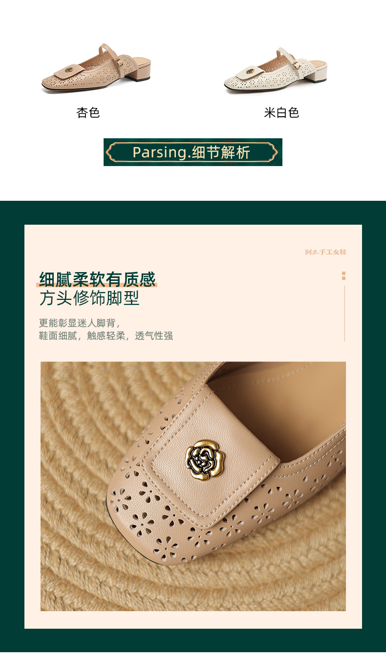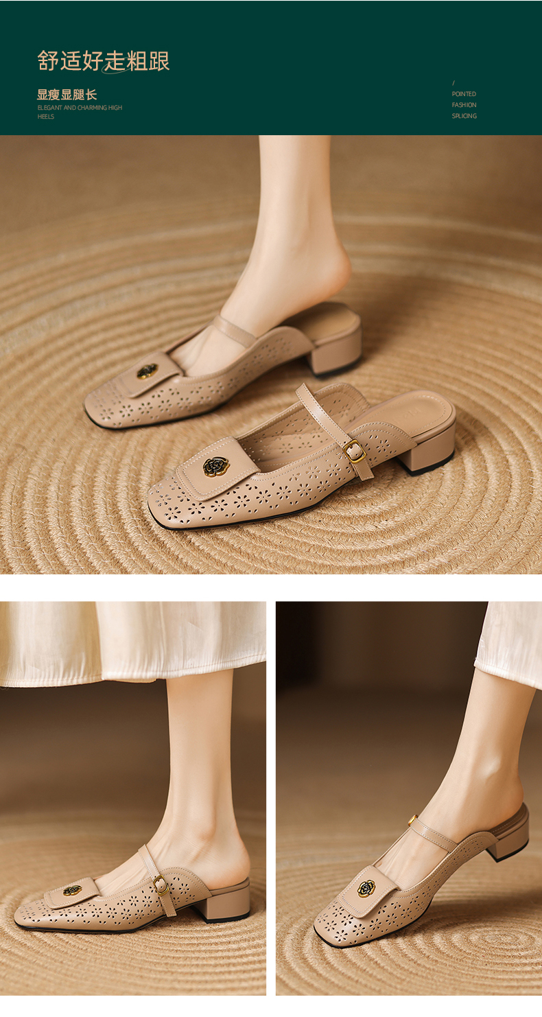 阿么手工女鞋山茶花真皮穆勒鞋粗跟3CM时尚包头一字带拖鞋女外穿