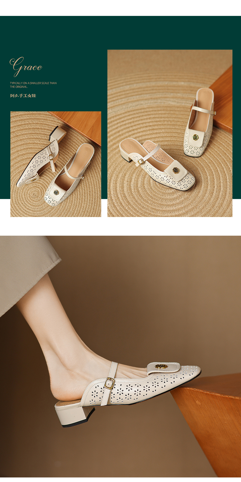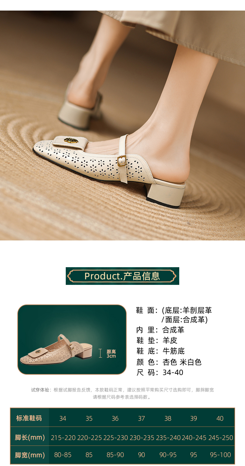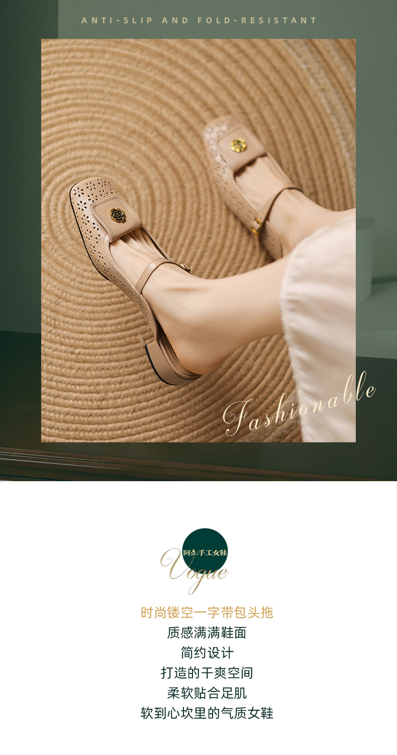 阿么手工女鞋山茶花真皮穆勒鞋粗跟3CM时尚包头一字带拖鞋女外穿