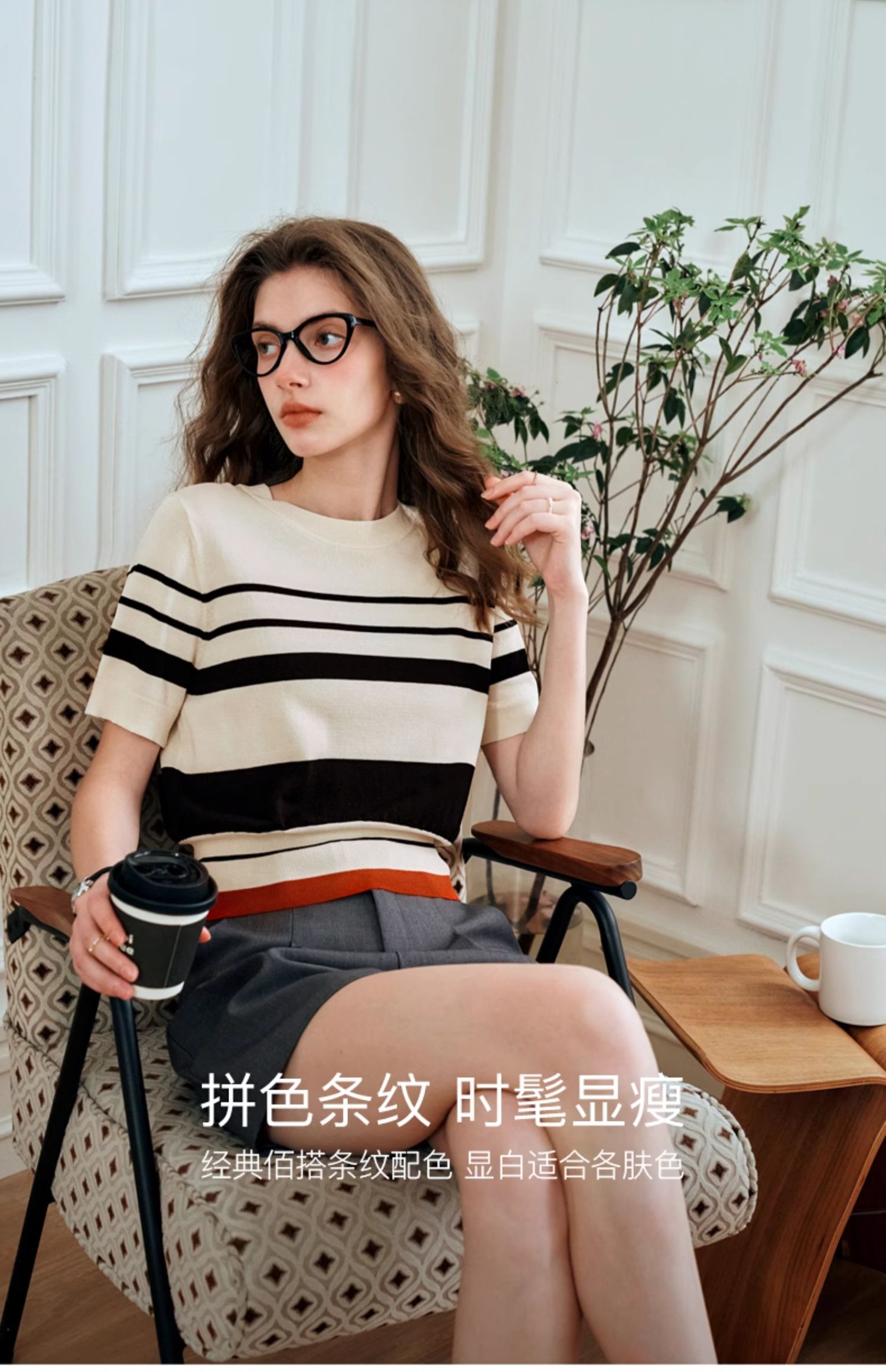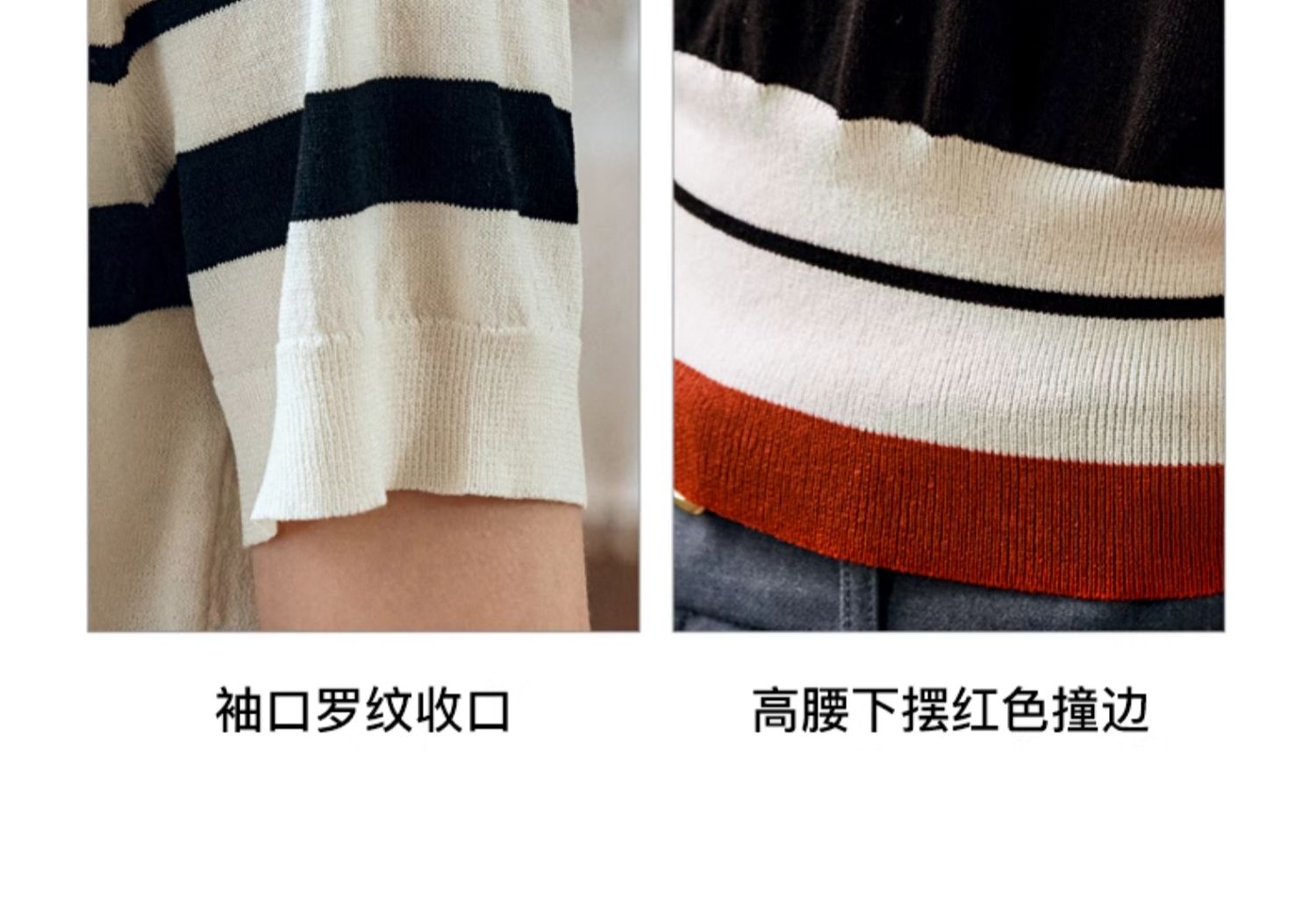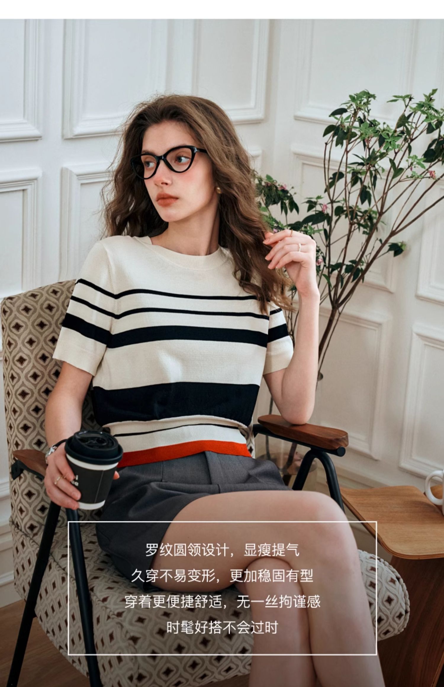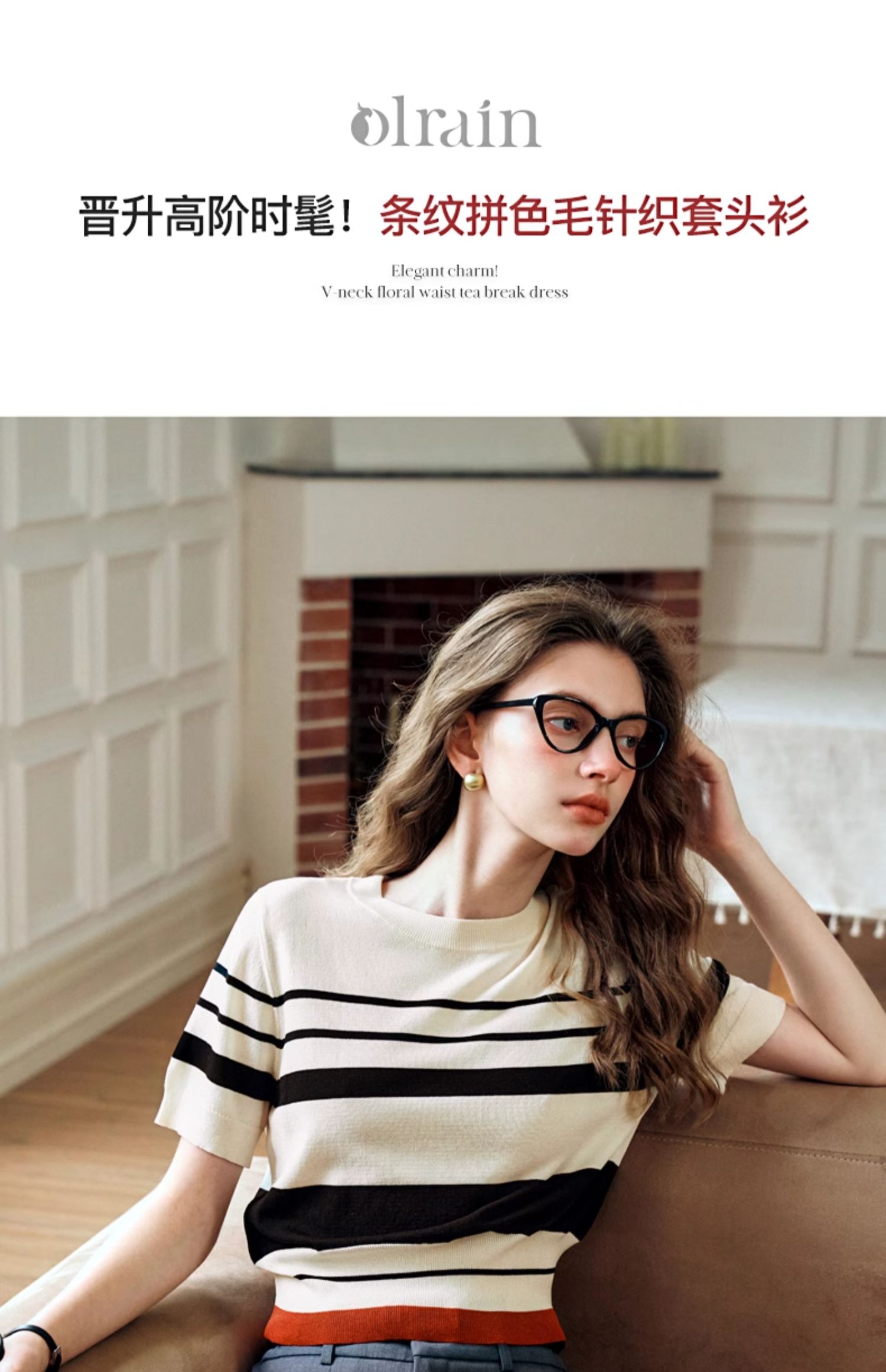 OLrain欧芮儿条纹针织衫女夏季2024年新款通勤拼色宽松圆领短袖
