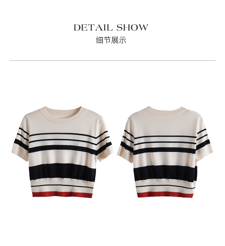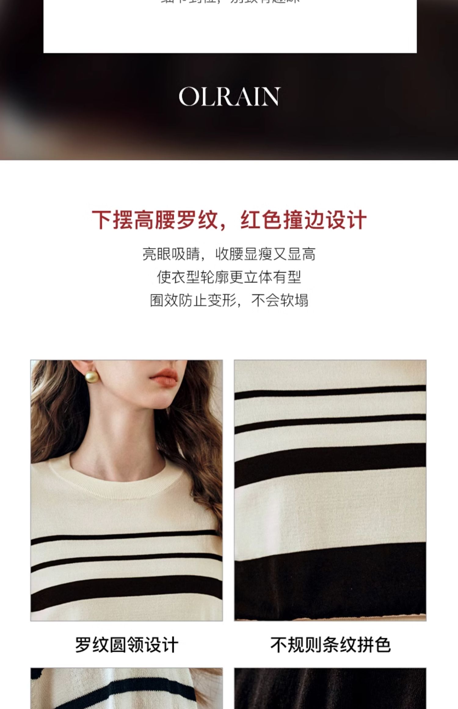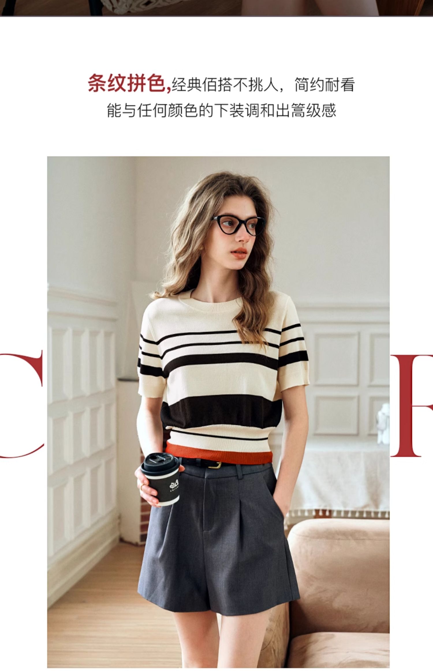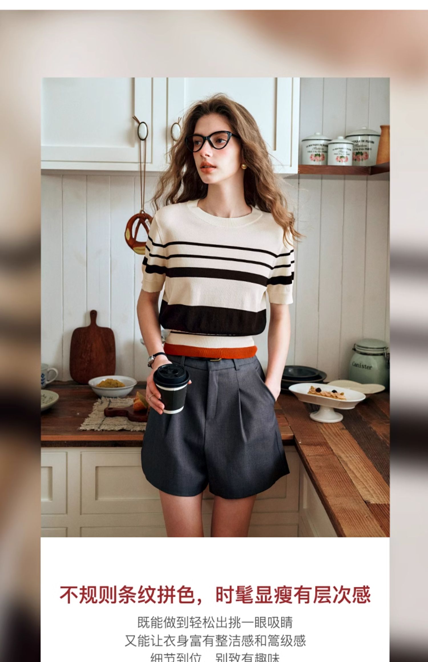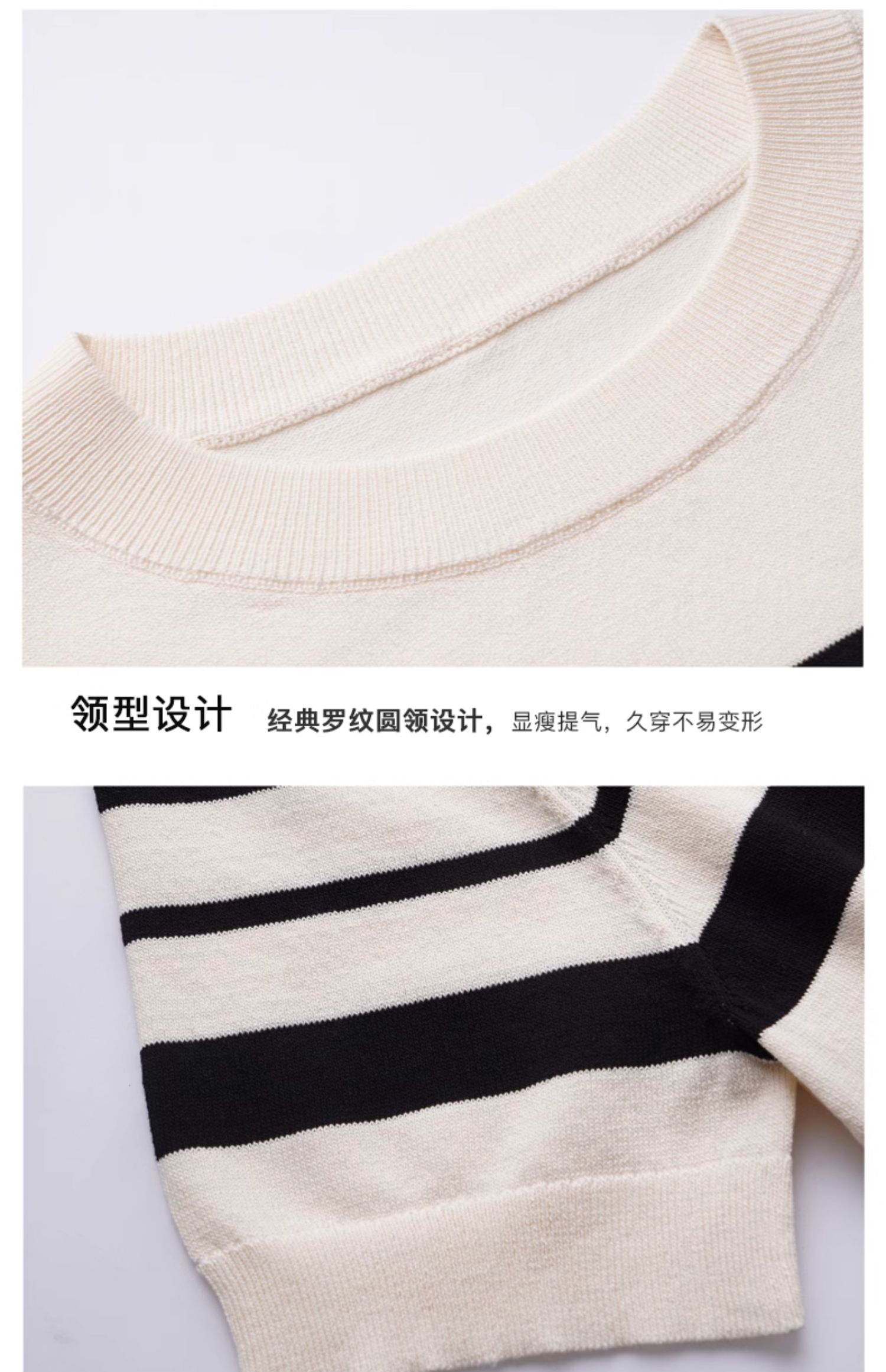 OLrain欧芮儿条纹针织衫女夏季2024年新款通勤拼色宽松圆领短袖