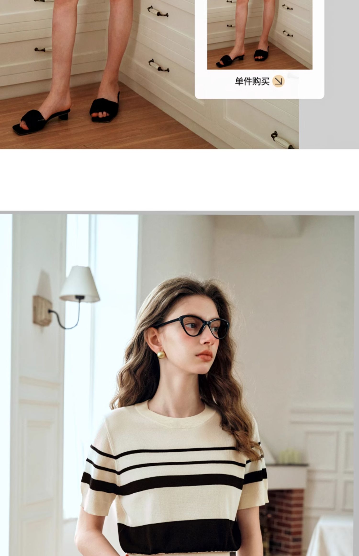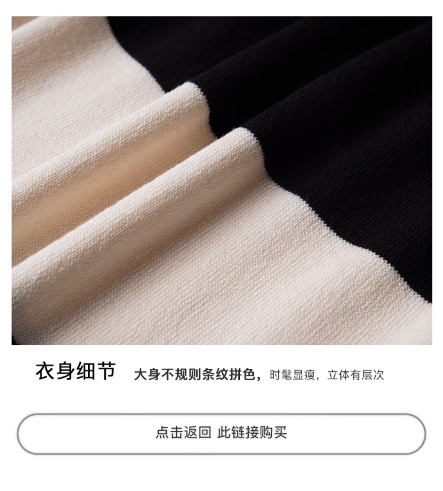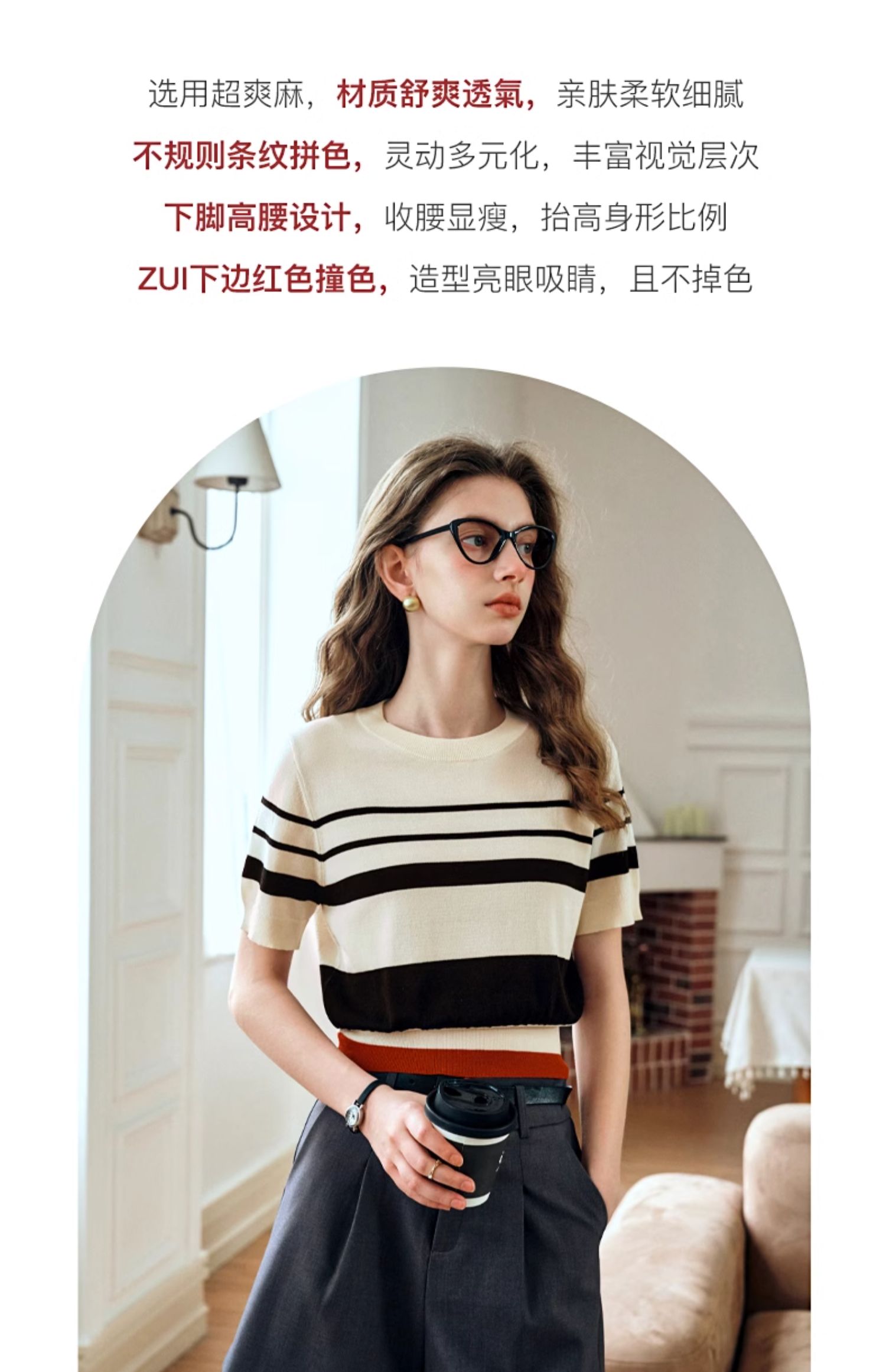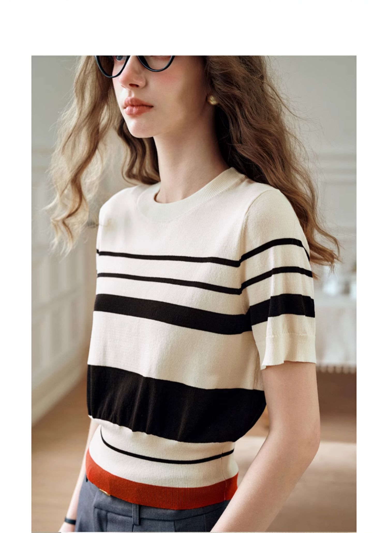 OLrain欧芮儿条纹针织衫女夏季2024年新款通勤拼色宽松圆领短袖