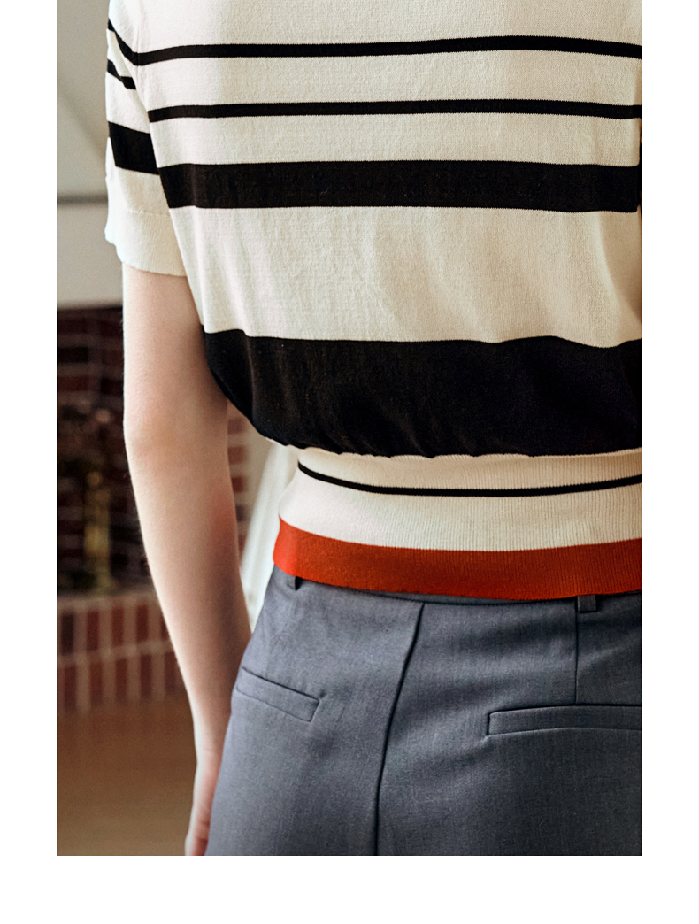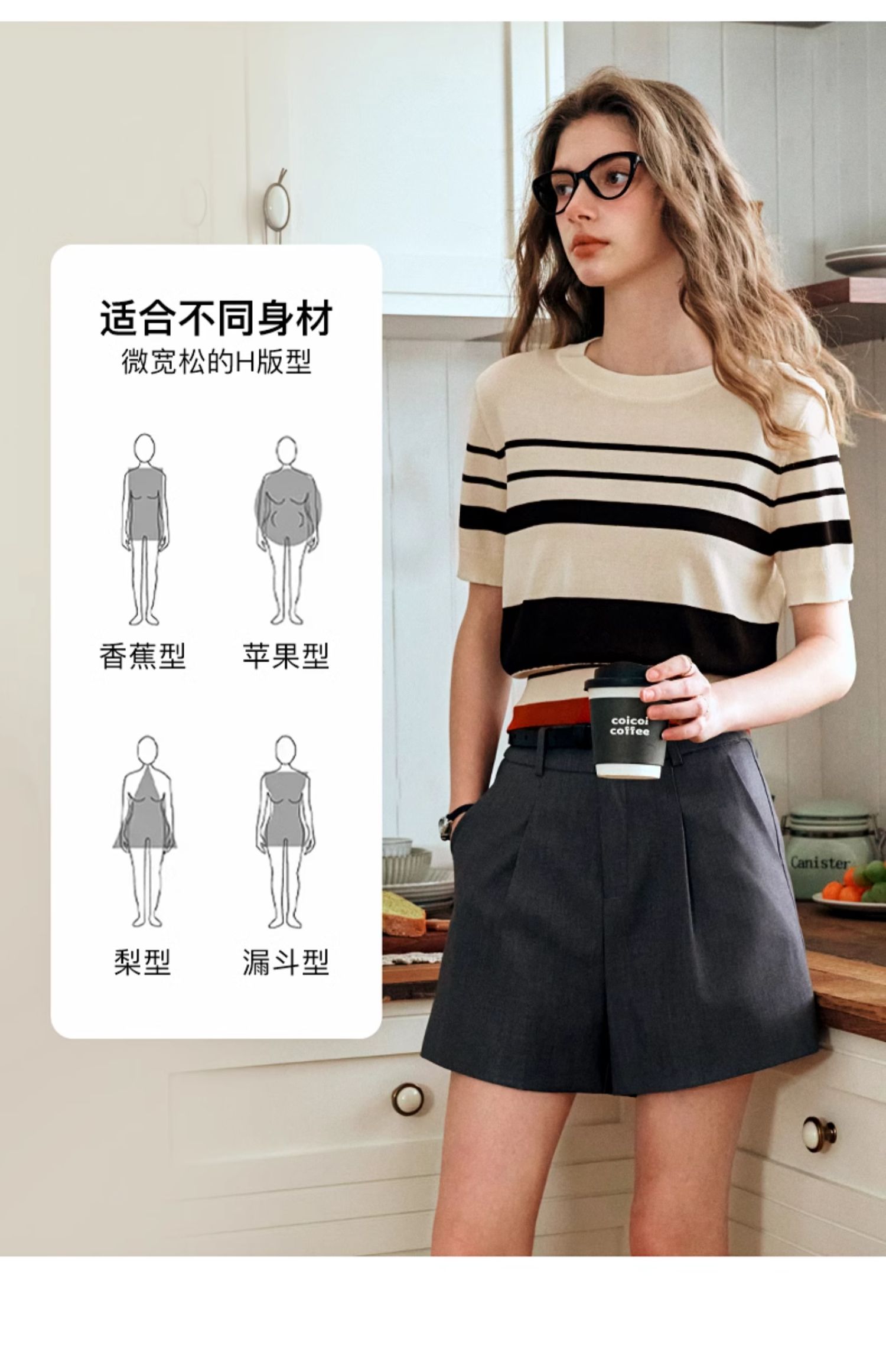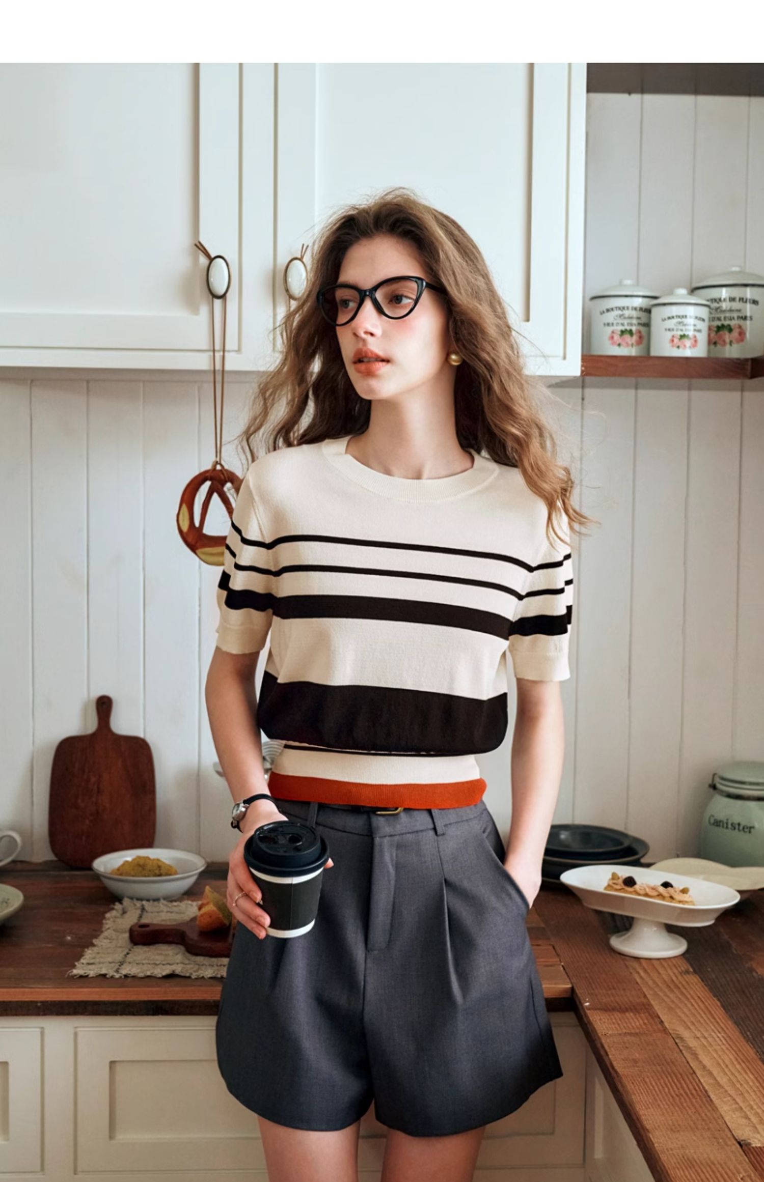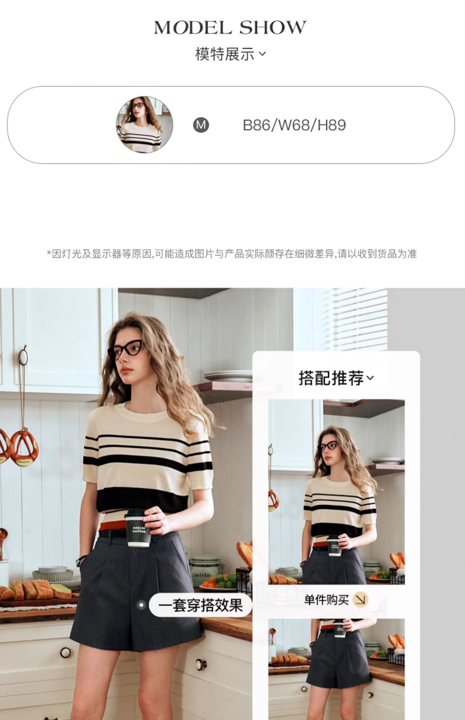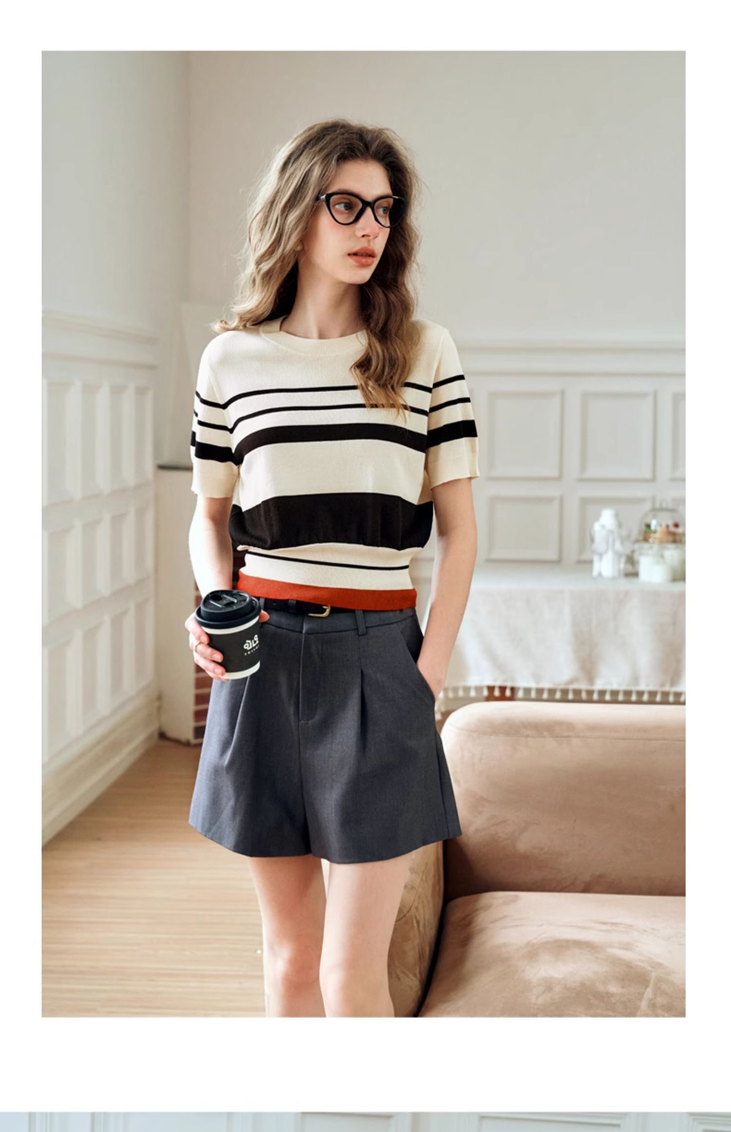 OLrain欧芮儿条纹针织衫女夏季2024年新款通勤拼色宽松圆领短袖