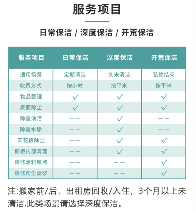 10、为保证服务质量,本服务不适用于学校、办公室、商铺、群租房、新房开荒、长期无人居住房、集体宿舍等类型的房屋保洁。此类服务请参考深度、开荒保洁服务项目。